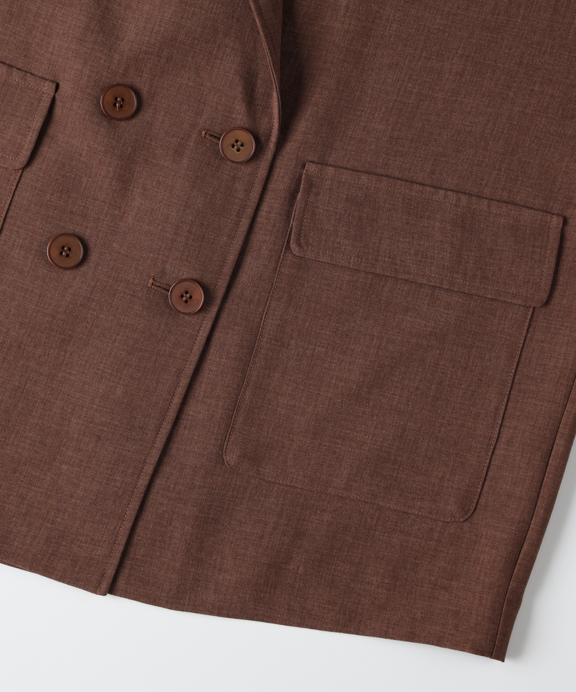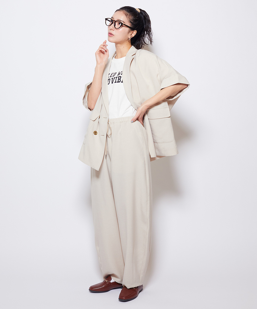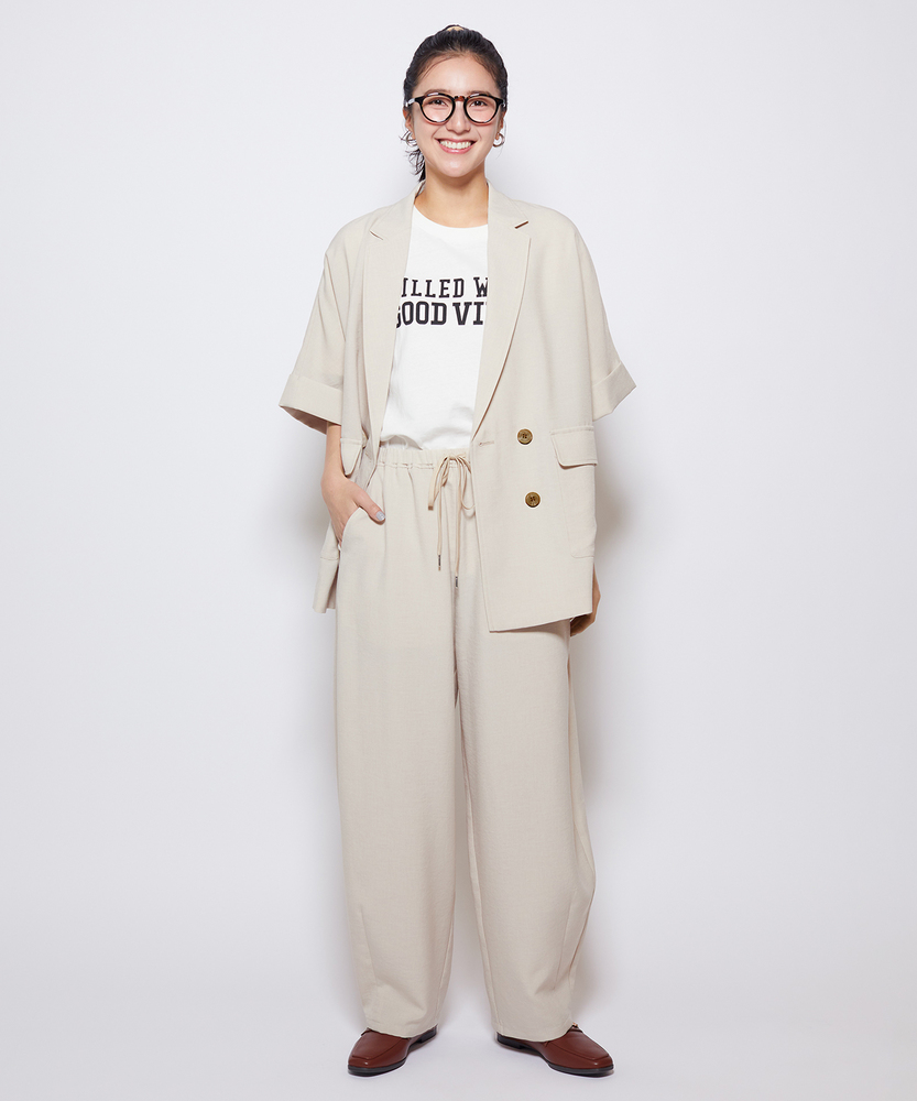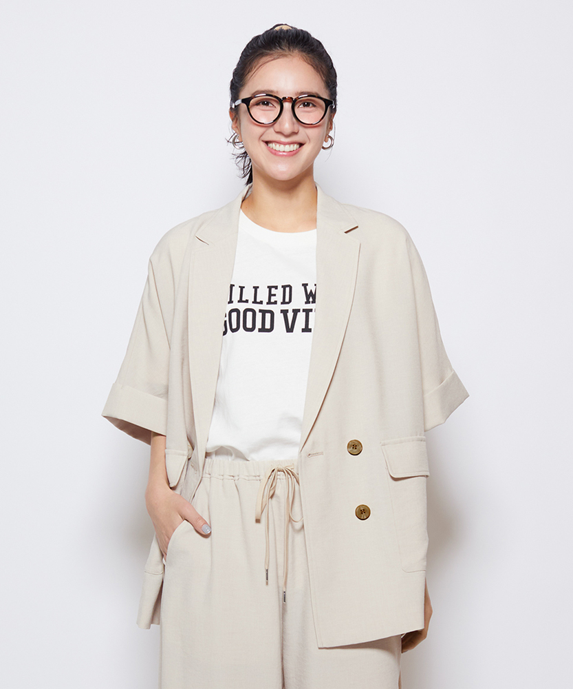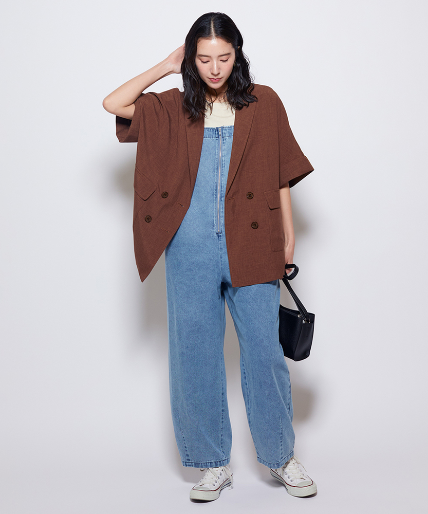 さっと羽織って、脱・無難。大人の「抜け感」ジャケット。二の腕を隠して、スタイルアップ。カーディガン感覚で使える軽やかさ。「きちんと」も「ラフ」も。オンオフ活躍する、ワードローブの新定番。■Point・二の腕すっきり「ハーフスリーブ」気になる二の腕をしっかりカバーする絶妙な袖丈。袖口を広めに設定することで、腕の華奢見え効果も。Tシャツ一枚では心許ない時の羽織りとして最適です。・大人の品格漂う「ダブルブレスト」クラシカルなダブルボタンが、コーデのアクセントに。マニッシュなデザインながら、短めの袖で女性らしさをプラス。羽織るだけで、いつものスタイルが洗練された印象へ。・身体が泳ぐ「リラックスシルエット」程よくゆとりを持たせた、ボクシーなライン。身体のラインを拾わず、ストレスフリーな着心地。インナーを選ばず、レイヤードもスムーズに決まります。・カーディガン感覚の「軽やかさ」ジャケット特有の堅苦しさを感じさせない、軽い仕上がり。冷房対策や、季節の変わり目の体温調節にも重宝します。気負わずデイリーに使える、頼れる一枚です。・こなれ感を演出する「袖口デザイン」袖口は折り返し仕様で、手元に表情をプラス。時計やブレスレットなどのアクセサリーも映えます。細部までこだわったディテールが、おしゃれ心をくすぐります。・さらりと快適な「ドライタッチ」見た目にも涼しげな、清涼感のある素材の表情。汗ばむ季節も肌に張り付かず、快適に過ごせます。シワになりにくい質感で、持ち運びにも便利。【仕様】テーラードジャケットのかっちり感を残しつつ、ハーフスリーブで軽やかに仕上げた一着です。ダブルブレストのクラシカルな表情と、ゆったりとしたオーバーサイズ気味のシルエットが、トレンド感のある「大人の抜け感」を演出。大きめのフラップポケットが実用性とデザインのアクセントを兼ね備えています。【素材】リネンのようなナチュラルな風合いと、ドライな肌触りを併せ持つ素材を使用しています。適度なハリ感がありながらも柔らかく、落ち感があるためシルエットが綺麗に出ます。通気性が良くさらりとしているので、春先から初秋までロングシーズン快適に着用いただけます。【スタイリング】ロゴTシャツにデニムやサロペットを合わせた、大人のカジュアルダウンスタイルがおすすめ。袖を通さず肩掛けすれば、こなれ感たっぷりの装いに。同系色のボトムスと合わせてセットアップ風に着こなせば、オフィスカジュアルやちょっとしたお出かけにも対応します。ワンピースの羽織りとしてもバランス良く決まります。 【セットアップで着用可能なアイテムはこちら】HR26102200011 【そよラク】コクーンパンツ/セットアップ対応