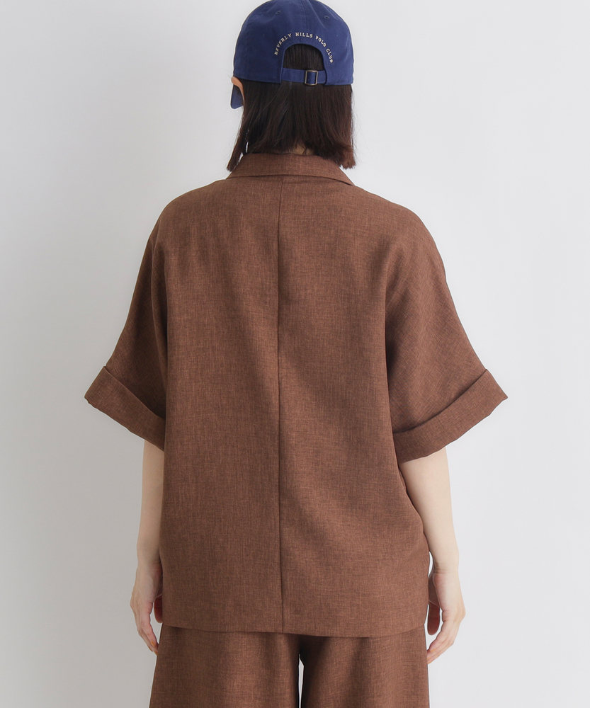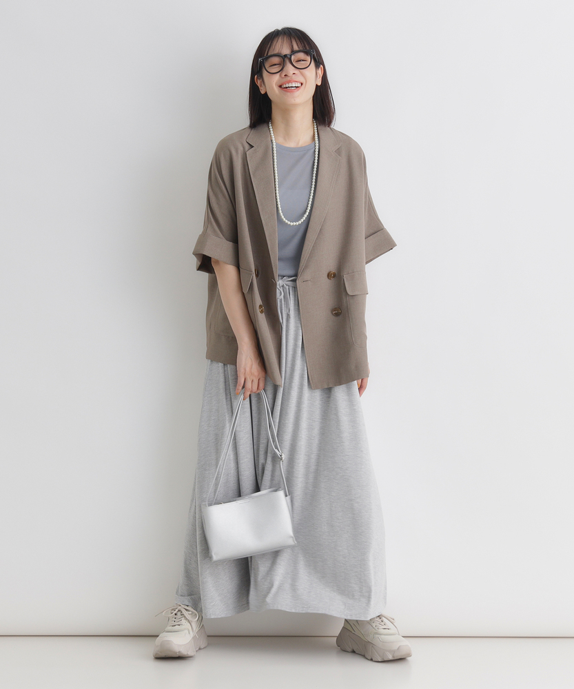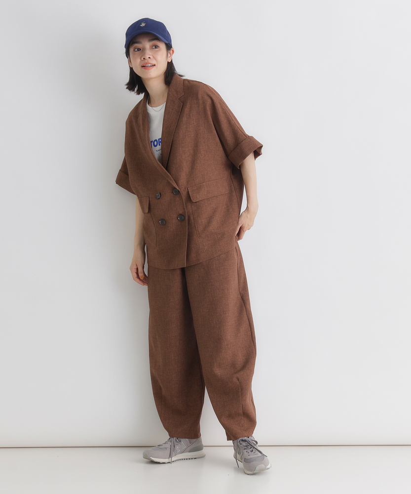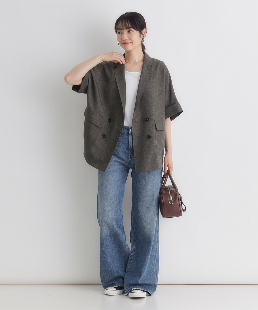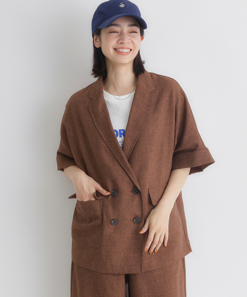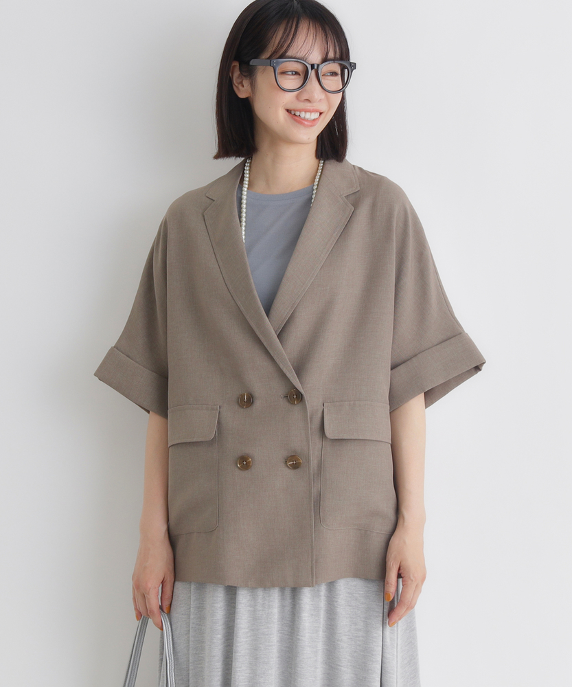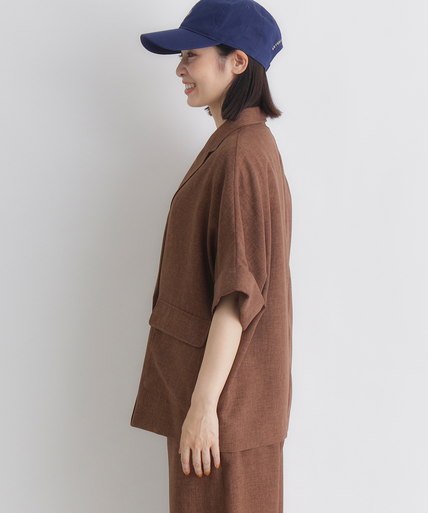さっと羽織って、脱・無難。大人の「抜け感」ジャケット。二の腕を隠して、スタイルアップ。カーディガン感覚で使える軽やかさ。「きちんと」も「ラフ」も。オンオフ活躍する、ワードローブの新定番。■Point・二の腕すっきり「ハーフスリーブ」気になる二の腕をしっかりカバーする絶妙な袖丈。袖口を広めに設定することで、腕の華奢見え効果も。Tシャツ一枚では心許ない時の羽織りとして最適です。・大人の品格漂う「ダブルブレスト」クラシカルなダブルボタンが、コーデのアクセントに。マニッシュなデザインながら、短めの袖で女性らしさをプラス。羽織るだけで、いつものスタイルが洗練された印象へ。・身体が泳ぐ「リラックスシルエット」程よくゆとりを持たせた、ボクシーなライン。身体のラインを拾わず、ストレスフリーな着心地。インナーを選ばず、レイヤードもスムーズに決まります。・カーディガン感覚の「軽やかさ」ジャケット特有の堅苦しさを感じさせない、軽い仕上がり。冷房対策や、季節の変わり目の体温調節にも重宝します。気負わずデイリーに使える、頼れる一枚です。・こなれ感を演出する「袖口デザイン」袖口は折り返し仕様で、手元に表情をプラス。時計やブレスレットなどのアクセサリーも映えます。細部までこだわったディテールが、おしゃれ心をくすぐります。・さらりと快適な「ドライタッチ」見た目にも涼しげな、清涼感のある素材の表情。汗ばむ季節も肌に張り付かず、快適に過ごせます。シワになりにくい質感で、持ち運びにも便利。【仕様】テーラードジャケットのかっちり感を残しつつ、ハーフスリーブで軽やかに仕上げた一着です。ダブルブレストのクラシカルな表情と、ゆったりとしたオーバーサイズ気味のシルエットが、トレンド感のある「大人の抜け感」を演出。大きめのフラップポケットが実用性とデザインのアクセントを兼ね備えています。【素材】リネンのようなナチュラルな風合いと、ドライな肌触りを併せ持つ素材を使用しています。適度なハリ感がありながらも柔らかく、落ち感があるためシルエットが綺麗に出ます。通気性が良くさらりとしているので、春先から初秋までロングシーズン快適に着用いただけます。【スタイリング】ロゴTシャツにデニムやサロペットを合わせた、大人のカジュアルダウンスタイルがおすすめ。袖を通さず肩掛けすれば、こなれ感たっぷりの装いに。同系色のボトムスと合わせてセットアップ風に着こなせば、オフィスカジュアルやちょっとしたお出かけにも対応します。ワンピースの羽織りとしてもバランス良く決まります。 【セットアップで着用可能なアイテムはこちら】HR26102200011 【そよラク】コクーンパンツ/セットアップ対応