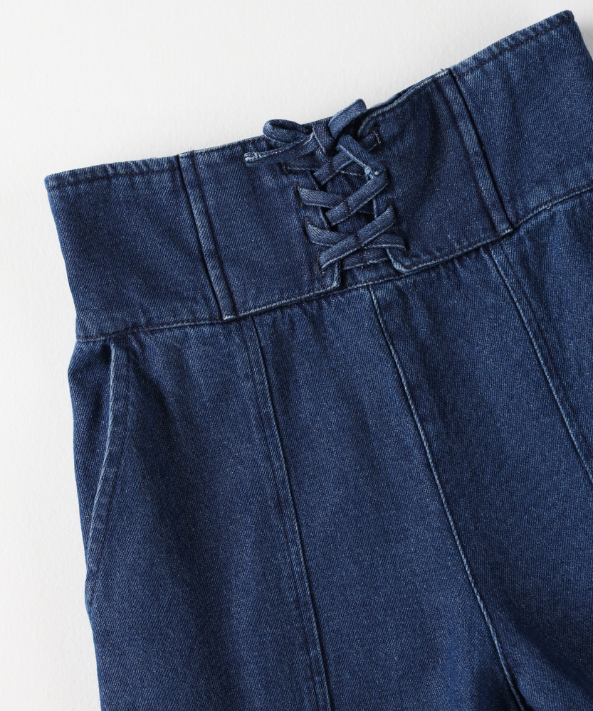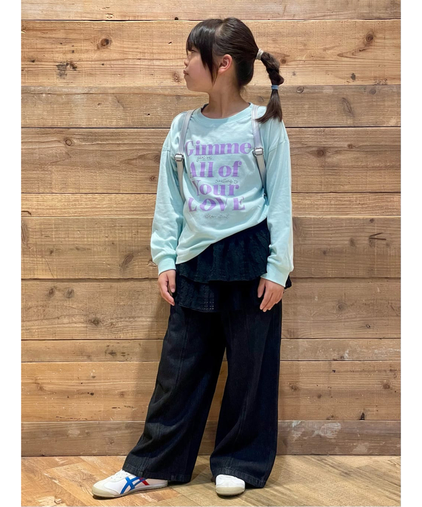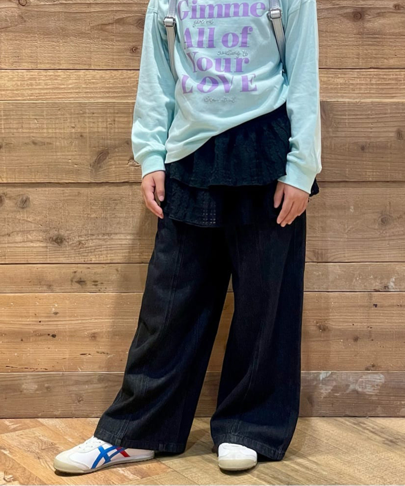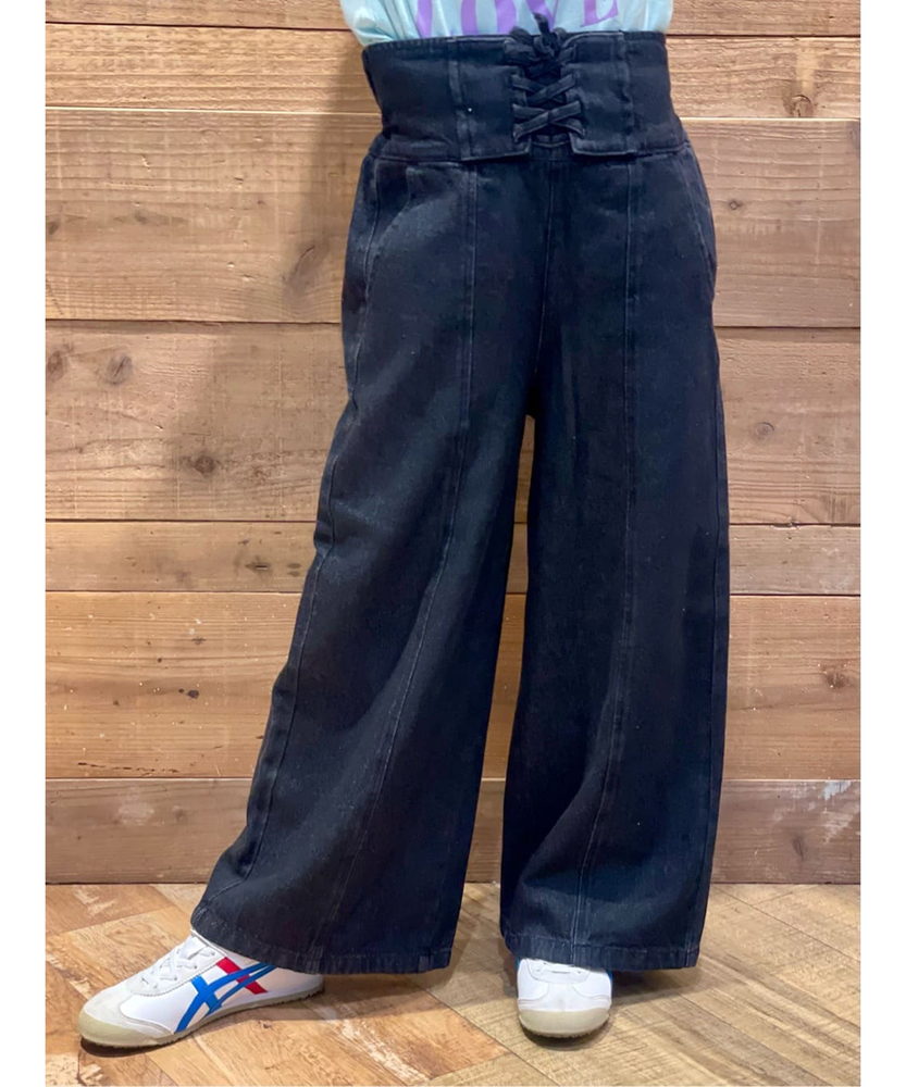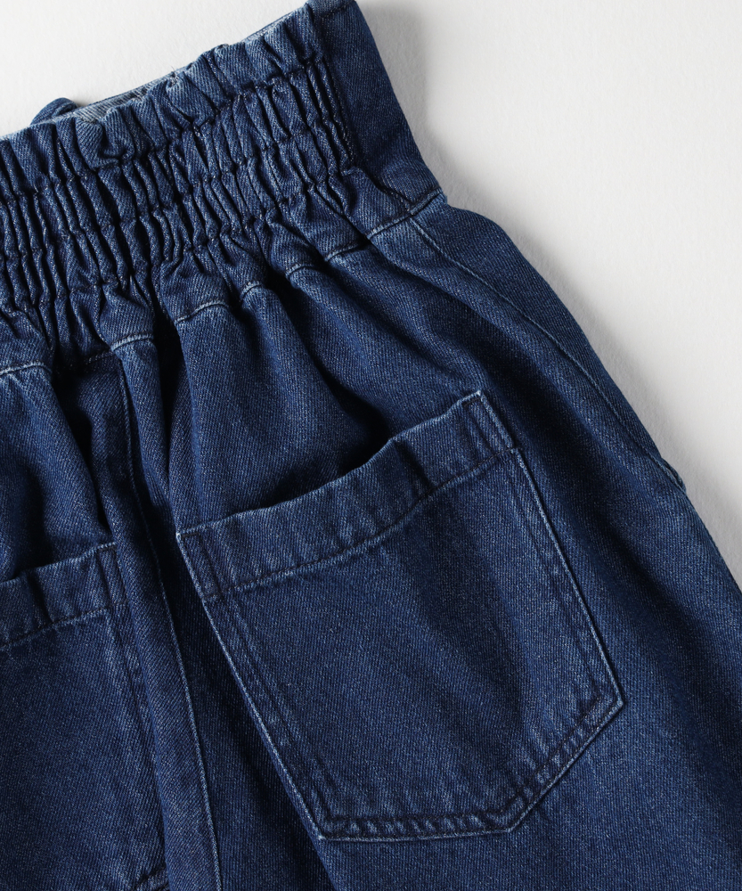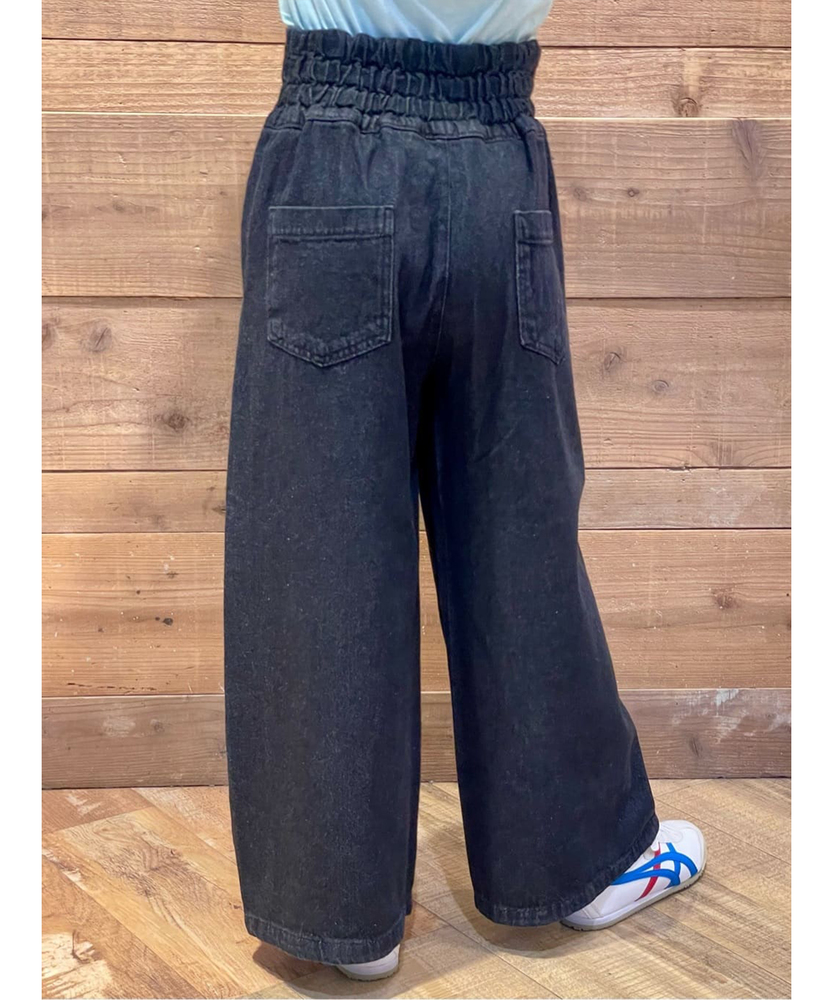 【仕様】ウエストのレースアップがポイントのレースアップワイドパンツ。トレンド感のあるデザインで、カジュアルながらもおしゃれな印象を与えます。ゆったりとしたシルエットが動きやすさを実現し、遊び心満載のアイテムです。【素材】 100%綿のデニム素材を使用しており、肌触りが良く、快適な着心地を提供。通気性に優れ、デイリーユースに最適な耐久性を兼ね備えています。洗濯後も型崩れしにくく、長く愛用できるアイテムです。 【スタイリング】 シンプルなTシャツやブラウスと合わせて、カジュアルなスタイルを楽しんで。スニーカーやサンダルを合わせることで、元気な印象に。お友達との遊びやお出かけにもぴったりのコーディネートが完成します。