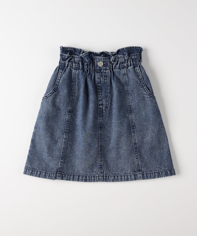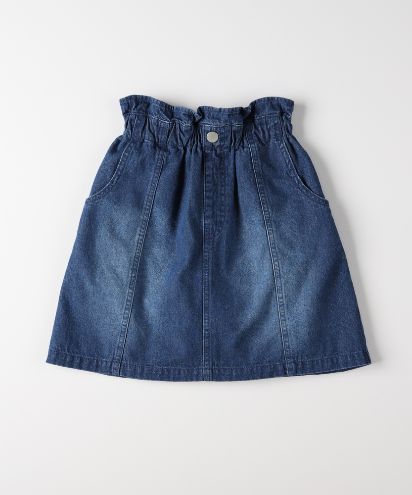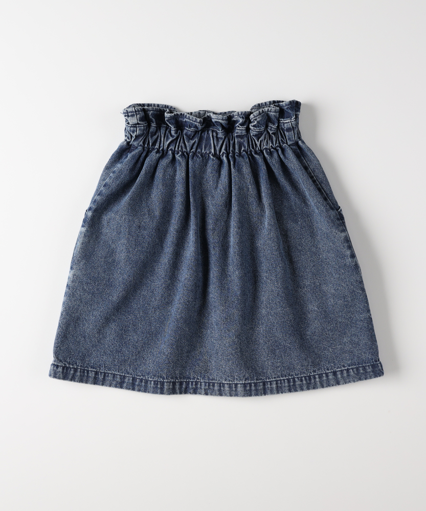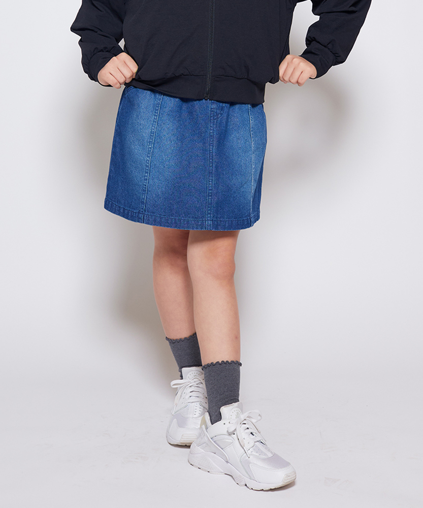 大人顔負けの可愛さ。着るだけでオシャレなウエストフリル。楽ちん&キュートなデニムスカート。トップスインが様になる。デイリーに使いたい主役級スカート。■Point・「イン」したくなるウエストフリルキュートなフリルが、いつものコーデを格上げします。トップスをインすれば、スタイルアップ効果も。・動きやすいAラインシルエット広がりすぎない絶妙なラインで、足さばきも抜群。元気いっぱい遊ぶ日も、可愛く快適に。・通園・通学に嬉しいポケット付きハンカチやティッシュも大切に持ち運べます。実用性もしっかり兼ね備えたデザインです。・こなれ感のあるウォッシュ加工程よい色落ちが、大人顔負けの雰囲気を演出。どんなトップスとも馴染む万能なカラーです。・シーズンレスで着回し自在夏はTシャツ、冬はレギンスと合わせて。一年中、ワードローブの強い味方になります。【仕様】ウエストのギャザーフリルが目を惹く、大人顔負けのデザインスカートです。フロントのメタルボタンと縦に入った切り替えラインが、すっきりとした印象を与えつつ、カジュアルな中にも上品さをプラス。広がりすぎない台形シルエットは、どんなトップスともバランスが取りやすく、毎日のコーディネートを楽しく彩ります。【素材】しっかりとした生地感ながらも、動きやすさを損なわないデニム素材を使用しています。程よい厚みがあり、元気なお子様のデイリーウェアとして安心して着用いただけます。使い込むほどに馴染んでいく風合いの変化も魅力のひとつ。季節を問わず長く愛用できる、頼れる一枚です。【スタイリング】ロゴTシャツやブラウスをウエストインして、フリルを引き立たせるスタイルがおすすめ。寒くなればタイツやレギンスを合わせたり、オーバーサイズのニットから裾をちらりと覗かせたりと、アレンジも自在です。スニーカーで元気に、ブーツで少しおませに、様々な表情を楽しんでいただけます。