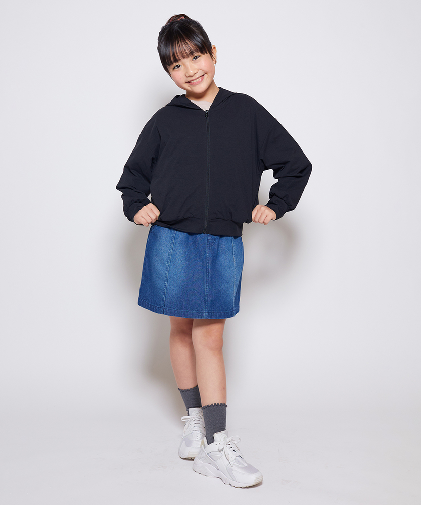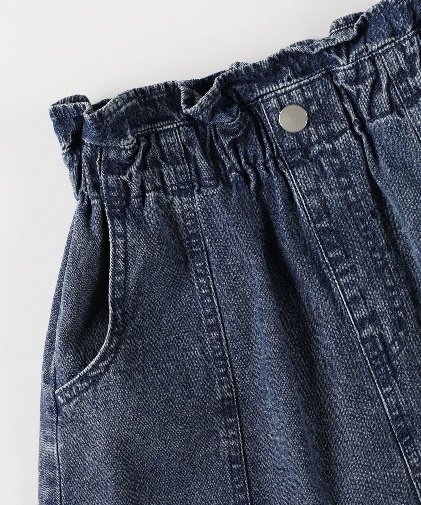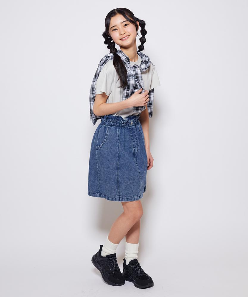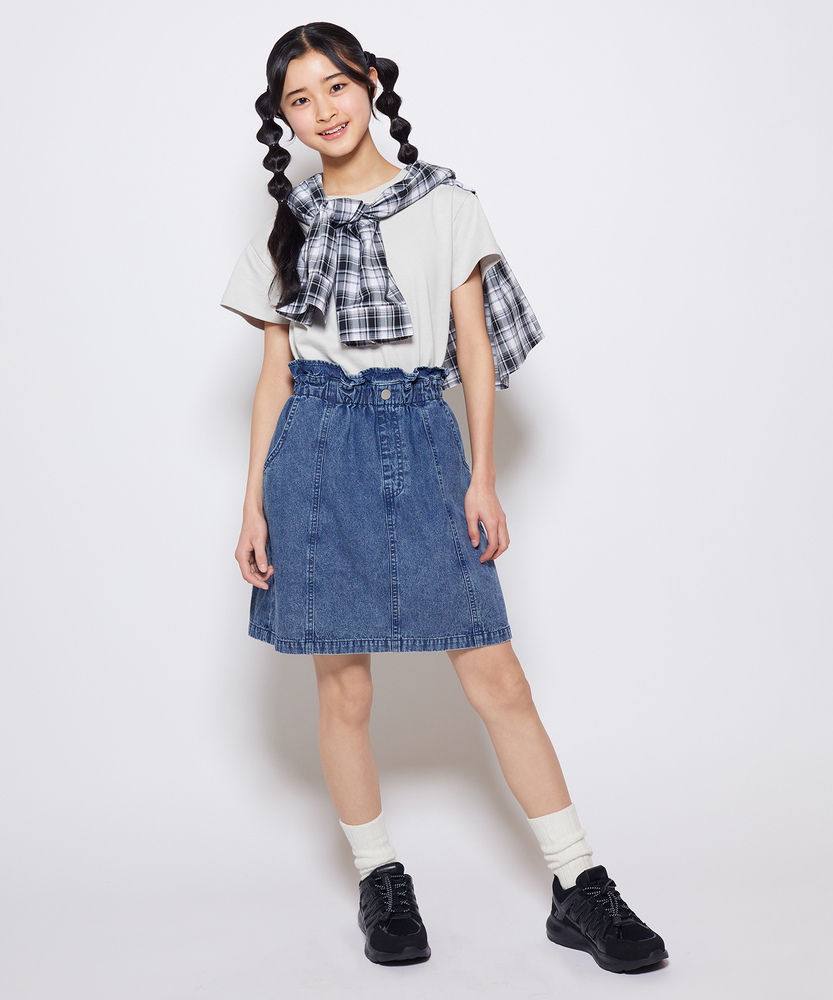 大人顔負けの可愛さ。着るだけでオシャレなウエストフリル。楽ちん&キュートなデニムスカート。トップスインが様になる。デイリーに使いたい主役級スカート。■Point・「イン」したくなるウエストフリルキュートなフリルが、いつものコーデを格上げします。トップスをインすれば、スタイルアップ効果も。・動きやすいAラインシルエット広がりすぎない絶妙なラインで、足さばきも抜群。元気いっぱい遊ぶ日も、可愛く快適に。・通園・通学に嬉しいポケット付きハンカチやティッシュも大切に持ち運べます。実用性もしっかり兼ね備えたデザインです。・こなれ感のあるウォッシュ加工程よい色落ちが、大人顔負けの雰囲気を演出。どんなトップスとも馴染む万能なカラーです。・シーズンレスで着回し自在夏はTシャツ、冬はレギンスと合わせて。一年中、ワードローブの強い味方になります。【仕様】ウエストのギャザーフリルが目を惹く、大人顔負けのデザインスカートです。フロントのメタルボタンと縦に入った切り替えラインが、すっきりとした印象を与えつつ、カジュアルな中にも上品さをプラス。広がりすぎない台形シルエットは、どんなトップスともバランスが取りやすく、毎日のコーディネートを楽しく彩ります。【素材】しっかりとした生地感ながらも、動きやすさを損なわないデニム素材を使用しています。程よい厚みがあり、元気なお子様のデイリーウェアとして安心して着用いただけます。使い込むほどに馴染んでいく風合いの変化も魅力のひとつ。季節を問わず長く愛用できる、頼れる一枚です。【スタイリング】ロゴTシャツやブラウスをウエストインして、フリルを引き立たせるスタイルがおすすめ。寒くなればタイツやレギンスを合わせたり、オーバーサイズのニットから裾をちらりと覗かせたりと、アレンジも自在です。スニーカーで元気に、ブーツで少しおませに、様々な表情を楽しんでいただけます。