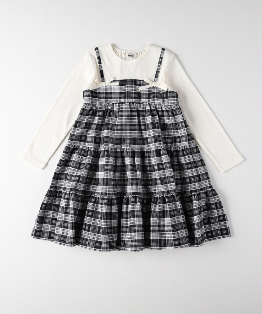 【仕様】チェックキャミソールレイヤード風ティアードワンピースは、可愛らしいティアードデザインが特徴です。リボン付きのキャミソール部分と、長袖のトップスが一体化したスタイルで、女の子らしさを引き立てます。【素材】 柔らかな素材を使用しており、快適な着心地を提供します。軽やかで動きやすく、遊びやすさを重視したデザインが魅力です。季節を問わず着用できるアイテムです。 【スタイリング】 シンプルな靴やスニーカーと合わせて、カジュアルで可愛らしいスタイルを楽しんで。アウターを羽織れば、寒い季節でも活躍する一着です。さまざまなシーンでのコーディネートが可能です。
