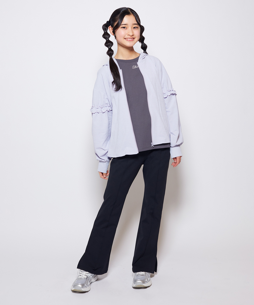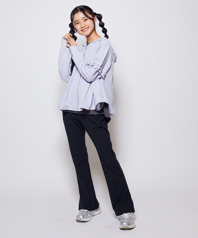 日差しから守って、可愛さもキープ。袖フリルが揺れる技ありパーカー。サッと羽織るだけで、紫外線対策とおしゃれを両立。通学も外遊びも。季節の変わり目に手放せない一枚。■Point・頼れる「UVカット機能」着るだけで手軽に紫外線対策が可能。デリケートなお子様の肌を日差しからガード。外遊びや通学時の必須アイテムです。・愛らしい「袖フリル」袖にあしらわれたフリルが程よい甘さをプラス。カジュアルになりすぎず、女の子らしい印象に。360度どこから見ても可愛いシルエットです。・体温調節に「ジップアップ」サッと羽織れて脱ぎ着が楽な前開きタイプ。朝晩の冷え込みや、室内の冷房対策にも最適。ランドセルを背負ったままでも扱いやすい。・持ち運べる「軽やかな素材」カバンに入れても嵩張らない薄手の生地感。旅行や遠足などの携帯用としても便利。シワになりにくく、気兼ねなく扱えます。・動きやすい「リラックスフィット」肩を落としたドロップショルダーでゆとりを確保。インナーを着込んでも動きを妨げません。活発なお子様の動きに優しく寄り添います。【仕様】ベーシックなジップパーカーをベースに、袖のフリルでトレンド感をミックスしました。ドロップショルダーのややゆったりとしたシルエットが、今っぽい抜け感を演出します。装飾を袖のみに抑えることで、甘くなりすぎず、ちょっと背伸びしたい年齢のお子様にもぴったりな大人可愛いデザインに仕上げました。【素材】さらりとした肌触りの素材を使用しています。汗ばむ季節でもベタつきにくく、素肌の上から羽織っても快適な着心地です。ご自宅で簡単にお洗濯ができるため、汚れを気にせずデイリーにガシガシ使っていただけます。薄手なので乾きが早いのも、忙しい親御様には嬉しいポイントです。【スタイリング】Tシャツ×デニムのシンプルコーデに羽織るだけで、一気に華やかなスタイルに。ショートパンツと合わせてアクティブに、ワンピースの上に羽織ってガーリーにと、どんなテイストにも馴染みます。ファスナーを閉めてトップス風に着こなすのもおすすめ。通学から休日のお出かけまで、幅広いシーンで活躍します。