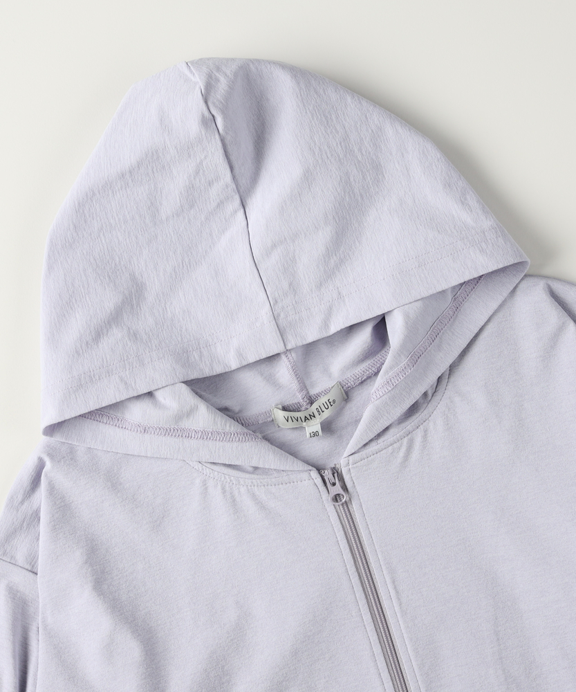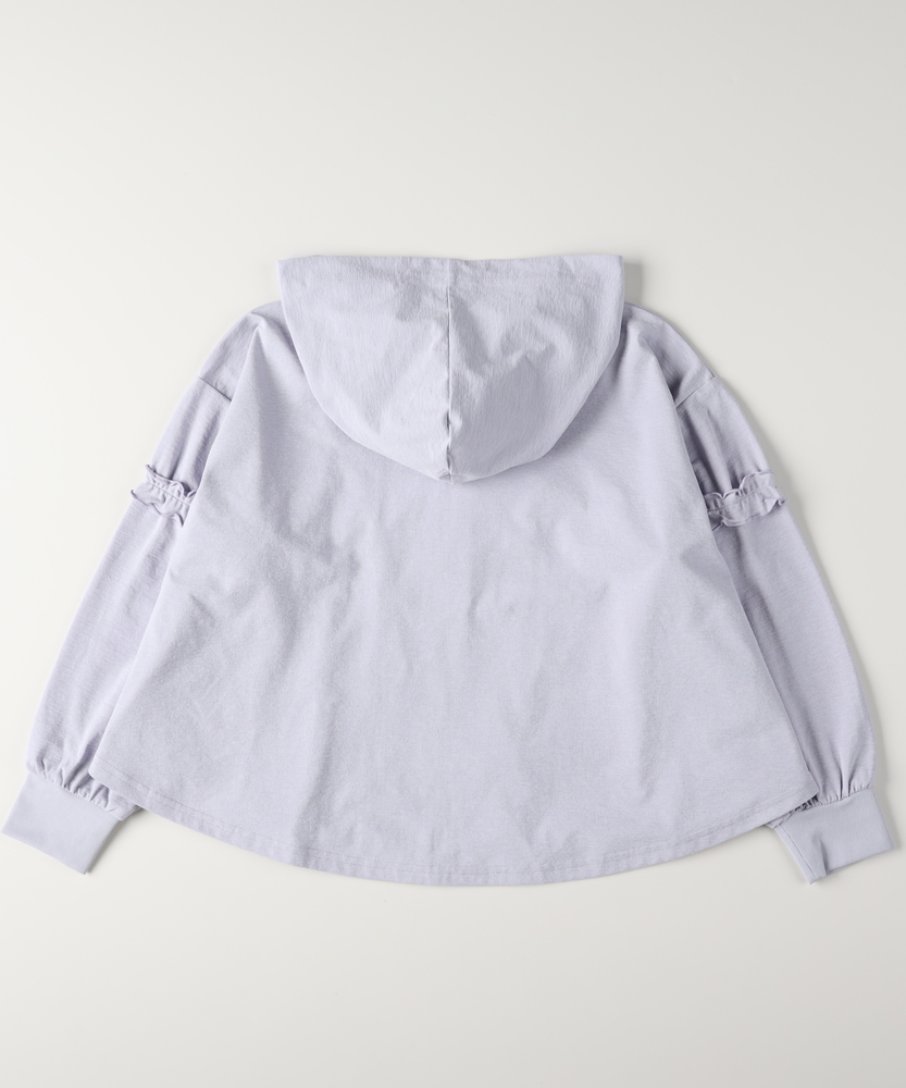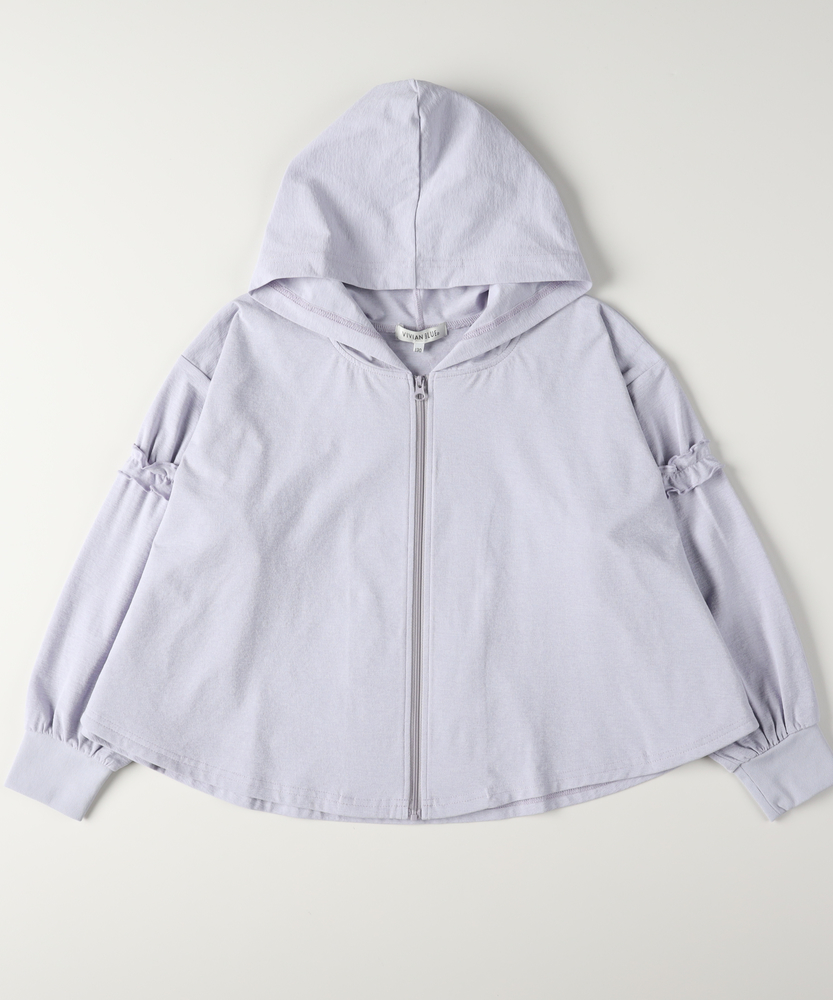日差しから守って、可愛さもキープ。袖フリルが揺れる技ありパーカー。サッと羽織るだけで、紫外線対策とおしゃれを両立。通学も外遊びも。季節の変わり目に手放せない一枚。■Point・頼れる「UVカット機能」着るだけで手軽に紫外線対策が可能。デリケートなお子様の肌を日差しからガード。外遊びや通学時の必須アイテムです。・愛らしい「袖フリル」袖にあしらわれたフリルが程よい甘さをプラス。カジュアルになりすぎず、女の子らしい印象に。360度どこから見ても可愛いシルエットです。・体温調節に「ジップアップ」サッと羽織れて脱ぎ着が楽な前開きタイプ。朝晩の冷え込みや、室内の冷房対策にも最適。ランドセルを背負ったままでも扱いやすい。・持ち運べる「軽やかな素材」カバンに入れても嵩張らない薄手の生地感。旅行や遠足などの携帯用としても便利。シワになりにくく、気兼ねなく扱えます。・動きやすい「リラックスフィット」肩を落としたドロップショルダーでゆとりを確保。インナーを着込んでも動きを妨げません。活発なお子様の動きに優しく寄り添います。【仕様】ベーシックなジップパーカーをベースに、袖のフリルでトレンド感をミックスしました。ドロップショルダーのややゆったりとしたシルエットが、今っぽい抜け感を演出します。装飾を袖のみに抑えることで、甘くなりすぎず、ちょっと背伸びしたい年齢のお子様にもぴったりな大人可愛いデザインに仕上げました。【素材】さらりとした肌触りの素材を使用しています。汗ばむ季節でもベタつきにくく、素肌の上から羽織っても快適な着心地です。ご自宅で簡単にお洗濯ができるため、汚れを気にせずデイリーにガシガシ使っていただけます。薄手なので乾きが早いのも、忙しい親御様には嬉しいポイントです。【スタイリング】Tシャツ×デニムのシンプルコーデに羽織るだけで、一気に華やかなスタイルに。ショートパンツと合わせてアクティブに、ワンピースの上に羽織ってガーリーにと、どんなテイストにも馴染みます。ファスナーを閉めてトップス風に着こなすのもおすすめ。通学から休日のお出かけまで、幅広いシーンで活躍します。