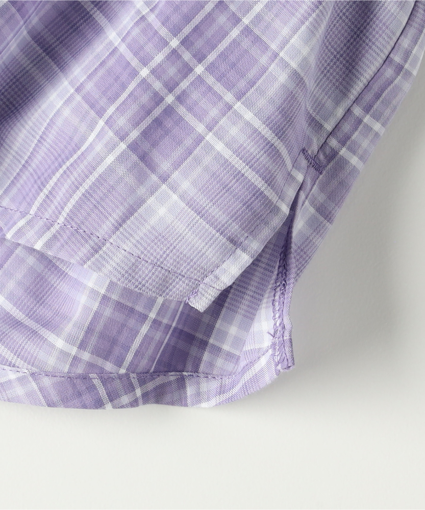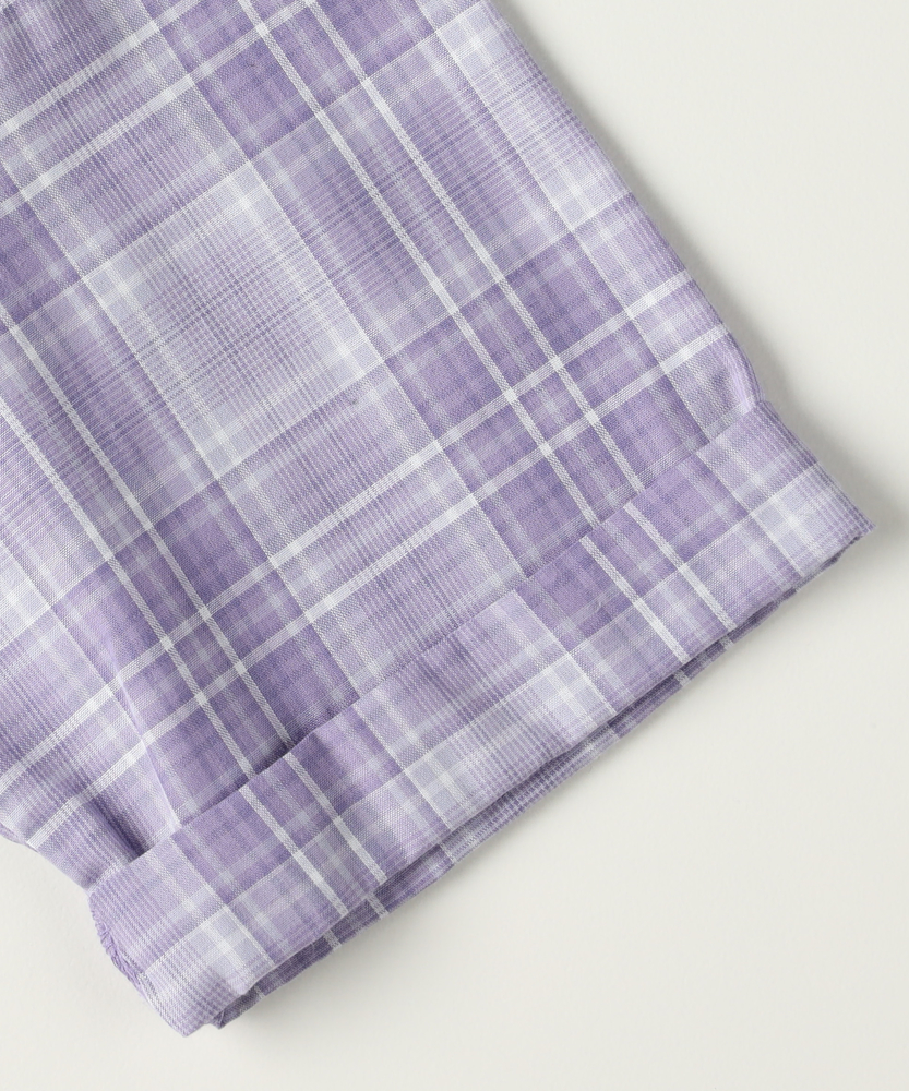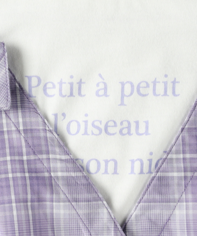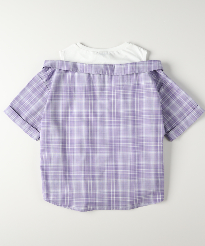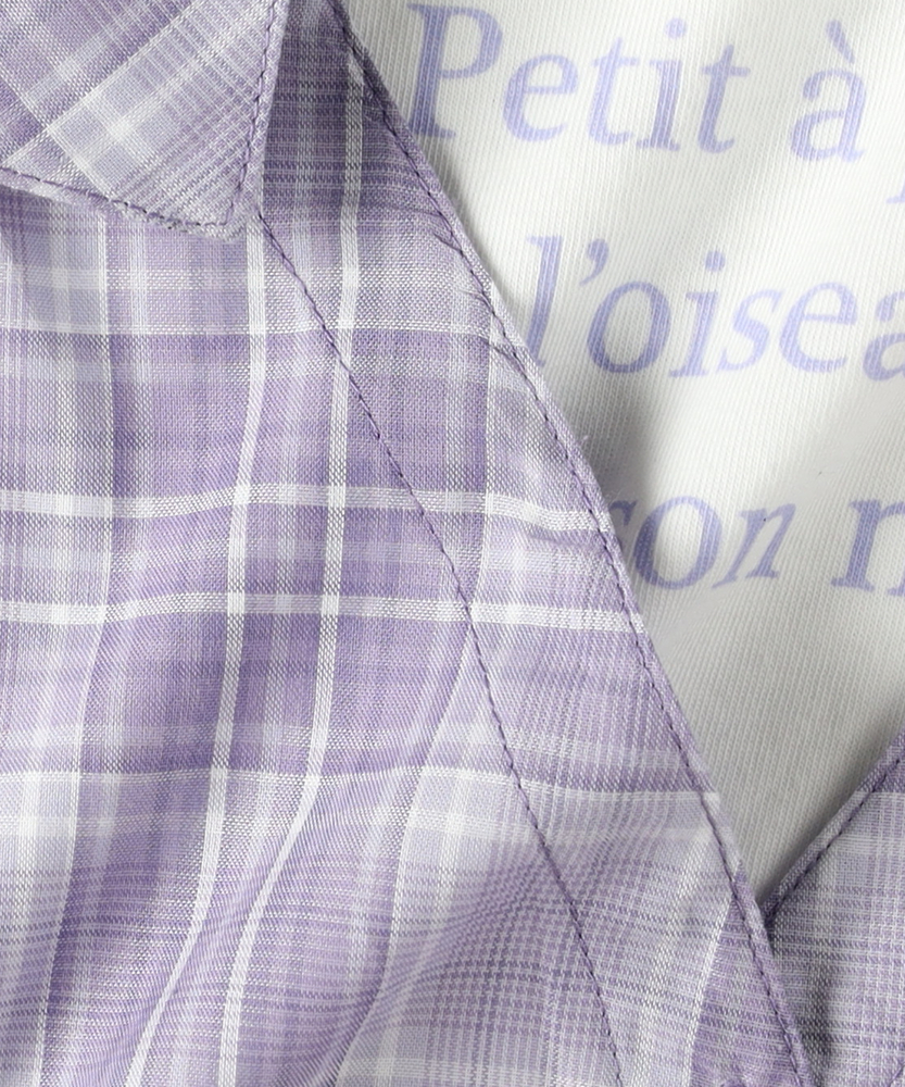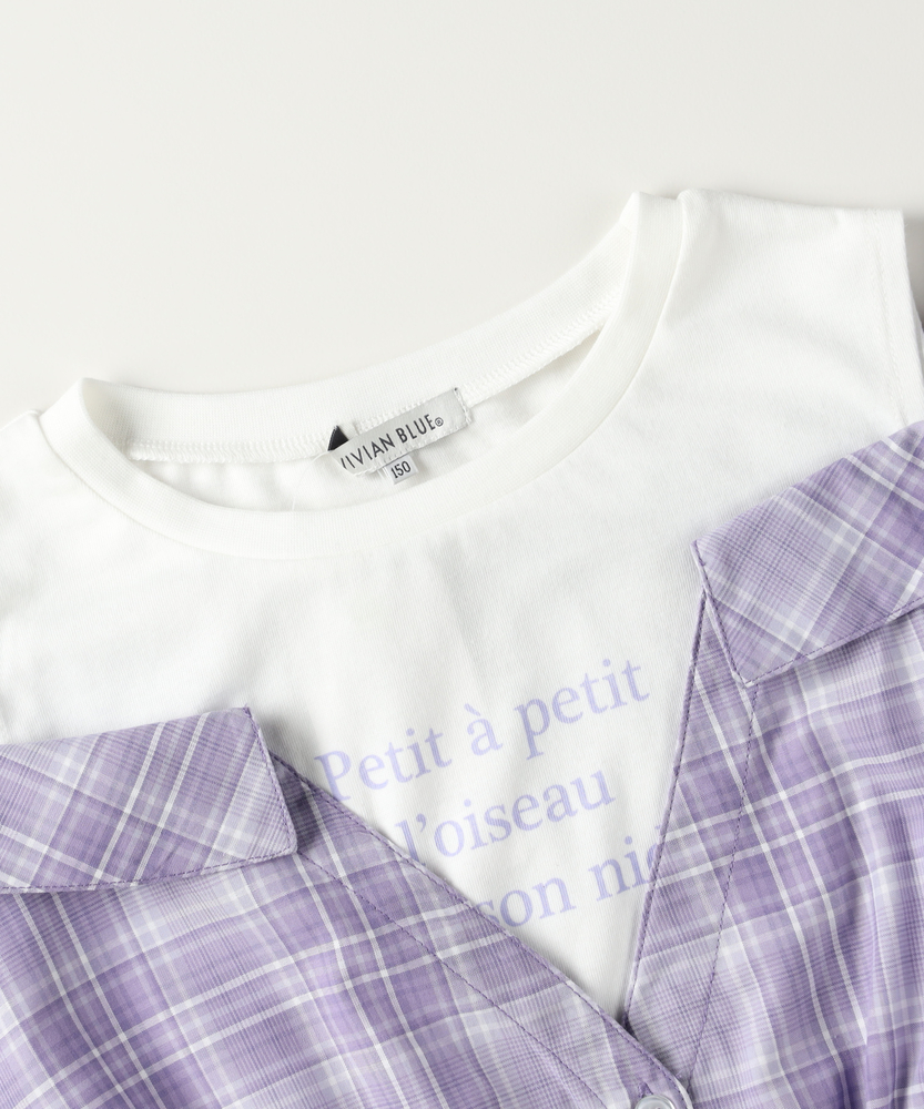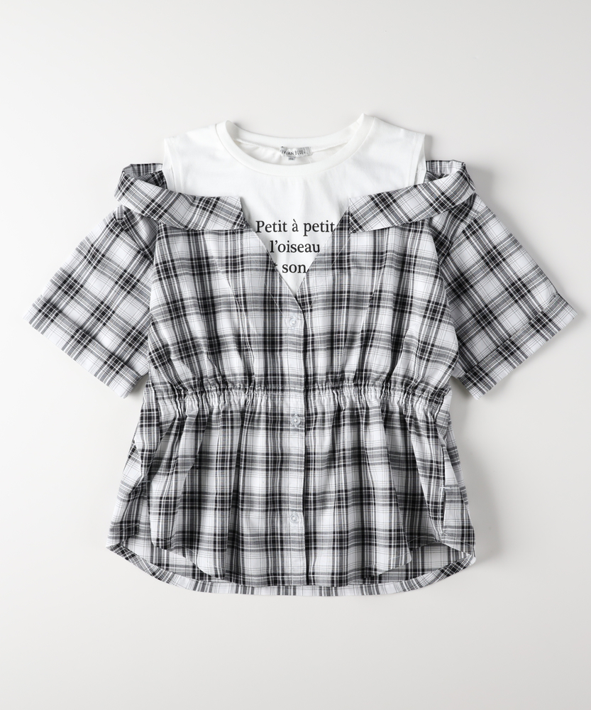 計算された重ね着風デザイン。着崩れ知らずの「フェイクレイヤード」。朝の準備もこれ1枚で解決。ヘルシーな肩見せで、夏のおしゃれをリードする主役級シャツ。■Point・1枚で完結「技ありレイヤード」インナーとシャツが一体化したドッキング仕様。重ね着の「もたつき」や「着崩れ」がなく、涼しく快適です。・スタイル良く見える「ウエストギャザー」キュッと絞ったウエストラインでメリハリをプラス。締め付け感がなく、脱ぎ着もラクラクです。・視線を集める「胸元ロゴ」インナー部分に施されたロゴがアクセント。シンプルな中に知的な可愛らしさを添えています。・爽やかで上品な「チェック柄」カジュアルさと清潔感を兼ね備えたチェックパターン。パープルやモノトーンなど、甘すぎないカラーリングも魅力です。・動きやすくて「ケアも簡単」デイリーに使いやすい、さらりとした素材感。お洗濯後も乾きやすく、通学コーデの強い味方です。【仕様】まるでTシャツとオフショルダーシャツを重ね着しているかのような、凝ったデザインが魅力のトップスです。計算された肩の開き具合が、可愛さを演出。ウエストのシャーリングが自然なフレアシルエットを作り出し、パンツスタイルでもスカートでもバランスよく決まります。【素材】肌に触れるインナー部分は着心地の良い素材、シャツ部分はさらりとした素材を使用しています。実際の重ね着よりも通気性が良く、暑い日でも涼しく過ごせるのがフェイクレイヤードの嬉しいポイント。シワになりにくい質感で、元気いっぱい遊ぶお子様にも安心です。【スタイリング】デザイン性が高いので、ボトムスはシンプルでも十分おしゃれに決まります。デニムのショートパンツやスキニーパンツを合わせてアクティブに、あるいはミニスカートを合わせてガーリーにと、幅広いスタイリングが可能。足元はスポーティなサンダルやスニーカーでハズすのもおすすめ。