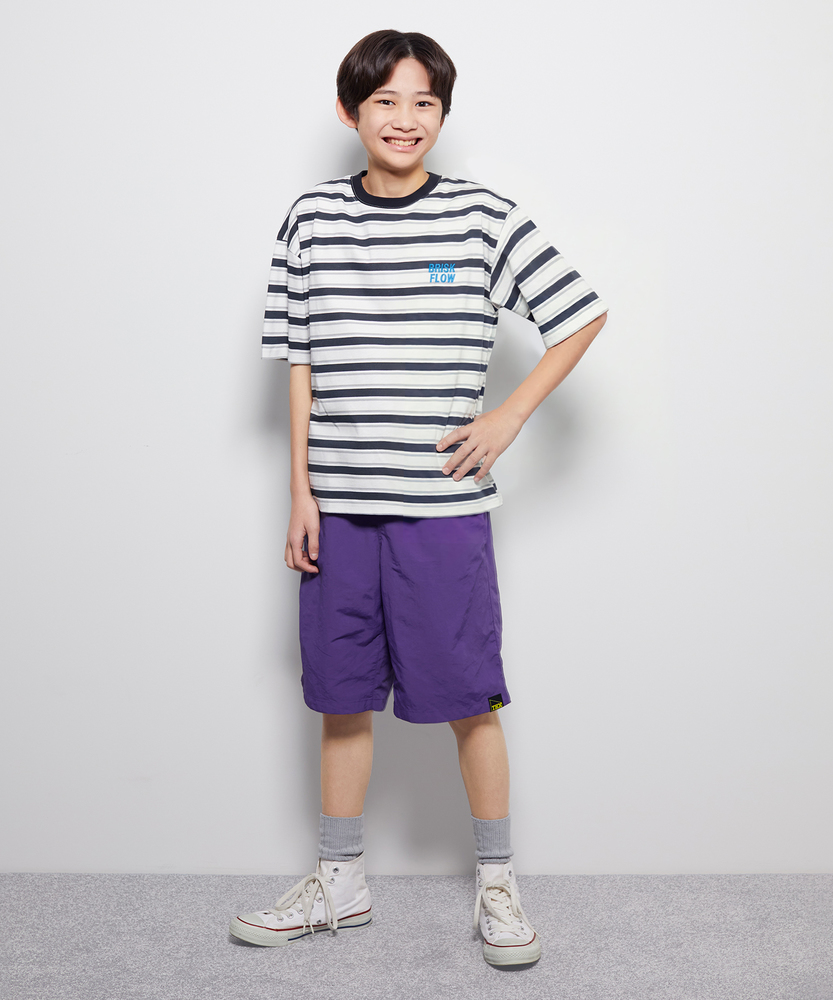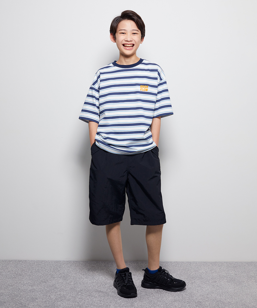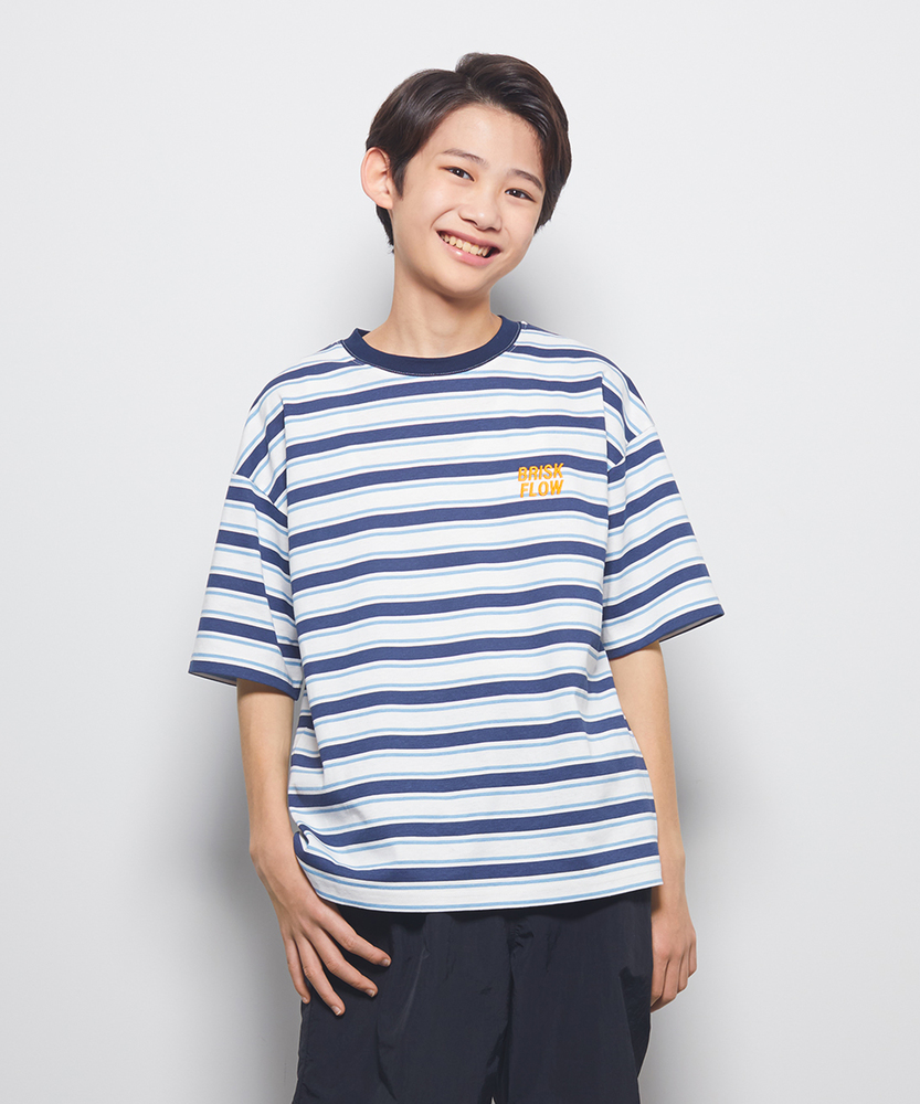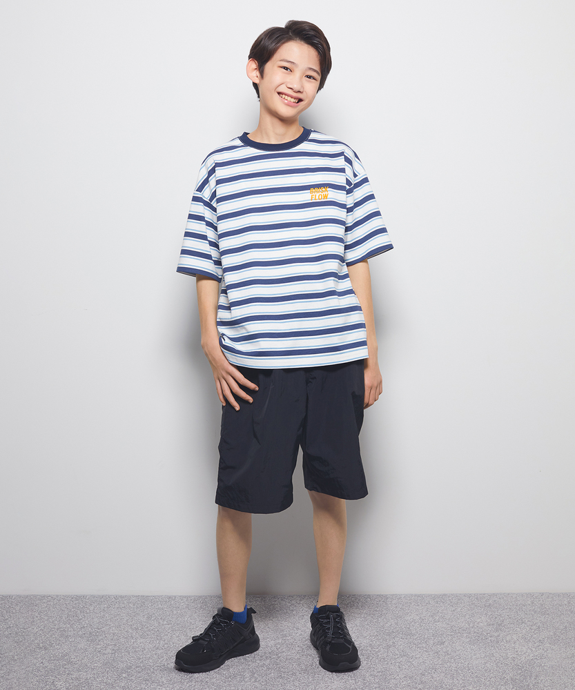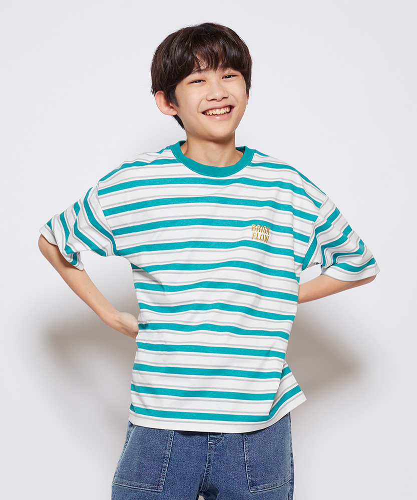 大人顔負けの配色センスで、毎日をおしゃれに。■Point・リズム感のあるマルチボーダー太さの異なるラインを組み合わせた柄。単調にならず、1枚で奥行きのある表情に。・今っぽい「ゆるシルエット」肩の落ちたドロップショルダーを採用。着るだけでトレンドの抜け感を演出します。・胸元のロゴがアクセント左胸に配置された英字プリントがポイント。視線が上がり、すっきりとした印象に。・汗ばむ季節も快適な肌触り素肌に触れても心地よいやわらかな質感。元気に走り回るお子様もストレスフリー。・首元の配色リンガーネックラインの色を切り替えたデザイン。顔周りを引き締め、メリハリをプラス。・通学から休日まで大活躍丈夫でガシガシ洗えるタフな仕上がり。デイリーウェアとして気兼ねなく使えます。【仕様】幅の異なるラインを組み合わせた、遊び心あふれるマルチボーダーTシャツです。ただの横縞ではなくリズム感のある配色にすることで、子供っぽくなりすぎず、大人顔負けの洗練された雰囲気に仕上げました。身幅にゆとりを持たせたリラックスシルエットは風通しも良く、リラックスした着心地とおしゃれさを両立しています。【素材】適度な厚みがありながらも、ふんわりとしたやわらかな肌触りのカットソー素材を使用しています。吸水性にも優れているため、汗をかきやすい季節でもベタつきにくく、サラッとした着心地をキープ。洗濯を繰り返しても型崩れしにくいしっかりとした生地感で、毎日の相棒として長く愛用いただけます。【スタイリング】柄にインパクトがあるため、ボトムスはシンプルなデニムやチノパン、無地のショートパンツと合わせるだけでコーディネートが決まります。キャップやスニーカーと合わせてスポーティーにまとめるのはもちろん、あえて少し大きめサイズを選んで、よりルーズに着こなすのもおすすめ。