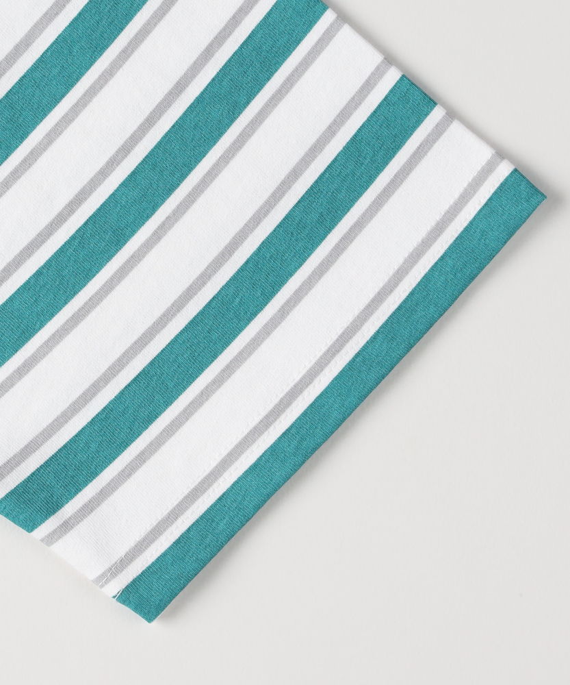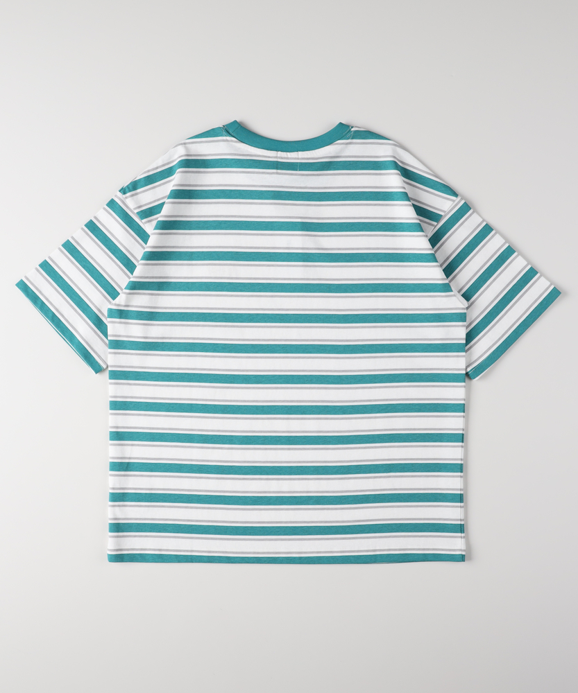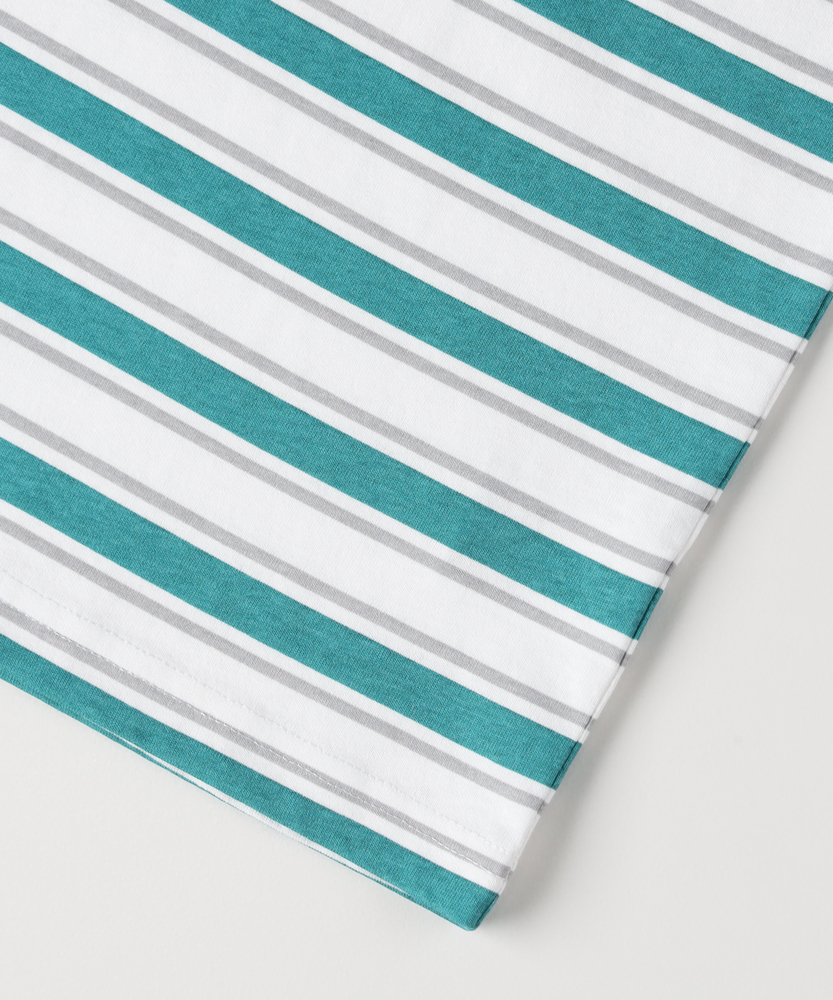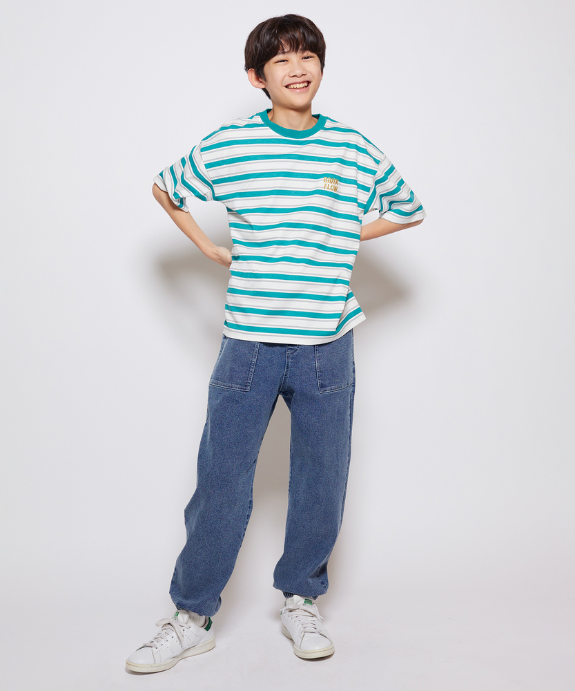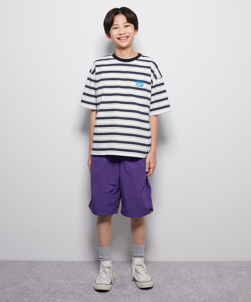 大人顔負けの配色センスで、毎日をおしゃれに。■Point・リズム感のあるマルチボーダー太さの異なるラインを組み合わせた柄。単調にならず、1枚で奥行きのある表情に。・今っぽい「ゆるシルエット」肩の落ちたドロップショルダーを採用。着るだけでトレンドの抜け感を演出します。・胸元のロゴがアクセント左胸に配置された英字プリントがポイント。視線が上がり、すっきりとした印象に。・汗ばむ季節も快適な肌触り素肌に触れても心地よいやわらかな質感。元気に走り回るお子様もストレスフリー。・首元の配色リンガーネックラインの色を切り替えたデザイン。顔周りを引き締め、メリハリをプラス。・通学から休日まで大活躍丈夫でガシガシ洗えるタフな仕上がり。デイリーウェアとして気兼ねなく使えます。【仕様】幅の異なるラインを組み合わせた、遊び心あふれるマルチボーダーTシャツです。ただの横縞ではなくリズム感のある配色にすることで、子供っぽくなりすぎず、大人顔負けの洗練された雰囲気に仕上げました。身幅にゆとりを持たせたリラックスシルエットは風通しも良く、リラックスした着心地とおしゃれさを両立しています。【素材】適度な厚みがありながらも、ふんわりとしたやわらかな肌触りのカットソー素材を使用しています。吸水性にも優れているため、汗をかきやすい季節でもベタつきにくく、サラッとした着心地をキープ。洗濯を繰り返しても型崩れしにくいしっかりとした生地感で、毎日の相棒として長く愛用いただけます。【スタイリング】柄にインパクトがあるため、ボトムスはシンプルなデニムやチノパン、無地のショートパンツと合わせるだけでコーディネートが決まります。キャップやスニーカーと合わせてスポーティーにまとめるのはもちろん、あえて少し大きめサイズを選んで、よりルーズに着こなすのもおすすめ。