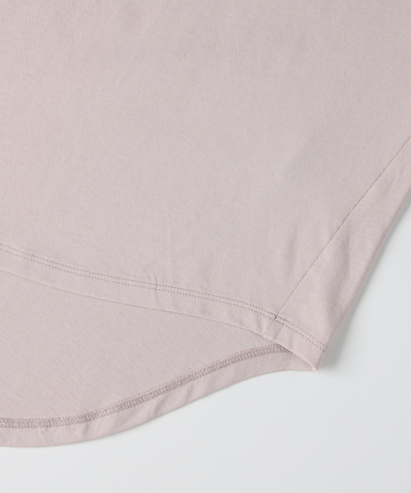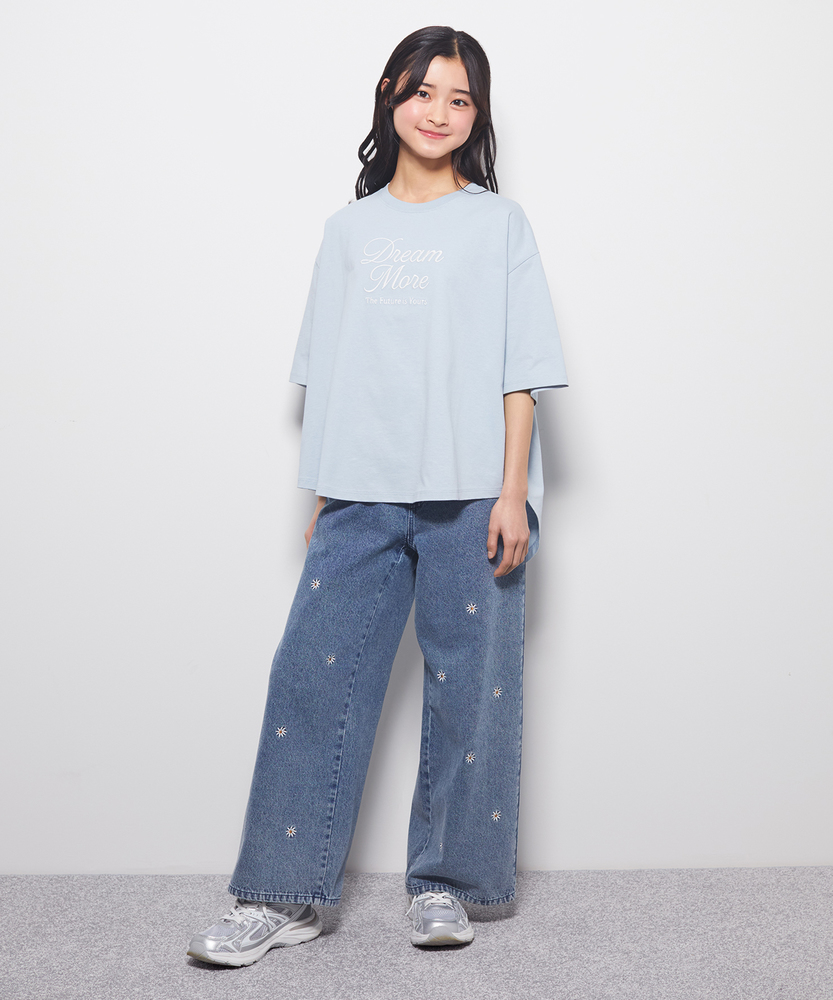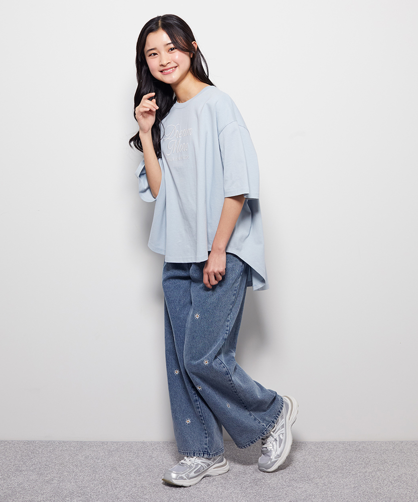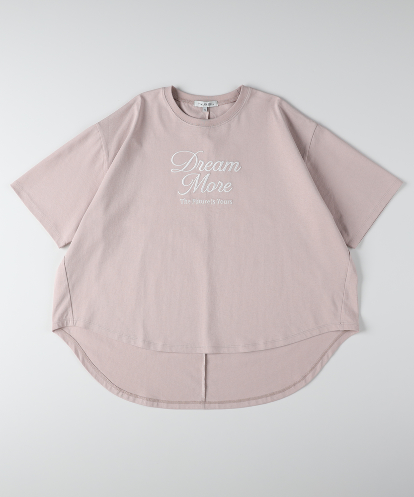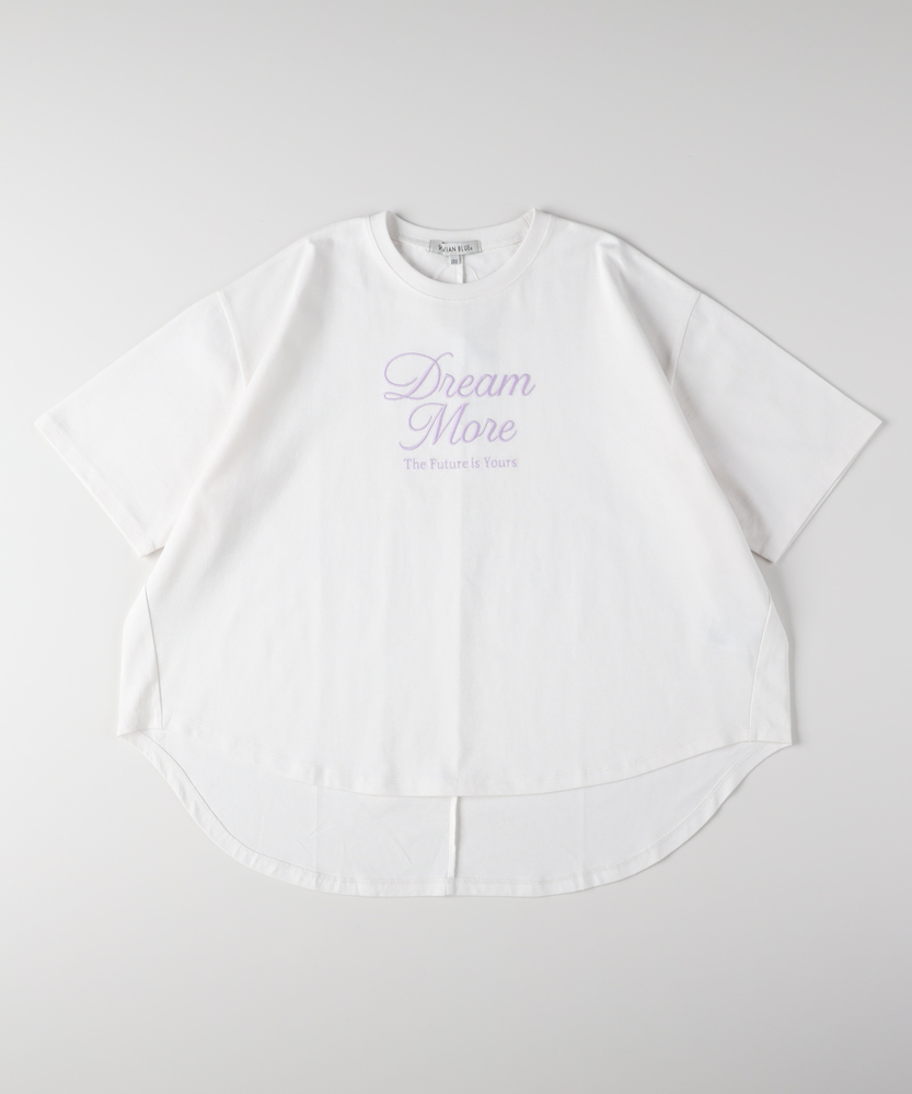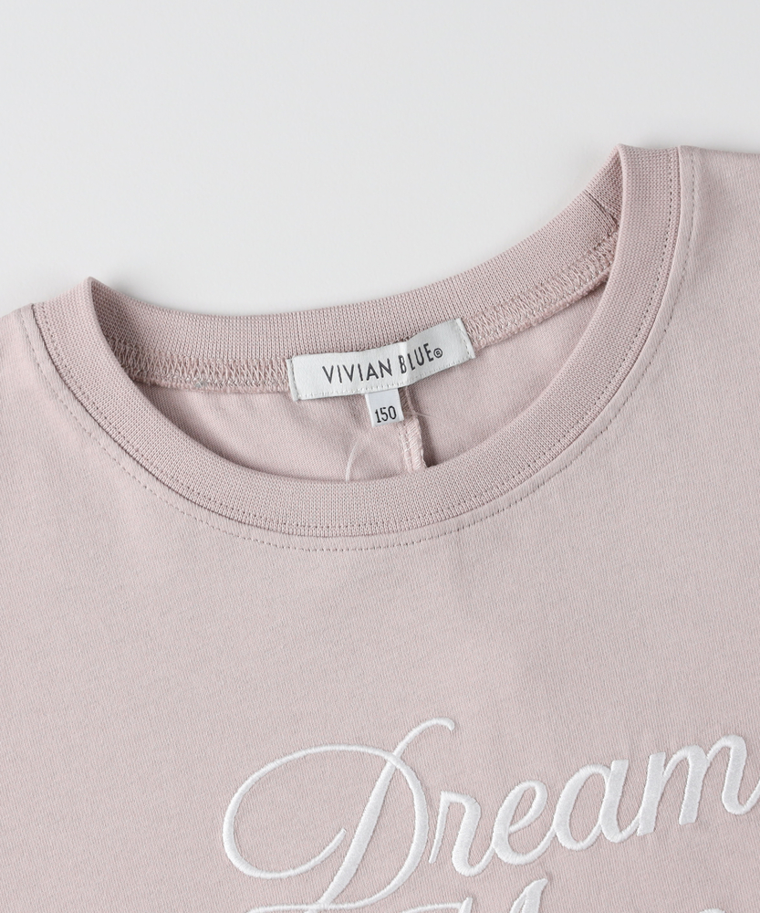 一枚で大人っぽく。旬シルエットのドルマンT。後ろ下がりでこなれ感。動きやすいリラックス設計。毎日着たくなる、爽やかカラーと優しい着心地。■Point・トレンドの「前後差」シルエットサッと着るだけで様になるデザイン。360度どこから見ても可愛い形。インでもアウトでもお洒落に決まります。・ゆったり「ドルマンスリーブ」肩回りが楽で、動きやすさも抜群。締め付け感がなくストレスフリー。風通しが良く、暑い日も快適です。・大人っぽい「筆記体ロゴ」主張しすぎないロゴが上品な印象。シンプルだから飽きが来ません。少し背伸びしたい年頃にぴったり。・体型を拾わない「リラックス感」ゆとりのある身幅で身体が泳ぐサイズ感。お家でのリラックスタイムにも最適。気負わずラフに着こなせます。・ヒップをカバーする「安心丈」後ろが長めで、しゃがんでも背中が出にくい。気になる腰回りもさりげなくカバー。アクティブに動く日も安心です。【仕様】身幅をたっぷりとったドルマンスリーブが、リラックス感のある着こなしを叶えます。裾に前後差をつけることで、シンプルながらも立体感のあるシルエットを実現しました。フロントには繊細なフォントの英字ロゴをあしらい、カジュアルな中にも女の子らしい上品さをプラスしています。【素材】デイリー使いに嬉しい、肌当たりの良いソフトな素材感です。汗ばむ季節でもさらりと快適に過ごせる、軽やかな風合いが魅力。お洗濯もしやすく、毎日気兼ねなく着られるため、通学や公園遊び、休日のお出かけなど幅広いシーンでタフに活躍します。【スタイリング】デニムやショートパンツと合わせた元気なカジュアルスタイルはもちろん、フレアスカートと合わせれば少しガーリーな雰囲気にも変身します。裾の前だけをボトムスにインすると、脚長効果でスタイルアップ。シンプルなのでチェックや花柄など、柄物のボトムスとも相性抜群です。