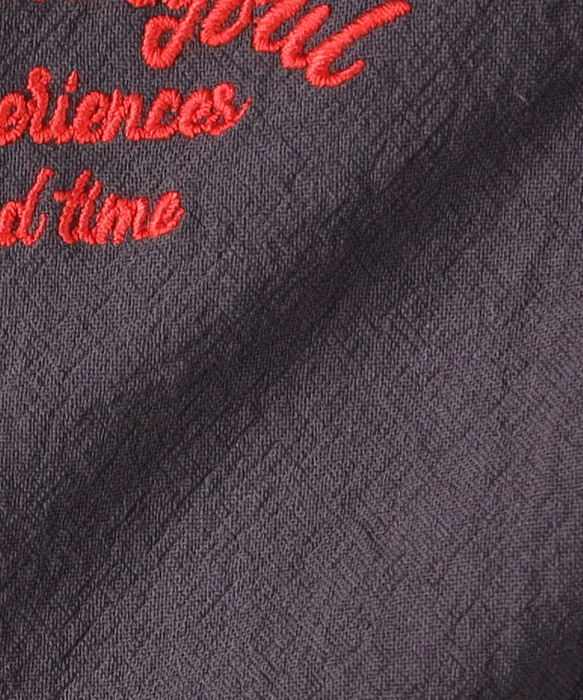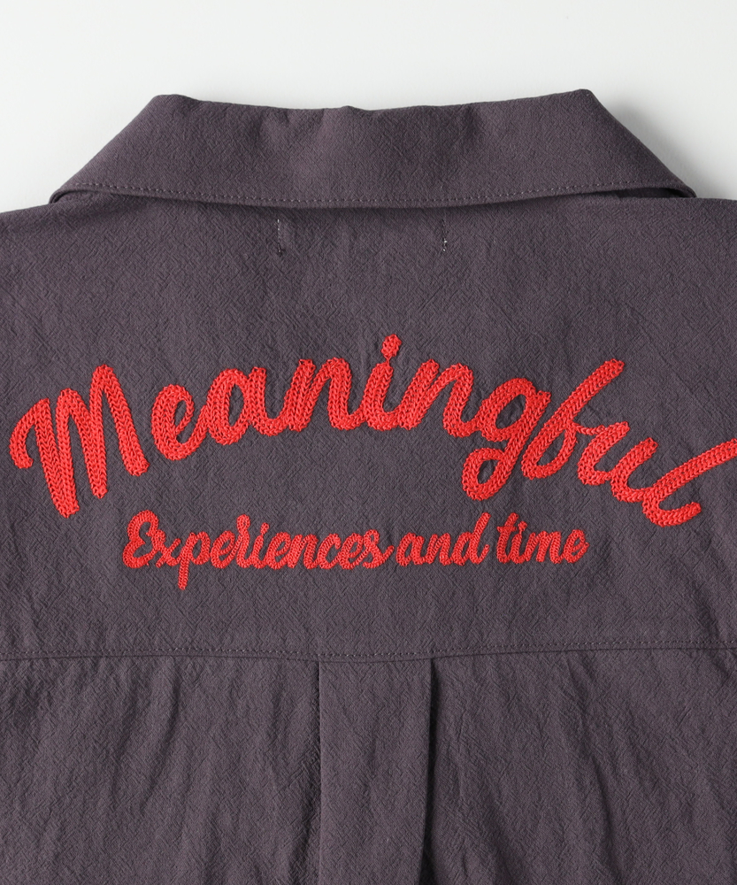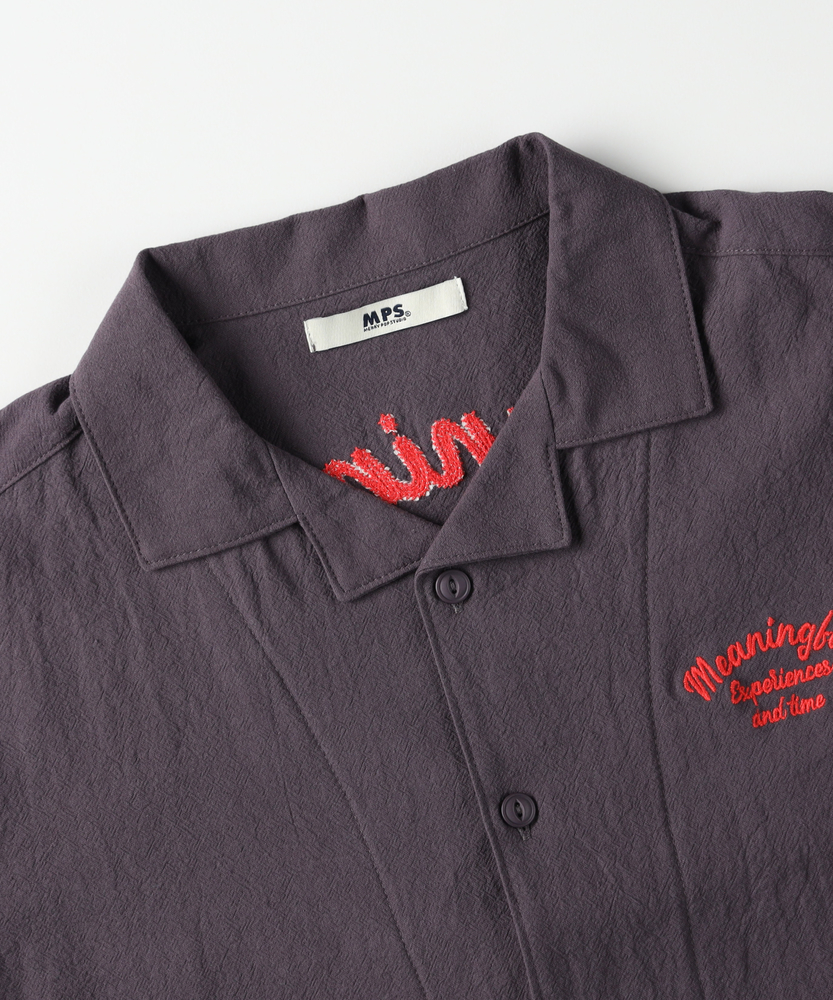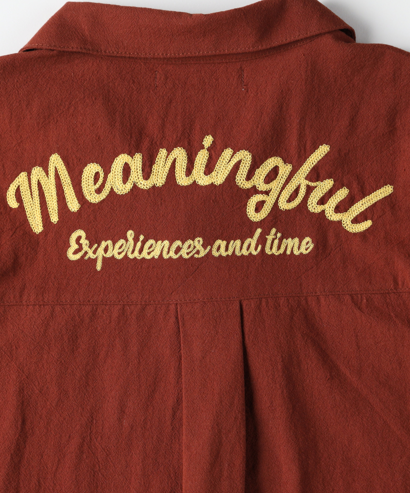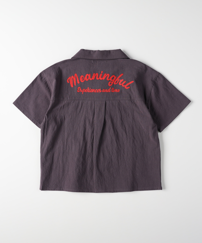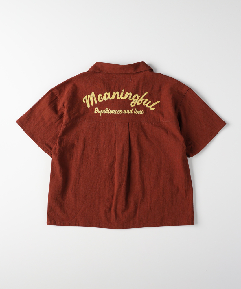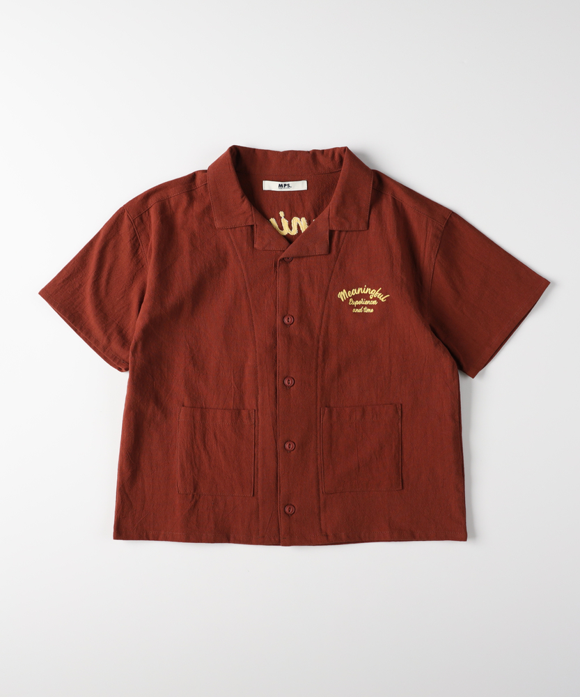 大人顔負けのヴィンテージライクな佇まい。後ろ姿までサマになる、本格派の刺繍シャツ。元気なキッズに嬉しい、ゆったりシルエット。■Point・目を惹くバック刺繍デザイン背中には存在感のある刺繍を配置。後ろ姿まで抜かりなく写真映えも抜群です。ヴィンテージライクな雰囲気を演出します。・涼しげなオープンカラー首元がすっきり見える開襟デザインを採用。大人っぽく抜け感のあるスタイルが叶います。暑い季節でも涼やかに着用いただけます。・動きやすいゆったりシルエット身幅にゆとりを持たせたボックスシルエット。背中のタックが動きやすさをサポートします。活発に遊ぶキッズもストレスフリーな着心地。・こなれ感を生むフロントポケット両サイドに配置されたパッチポケットが鍵。ワークテイストなデザインが男心をくすぐります。ちょっとした小物を入れるのにも便利です。・気兼ねなく着られる素材感洗いざらしのようなナチュラルな風合いが魅力。多少のシワも味になり日常使いにぴったりです。デイリーに活躍する頼もしい一枚です。・羽織りとしても大活躍ボタンを閉めて一枚で着るのはもちろん。Tシャツの上の羽織りとしても優秀です。ロングシーズン着回せる万能アイテムです。【仕様】大人顔負けのヴィンテージライクな雰囲気が漂うオープンカラーシャツです。左胸と背中に施された立体感のあるロゴ刺繍が、どこから見てもサマになるデザインです。フロントのダブルポケットがカジュアルなアクセントをプラスします。背中のタックが立体的なシルエットを作り出し、活発な動きを妨げない工夫も魅力です。【素材】表面にやや凹凸のある、ナチュラルでサラリとした風合いの生地を使用しています。肌にまとわりつきにくく、汗ばむ季節でも快適な着心地をキープします。洗いざらしのような質感がこなれ感を演出し、多少のシワも味になるため日常使いに最適です。深みのある落ち着いたカラーリングが、大人っぽい印象を与えます。【スタイリング】ボタンを留めて一枚で着るだけで、トレンド感のあるスタイルが完成します。インナーに白Tシャツを合わせ、サラッと羽織るレイヤードコーデもおすすめです。デニムやチノパンはもちろん、ハーフパンツと合わせても子供っぽくなりすぎません。洗練された大人顔負けのお出かけスタイルをぜひお楽しみください。【MPS】累計販売本数2000万本突破したMPSボトムをメインにデイリー使いしやすいディテールやデザイン、生地まで拘った大人顔負けなカジュアルスタイルにぴったりなアイテムを展開。