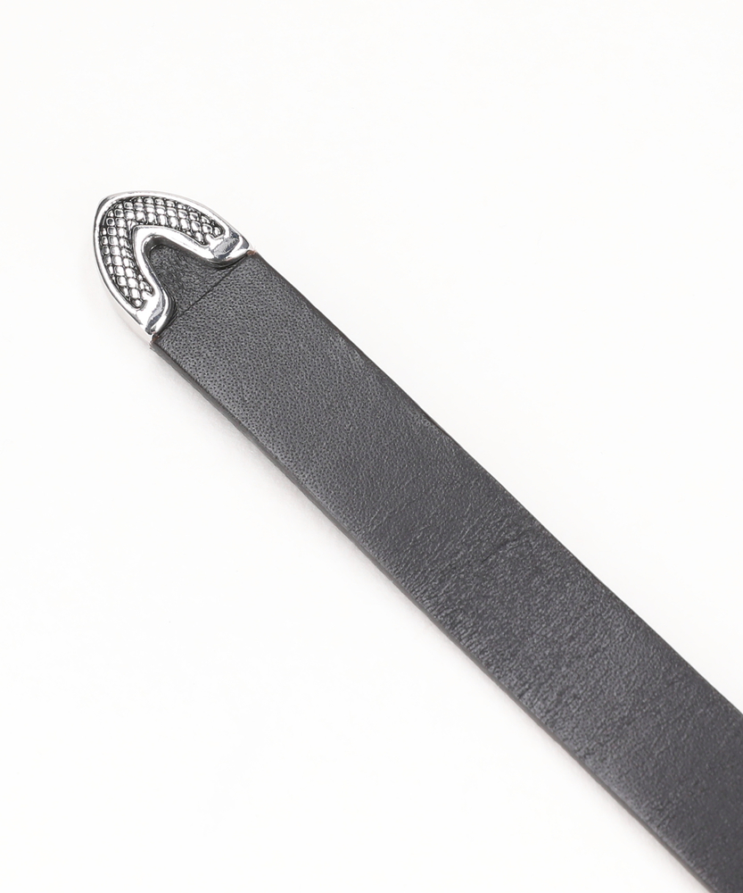 【仕様】バックル、サルカン、そして剣先に至るまで装飾的なメタルパーツを配した、ウエスタンムード漂うデザインベルトです。シルバーパーツが、黒いレザーの上で静かに主張し、洗練された印象を演出します。19mmというやや細身のベルト幅は軽やかな印象となり、ロング仕様ならではのアレンジも楽しめる一本です。【素材】きめ細やかで適度な光沢を持つ素材を使用しており、ハードになりがちなメタルパーツとのバランスを上品に整えています。使い始めから体に馴染むしなやかさを持ち、経年変化によってさらに風合いが増していきます。しっかりとした厚みがありながらも硬すぎず、デイリーユースに対応した実用性の高さも魅力です。【スタイリング】シンプルなデニムとTシャツのコーデに投入するだけで、こなれた印象に。シャツをタックインし、剣先のメタルパーツをあえて見せるように少し垂らして着用するのがおすすめ。スラックスなどのきれいめなボトムスのハズしアイテムとしても活躍します。