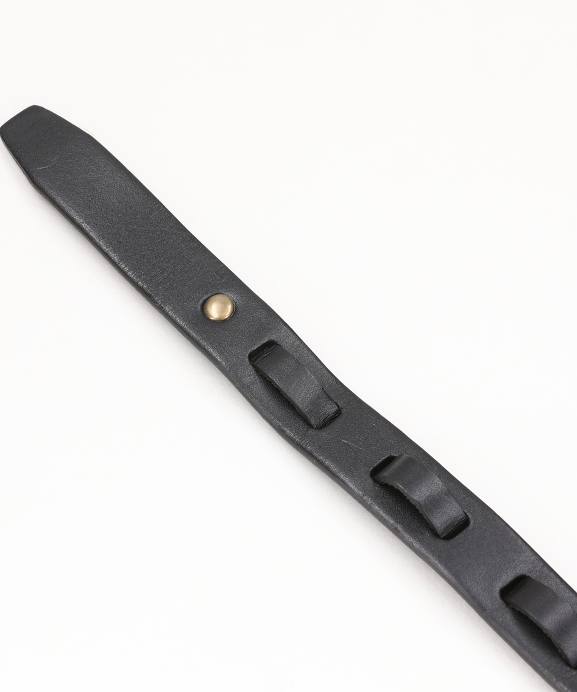 【仕様】ユニークなフック式バックルを採用したデザインベルトです。23mmという細めの帯幅が、腰回りにシャープで洗練された印象を与えます。帯部分にデザインとして組み込まれたループにフックを引っ掛けて固定する独特のギミックは、機能性だけでなく視覚的な面白さも提供し、こだわりを感じさせる一本です。【素材】しっとりとした質感の素材と、ゴールドカラーの重厚な金属パーツとのコントラストが魅力です。使い込むほどに柔らかく身体に馴染み、豊かな経年変化も楽しめます。【スタイリング】細身のフォルムは、スラックスやワイドパンツと合わせた少しモードライクな着こなしに最適です。シャツやカットソーをタックインした際に、特徴的なフックバックルがアクセサリーのような存在感を放ち、シンプルなコーディネートを一気に格上げします。