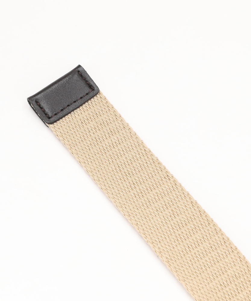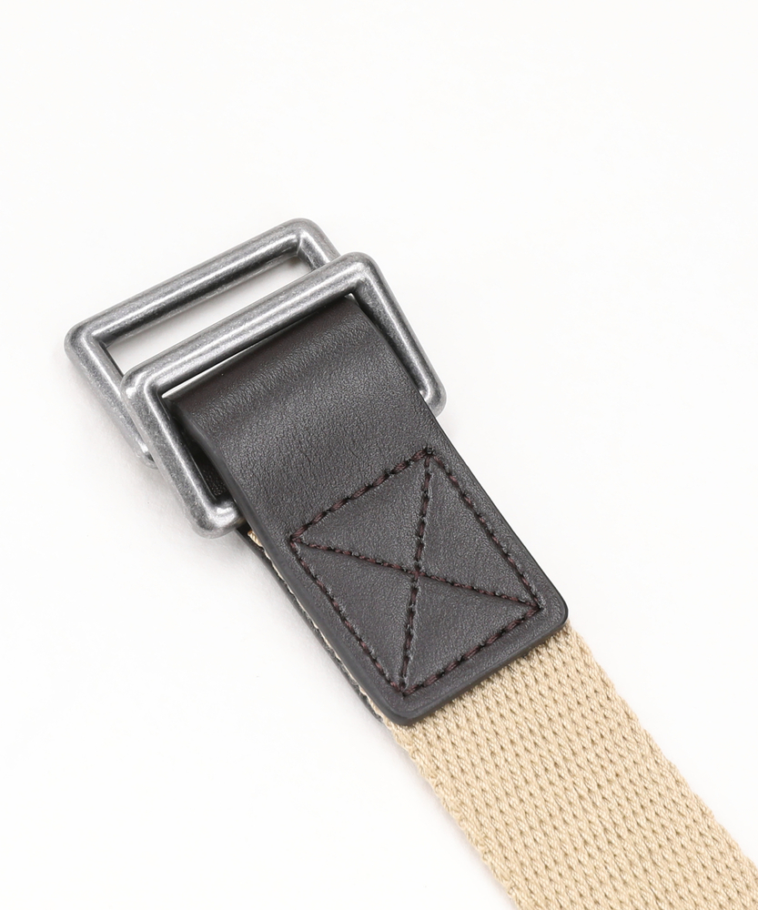 【仕様】カジュアルな印象の強いテープベルトを、要所にレザーパーツを配することで大人の装いに。2つのリングにベルトを通すダブルリング仕様は、ピン穴がないため体型に合わせてミリ単位でのサイズ調整が可能です。29mmという絶妙な幅設定により、腰回りが重たくならずスマートに決まる、実用性とファッション性を兼ね備えた一本です。【素材】しっかりと目の詰まった肉厚なテープ素材を採用し、ラフに扱ってもへこたれないタフな質感が魅力です。バックル接続部分にあしらわれたレザーパッチが、カジュアルな素材感の中にクラス感を与え、チープに見えません。マットな質感に仕上げられた金属リングも、落ち着いた大人の雰囲気を後押しします。【スタイリング】チノパンやカーゴパンツ、デニムといったカジュアルなボトムスとの相性は抜群です。ベルトを締めた後に余った剣先を自然に垂らすことで、コーディネートに程よい「抜け感」とアクセントを加えることができます。気取らない休日のスタイルや、アウトドアシーンなど、リラックスしたい日の良き相棒として活躍します。