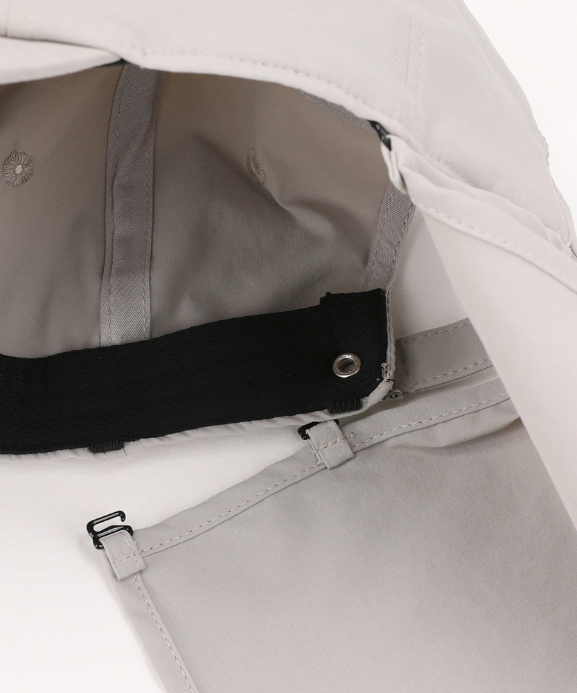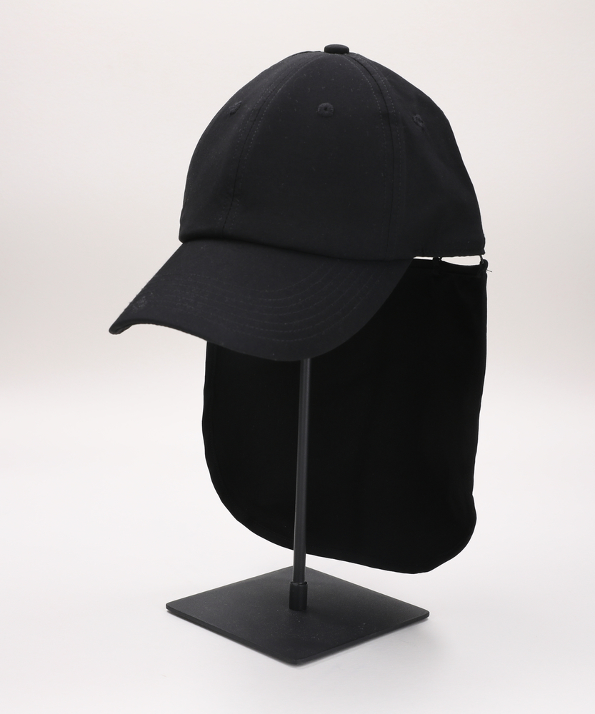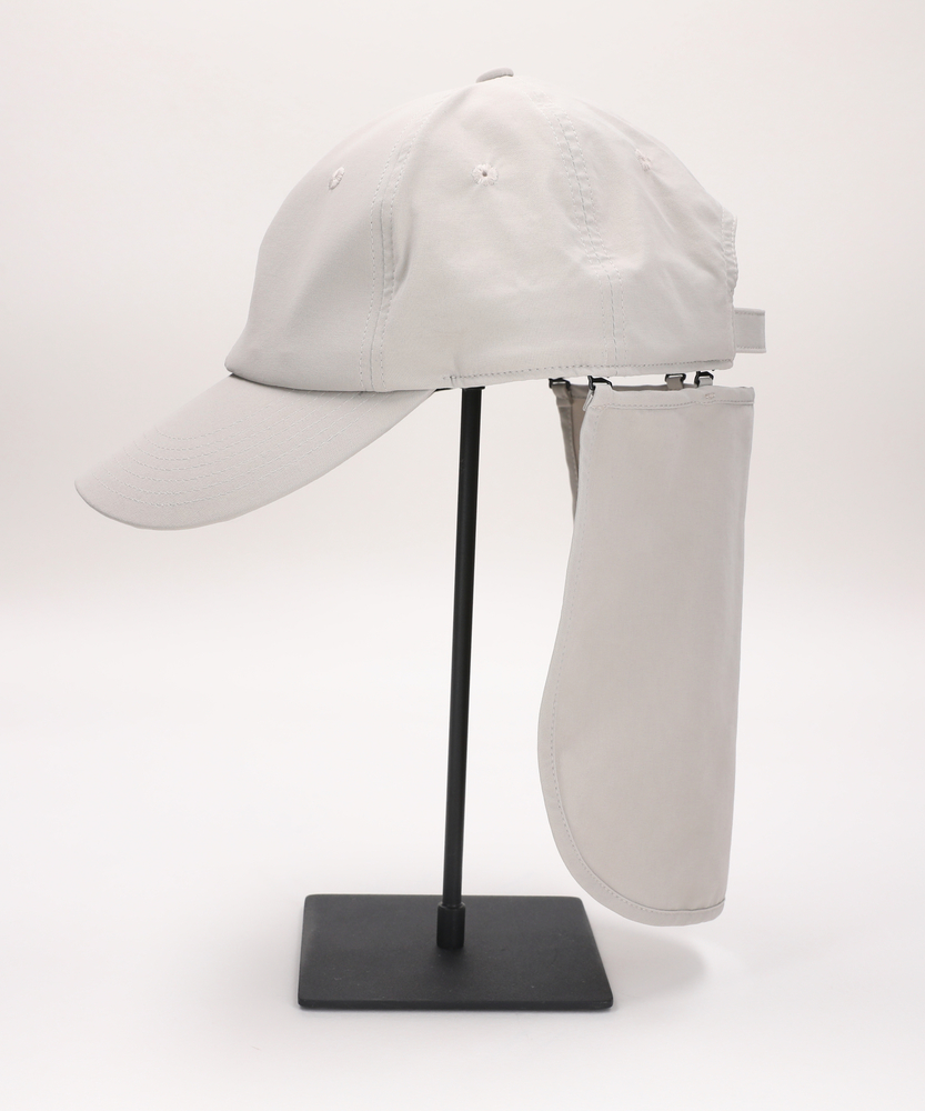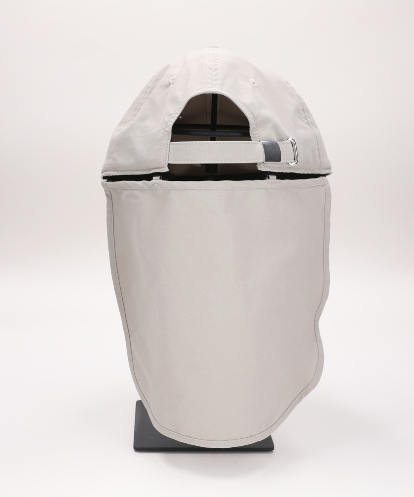【仕様】シンプルで洗練されたフォルムが特徴のアクティブナイロンキャップ。取り外し可能なネックカバーと顎紐付きで、さまざまなシーンで活躍します。無駄のないデザインは、アクティブなライフスタイルをサポートしつつスタイリッシュさを演出。【素材】 耐久性に優れたナイロンとポリウレタンを使用。撥水性や紫外線カット機能を備え、さらには接触冷感を感じられる優れた素材感が、夏の日差しから守ります。アクティブな動きにフィットする柔軟性を持ちながら、軽快さも兼ね備えています。 【スタイリング】 このキャップは、カジュアルなTシャツやショートパンツに合わせるのはもちろん、スポーティーなジャケットとのコーディネートにも最適です。アウトドアやビーチでのアクティビティにもぴったりのアイテムです。シンプルながらも、使うシチュエーションに応じて様々なスタイルを楽しめます。