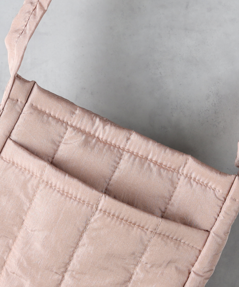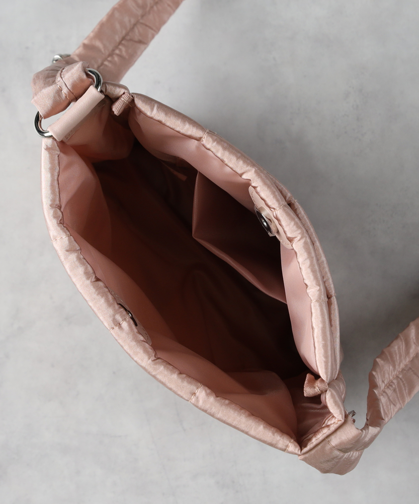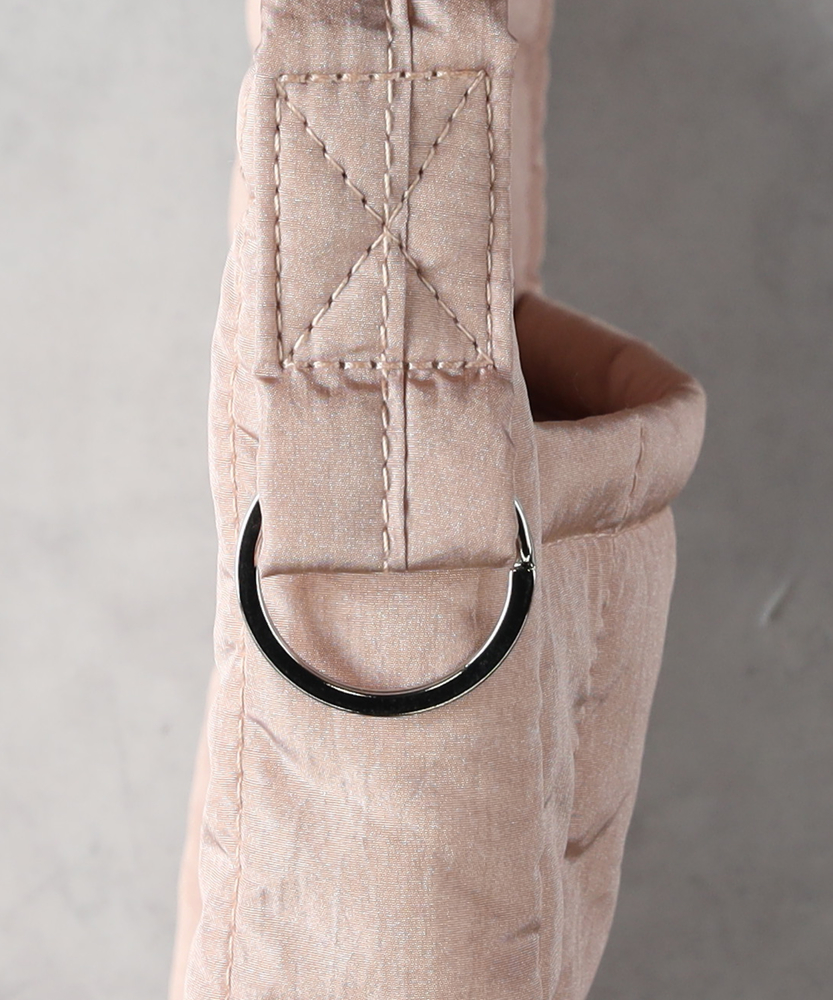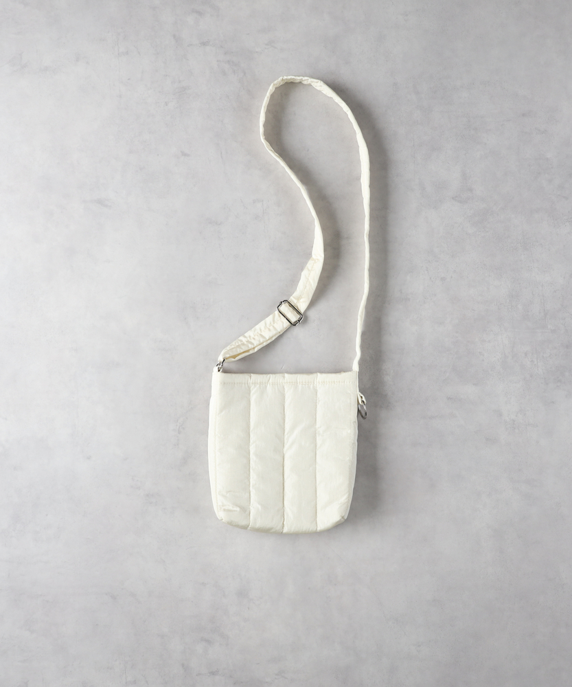 【仕様】愛らしいキルティングがポイントのパデッドミニショルダーバッグ。コンパクトなサイズ感ながらも、しっかりとした存在感を持ち、シンプルなコーディネートに華やかさを添えます。洗練されたデザインで、カジュアルからフォーマルまで幅広く活躍します。【素材】 100%ナイロン素材のこのバッグは、軽量でありながらも耐久性に優れています。柔らかな手触りと微光沢感が特徴で、エレガントな印象を演出。また、キルティングによるやわらかさが魅力的で、デイリーユースにぴったりです。【スタイリング】 このミニショルダーバッグは、カジュアルなジーンズとの組み合わせにマッチします。また、ワンピースに対しても軽やかなアクセントとなり、全体のバランスを取りながら上品に仕上がります。
