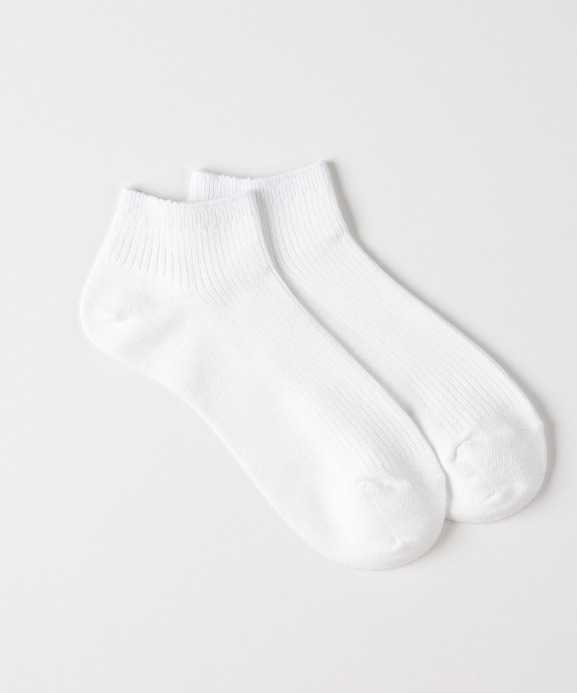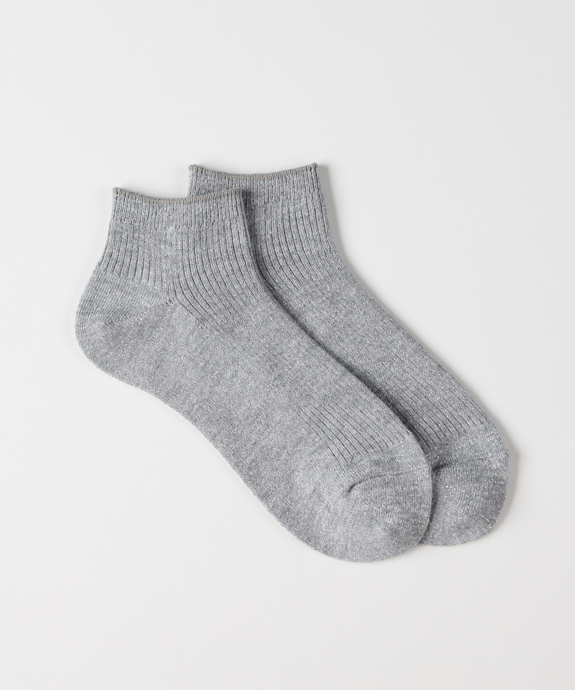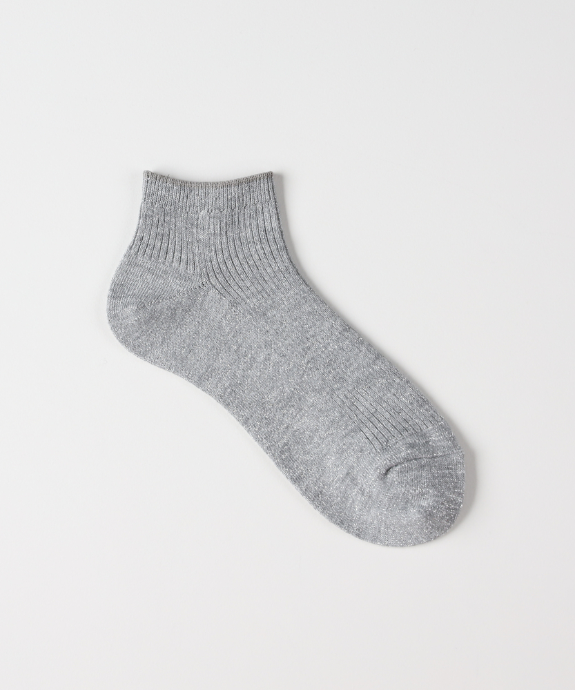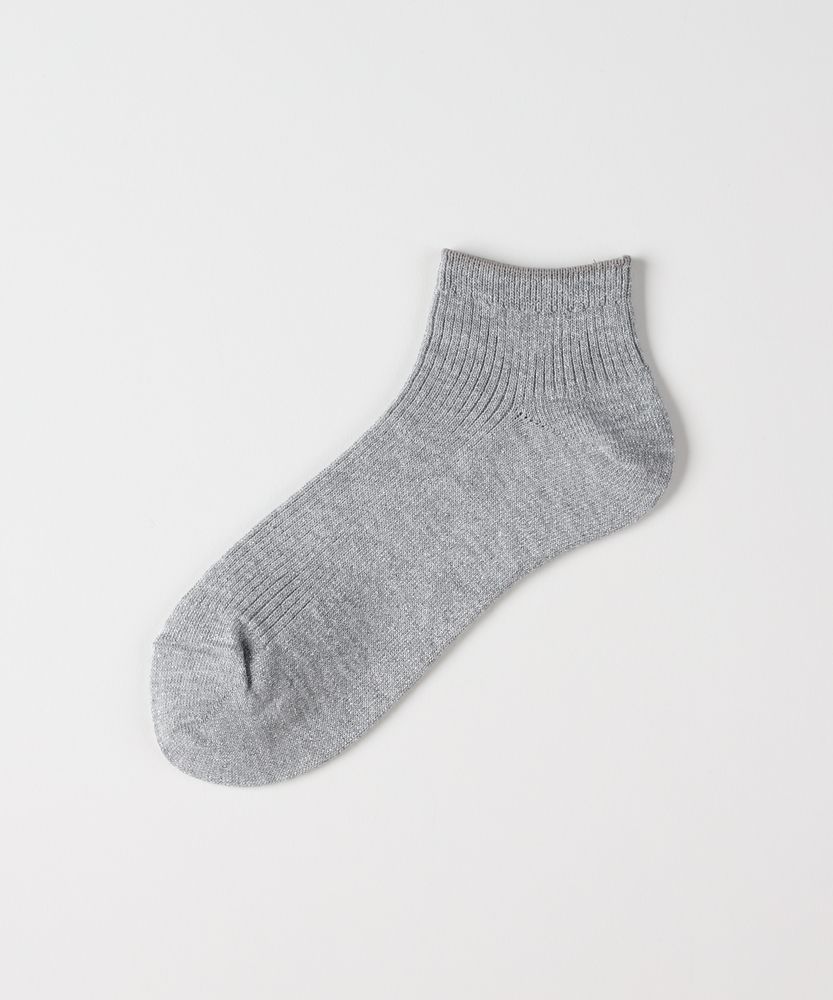 足元に、大人の煌めきをひとさじ。ふとした瞬間に心ときめく、上品ラメソックス。■Point・繊細な輝きを放つ「ラメ糸」派手すぎず、上品に煌めくラメ感が魅力。いつものコーディネートに、さりげない華やかさをプラスします。大人の女性に似合う、品のある光沢感です。・「締め付けにくい」優しいリブ編み伸縮性に優れたリブ仕様で、足首を優しく包み込みます。長時間の着用でもゴム跡がつきにくく、ストレスフリーな履き心地。リラックスしたい日の足元にも最適です。・バランスの良い「アンクル丈」くるぶしが隠れる程度の、使い勝手の良い丈感。フルレングスのパンツからチラリと見せたり、スカートと合わせたり。ボトムスを選ばず、毎日のスタイリングに馴染みます。・靴を脱いでも「手抜き感なし」お座敷での食事や、友人の家への訪問時も安心。靴を脱いだ瞬間、足元から大人の遊び心が光ります。「見えないところ」へのこだわりが、洗練された印象に。・どんな靴にも合う「万能さ」スニーカーでカジュアルダウンしたり、パンプスできれいめに纏めたり。足元のテイストを選ばず、オンオフ幅広く活躍します。サンダルとのレイヤードスタイルにもおすすめです。・コーデを格上げする「カラー展開」シルバーやブラックなど、合わせやすいベーシックな色合い。ラメの質感が奥行きを生み、単調になりがちな足元のアクセントに。色違いで揃えたくなる使いやすさです。【デザイン】全体に繊細なラメ糸を織り込んだ、華やかなショート丈ソックスです。細めのリブ編みが縦のラインを強調し、足首をすっきりと華奢に見せてくれます。シンプルながらも存在感があり、アクセサリー感覚で取り入れられるデザインです。【素材】動くたびに光を受けてキラキラと輝くラメ仕様です。見た目の華やかさはもちろん、足へのフィット感も重視。伸縮性が高く、足の形に柔らかく馴染む素材感で仕上げています。【着こなしポイント】デニム×スニーカーの足元からラメを覗かせて、カジュアルな中に女性らしさをプラス。バレエシューズやローファーと合わせれば、クラシカルでトレンドライクな印象に。マキシ丈スカートの裾から、歩くたびにキラリと光らせるのが大人の楽しみ方です。