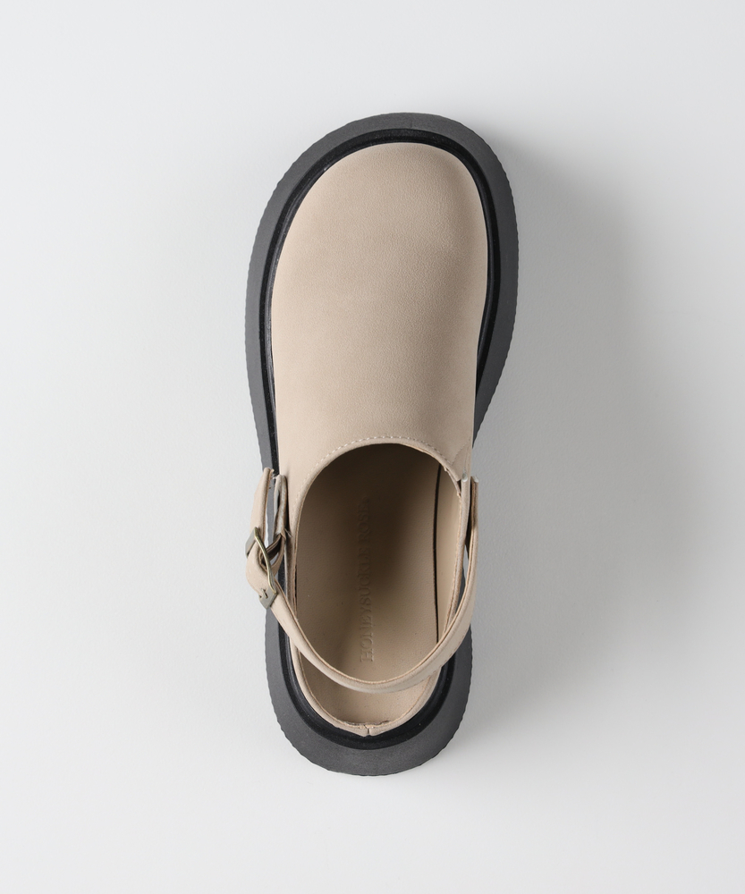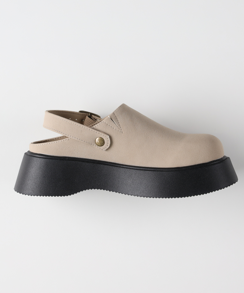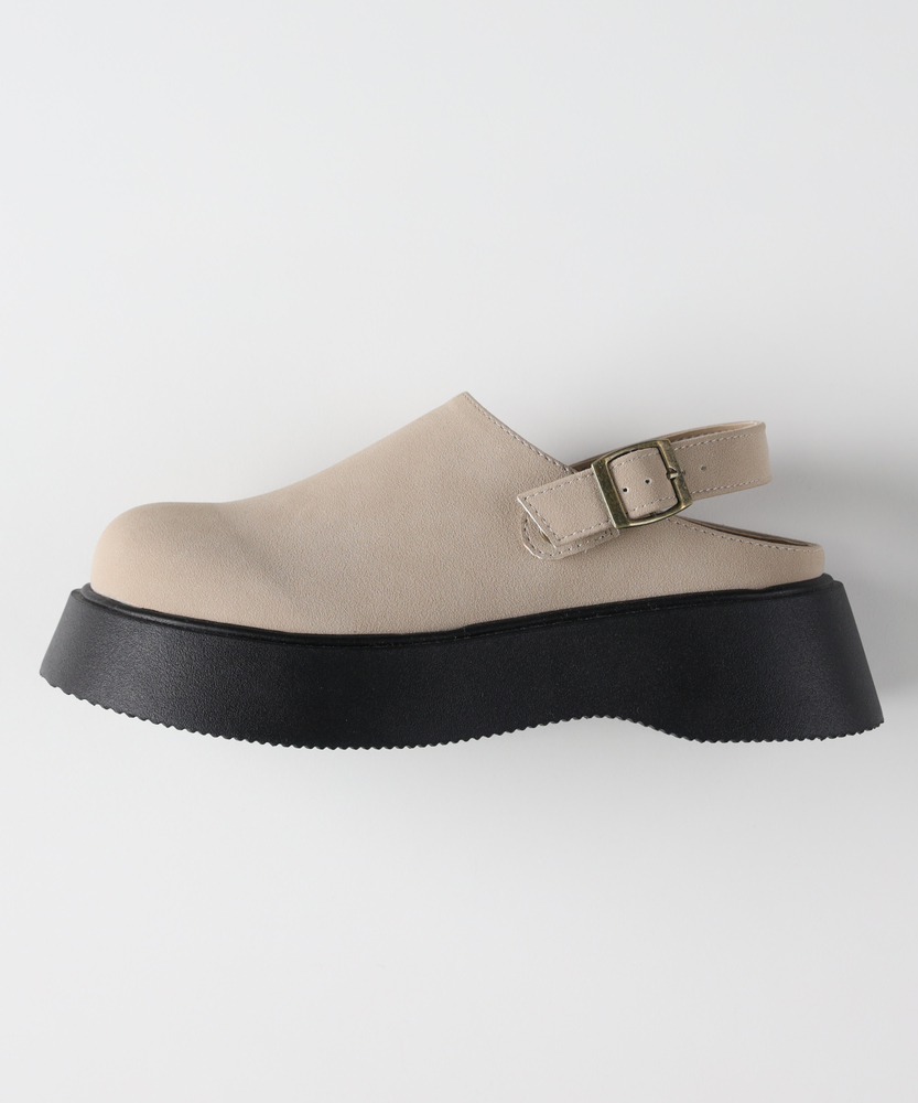 足元に程よいボリューム感をプラス。大人の抜け感を作る、厚底サボ。「楽ちん」と「キレイ」を両立する一足。■Point・「盛れる」のに疲れない厚みのあるソールが自然なスタイルアップを実現。高低差の少ないプラットフォーム型で、安定感のある履き心地です。・コロンとした愛らしいフォルム丸みを帯びたトゥデザインが、足元に女性らしい柔らかさをプラス。カチッとしすぎず、リラックスした雰囲気を演出します。・安心感のあるバックストラップかかとをしっかりとホールドしてくれるストラップ付き。サボ特有の「脱げやすさ」を解消し、長時間の歩行も快適にサポートします。・季節を繋ぐ、万能デザイン素足でサンダルとして履くのはもちろん、ソックス合わせも相性抜群。春先から秋口まで、ロングシーズン活躍する頼れるアイテムです。・選べる2つの表情クールで引き締まるスムース調のブラックと、柔らかく上品なスエード調のベージュ。カラーによって異なる素材感が、それぞれの個性を引き立てます。・細部までこだわった金具使いカラーに合わせてバックルの色味も調整。キラリと光る金具が、カジュアルな中にも大人っぽいアクセントを添えます。【デザイン】トレンド感のあるボリュームソールと、甲を深く覆うサボデザインを組み合わせた一足。存在感のあるシルエットながら、無駄のないミニマルなデザインで大人の日常に馴染みます。バックストラップが足首を華奢に見せ、パンツスタイルからスカートまで幅広いボトムスとバランス良く決まります。【素材】カラーにより異なる質感が魅力です。ブラックは滑らかな光沢感を持つスムース調素材で、モードで洗練された印象に。ベージュは温かみのあるスエード調素材を使用し、優しげでナチュラルな雰囲気を醸し出します。インソールは足当たりが良く、デイリー使いに最適です。【着こなしポイント】ワイドパンツやデニムの裾からちらりと覗かせれば、こなれた大人カジュアルが完成。ロングスカートやワンピースの足元に合わせれば、程よい重厚感が甘さを抑え、バランスの良いコーディネートに。カラーソックスや柄物の靴下を合わせた、遊び心のあるスタイリングもおすすめです。