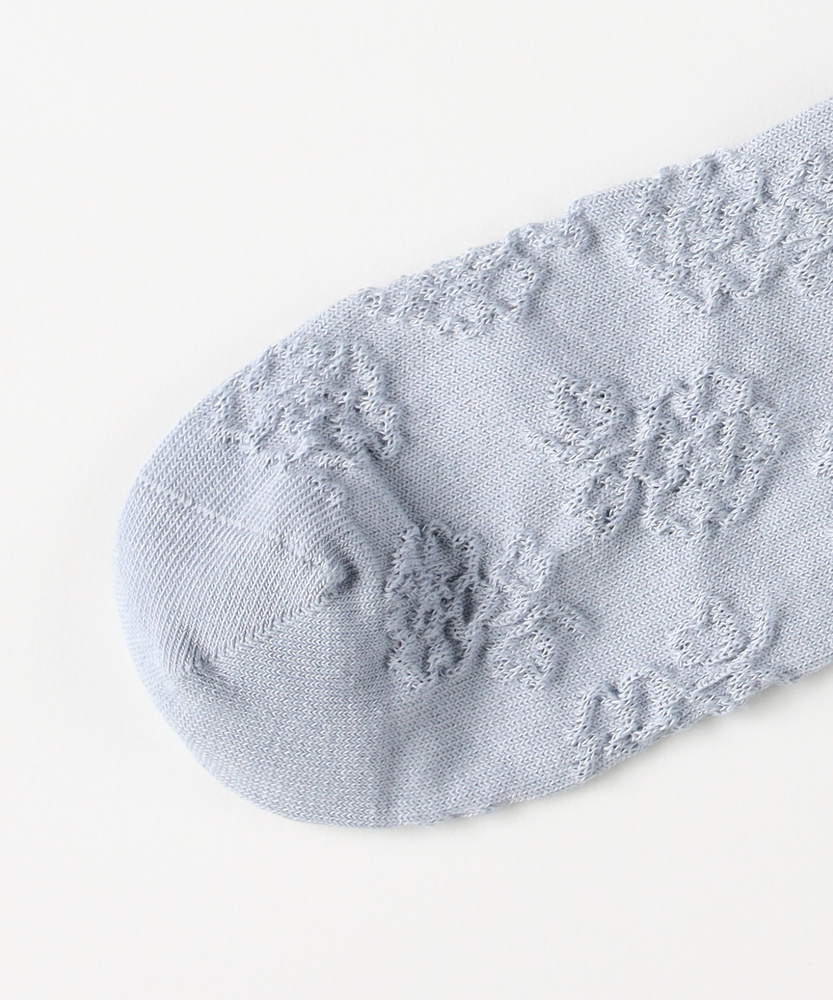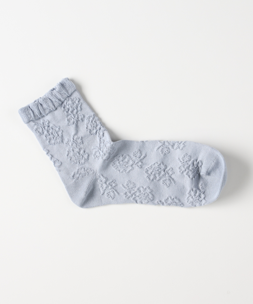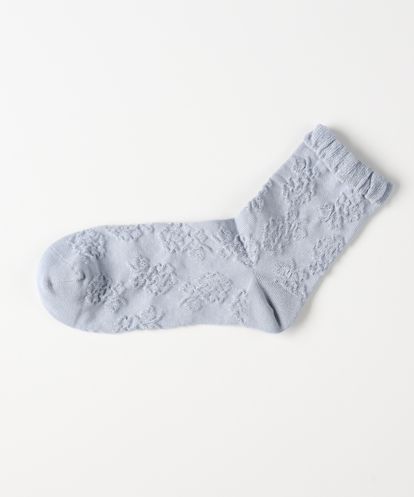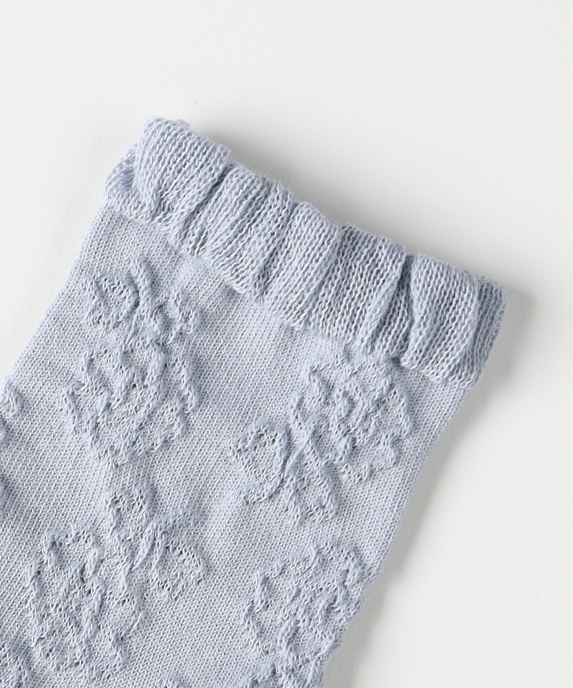 足元にさりげない華やかさを添えて。立体的な花柄が大人可愛いジャガードソックス。いつものコーデにプラスするだけで旬な足元へ。■Point・立体感のある花柄ジャガードぽこぽことした編み地が魅力。足元にさりげない表情をプラス。無地感覚で合わせやすいデザイン。・締め付け感を抑えた履き口ゆったりとした優しいフィット感。長時間の着用でも快適な履き心地。ほんのり波打つデザインもポイント。・デイリーに使いやすい丈感スニーカーやパンプスとも好相性。パンツの裾からチラ見せしても◎。毎日のコーデに活躍する絶妙な長さ。・柔らかな肌触りでノンストレス足全体を優しく包み込む心地よさ。季節を問わず履きやすい風合い。お出かけやお家でのリラックスに。・大人に似合う上品なカラー甘さを抑えた落ち着きのある色合い。普段のコーデに馴染むトーンを厳選。足元からさりげなくセンスを演出。・コーデを格上げするアクセントシンプルな装いのワンポイントに。さりげないこだわりが光る一足。何足あっても嬉しい頼れるアイテム。【仕様】立体的に編み込まれた花柄のジャガード模様が、大人の足元にさりげない華やかさを添えるソックスです。履き口は締め付け感を軽減したゆったりとした仕様で、フリルのような波打つデザインがほんのりフェミニンな印象を与えます。スニーカーからローファーまで、どんなシューズともバランスを取りやすい絶妙な丈感も魅力です。【素材】足全体をふんわりと優しく包み込む、柔らかな肌触りが特徴です。立体感のあるジャガード編みが、見た目の可愛らしさだけでなく、ほどよいフィット感と心地よさを実現。季節を問わずデイリーユースしやすい厚みで、お出かけの日はもちろん、お家でのリラックスタイムにも寄り添ってくれる快適な履き心地です。【スタイリング】デニムやチノパンからチラリと覗かせれば、カジュアルな中に女性らしいエッセンスをプラスできます。バレエシューズやローファーと合わせて、クラシカルな足元を演出するのもおすすめ。甘すぎない上品な柄行きなので、無地のボトムスだけでなく、柄物のワンピースなどと合わせてもすっきりとまとまります。