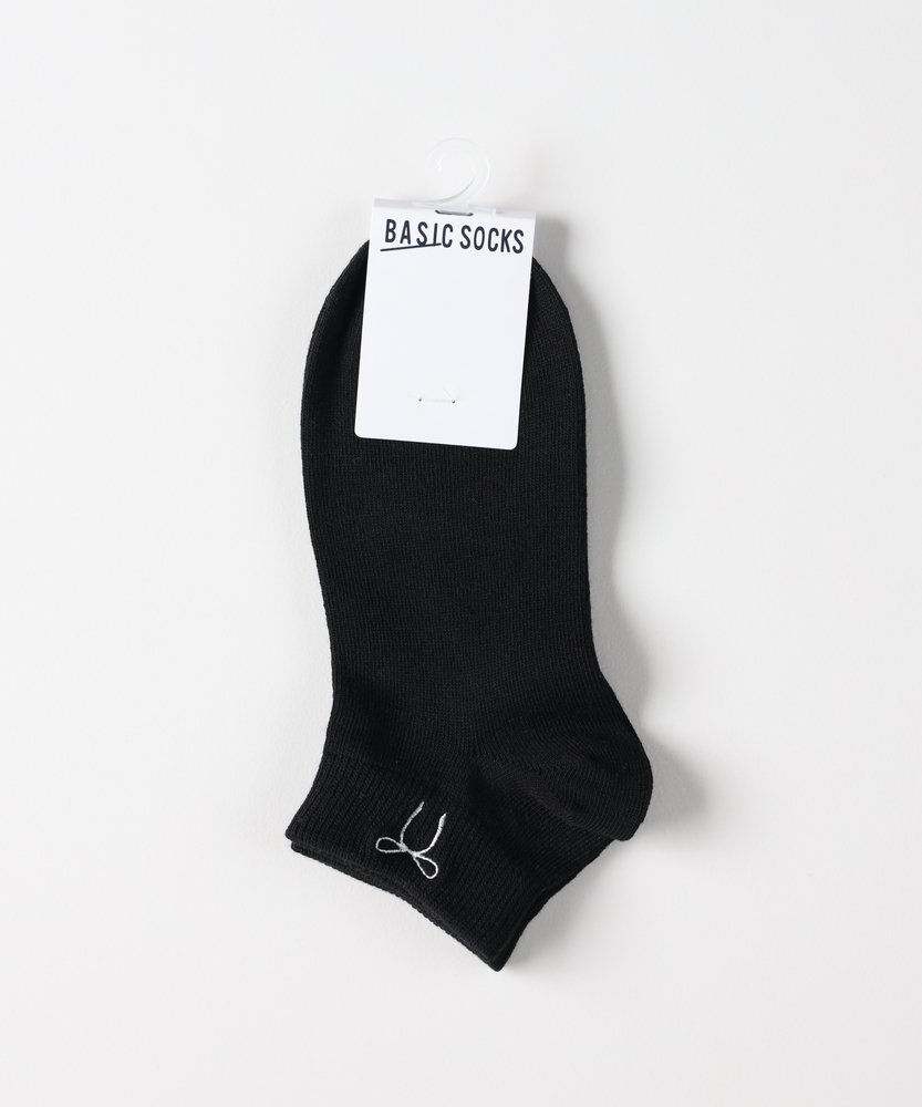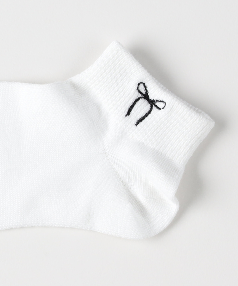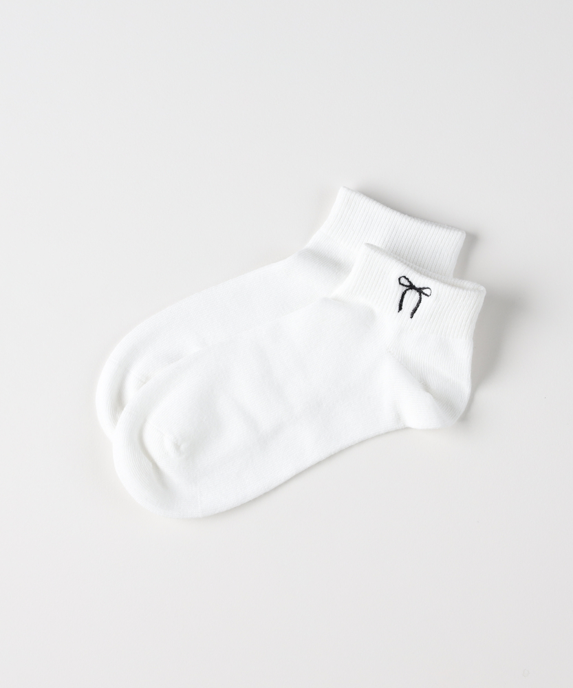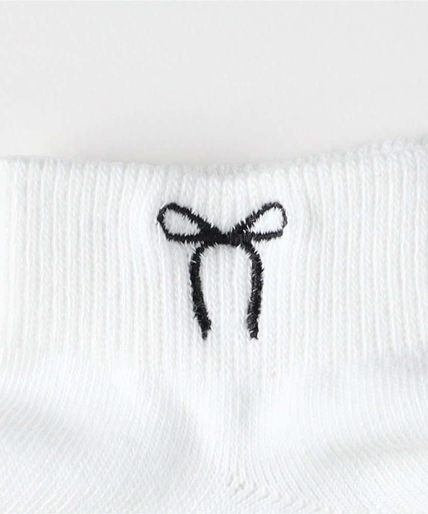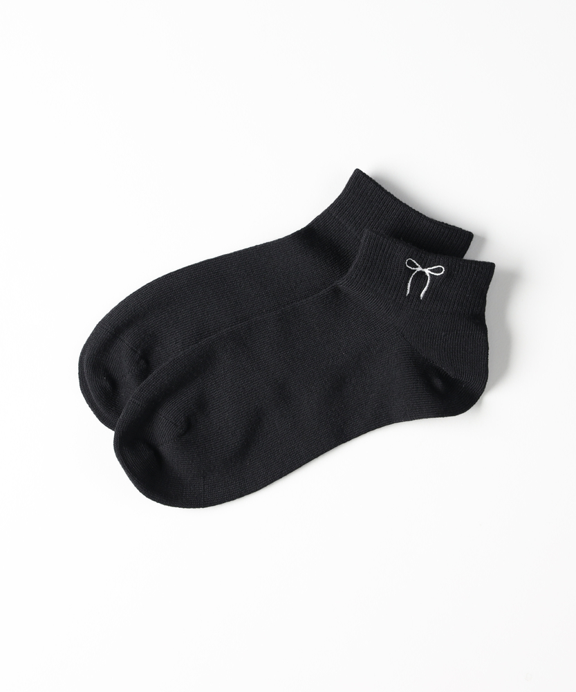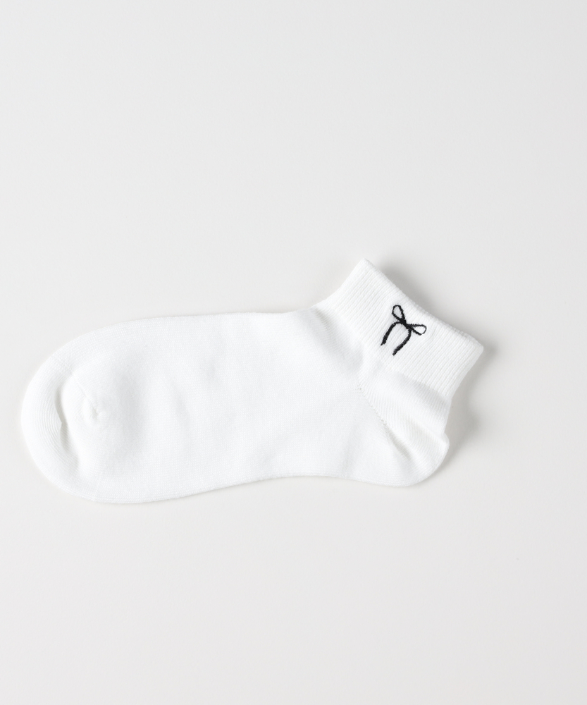 足元にさりげないときめきを添える。大人のための、甘すぎないリボン刺繍。スニーカーからのチラ見せでセンスUP。■Point・大人が履けるリボンデザイン華奢な線画タッチの刺繍で甘さを抑えた大人仕様。足元に程よい抜け感を。・スニーカーと好相性な丈感くるぶし丈のショートソックス。靴からの見え方が絶妙です。バランスの取れた足元に。・使いやすいモノトーン配色ベースカラーに映えるコントラストの効いた刺繍糸。毎日のコーデに迷いません。・程よくフィットする履き口締め付け感を抑えつつズレにくいリブ仕様を採用。ストレスフリーな履き心地。・なめらかな表面感プレーンな編み地ですっきり。カジュアルからキレイめまで幅広いテイストにマッチします。・シーズンレスな風合い季節を問わず使いやすい心地よい肌触りが魅力。日常の定番アイテムとして。【仕様】履き口付近に施された、華奢なラインのリボン刺繍が目を惹くショート丈ソックス。子供っぽくなりがちなモチーフも、シンプルな線画タッチで仕上げることで、大人の女性が取り入れやすい洗練された印象に。主張しすぎないワンポイントが、いつもの足元にさりげない遊び心をプラスしてくれます。【素材】プレーンですっきりとした編み地で、なめらかな肌触りと快適な履き心地を叶えます。厚すぎず薄すぎない絶妙な肉感により、季節を問わずオールシーズンで活躍します。履き口には程よいフィット感のリブ編みを採用しており、優しく足首に寄り添いながらズレを軽減してくれます。【スタイリング】定番のスニーカーはもちろん、ローファーやバレエシューズに合わせたフレンチシックな装いもおすすめです。ボトムスの裾からチラリとリボンを覗かせれば、シンプルなコーディネートのさりげないアクセントに。モノトーンベースなので色柄物のボトムスとも相性が良く、日常の足元コーデを格上げしてくれます。
