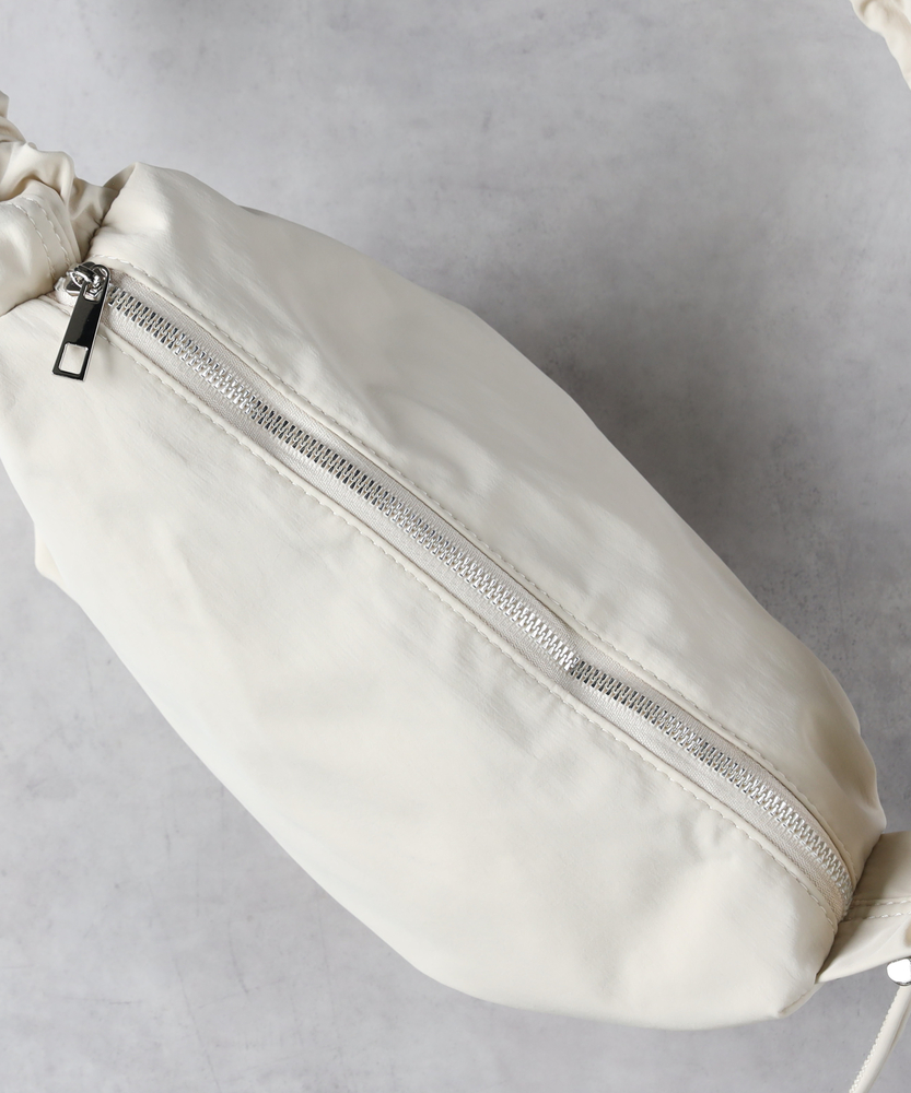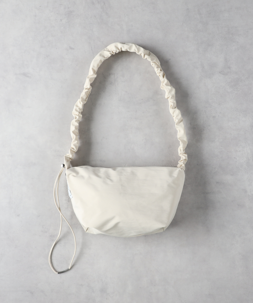 【仕様】トレンド感あふれるミニマルなデザインが魅力のショルダーバッグ。特徴的なギャザー入りのショルダーストラップが個性を引き立て、シンプルでありながら存在感を放ちます。デイリーユースにぴったりのコンパクトなサイズ感です。【素材】軽量で耐久性に優れたナイロン素材を使用しており、軽やかさと強度を兼ね備えています。ちょっとした雨の日でも安心してお使いいただけます。 【スタイリング】カジュアルなスタイルはもちろん、トレンドのリラックスしたコーディネートにもマッチ。ロングシャツやワイドパンツと合わせて、バランスの良いシルエットに仕上げるのがおすすめです。オフの日のアクセントにぴったりのアイテムです。