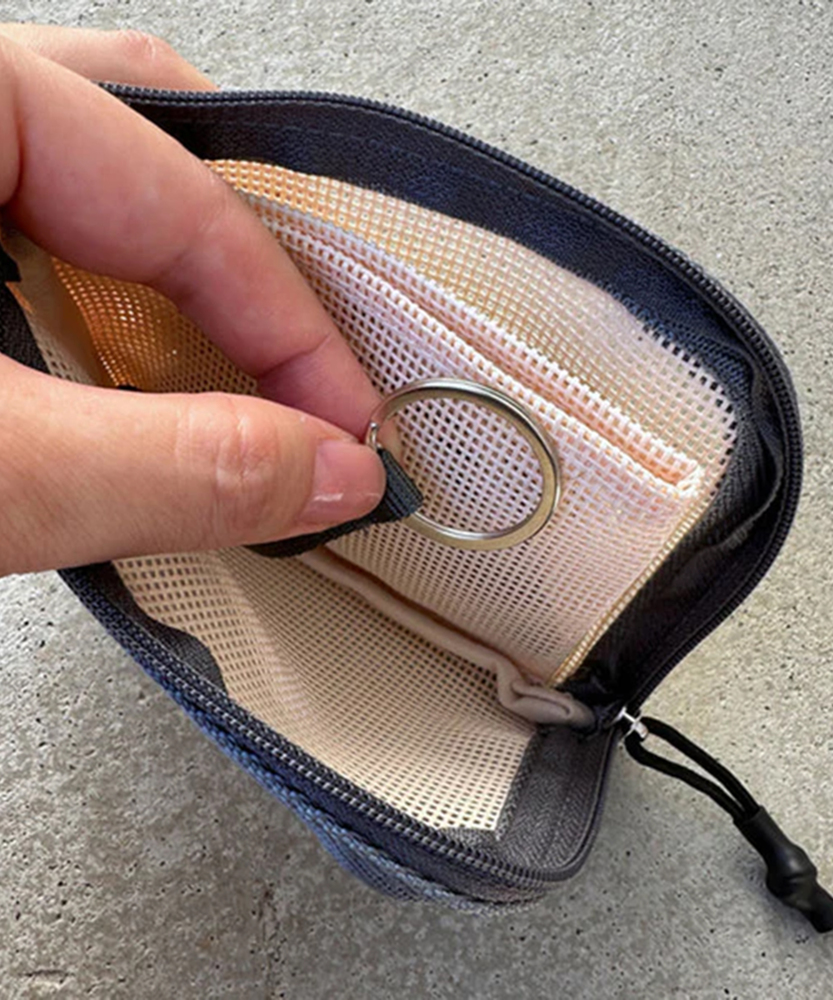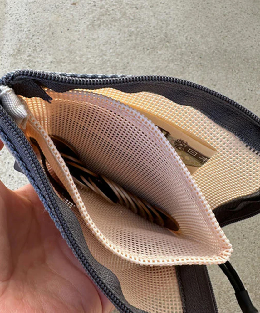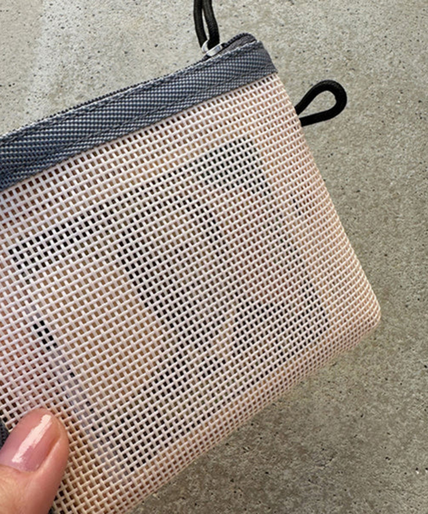 PVC MESH MULTI CASE塩ビでコーティングされた硬めのメッシュ生地を使用したマルチケースです。カードや鍵、小銭などを入れて財布としても使用できます。ファスナーはL字に開くので、出し入れがしやすく中が見えやすいのも便利です。