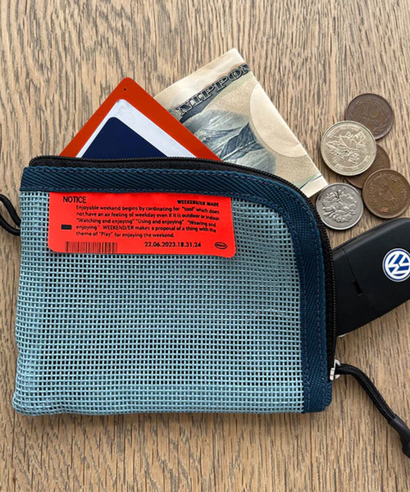 PVC MESH MULTI CASE塩ビでコーティングされた硬めのメッシュ生地を使用したマルチケースです。カードや鍵、小銭などを入れて財布としても使用できます。ファスナーはL字に開くので、出し入れがしやすく中が見えやすいのも便利です。