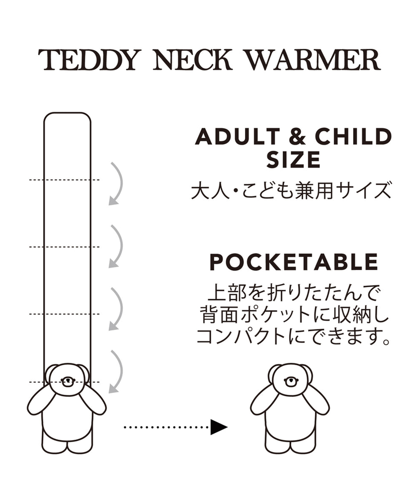 ぬいぐるみたいに可愛いテディネックウォーマー。肌あたりの良いふわさらのファーを使用した、付け心地・温かさが抜群のネックウォーマーです。大人・こども兼用サイズなので親子で使用することもできます。ポケッタブル仕様で、使用しない時はコンパクトにできます 。ポケッタブル状態がまるでくまのぬいぐるみのようでなんとも愛らしい。