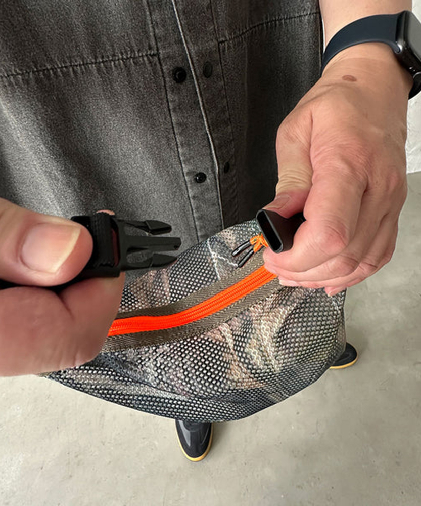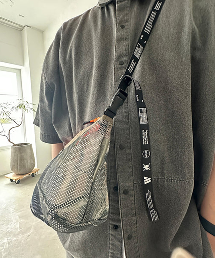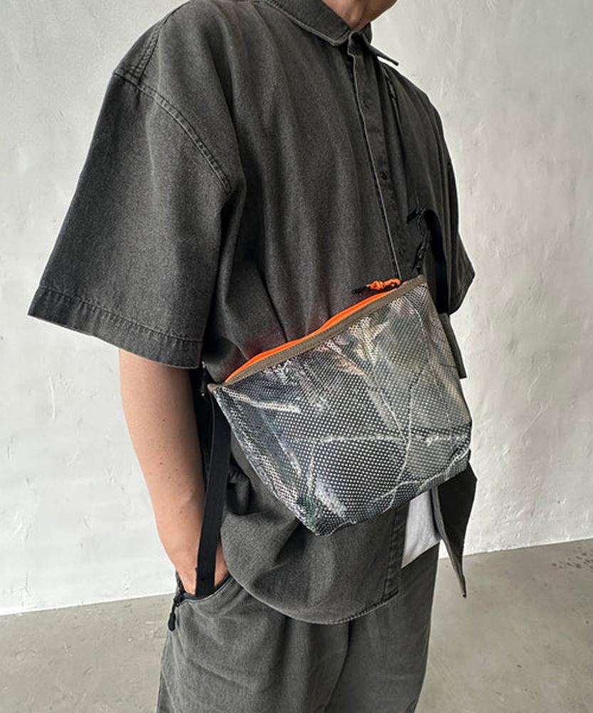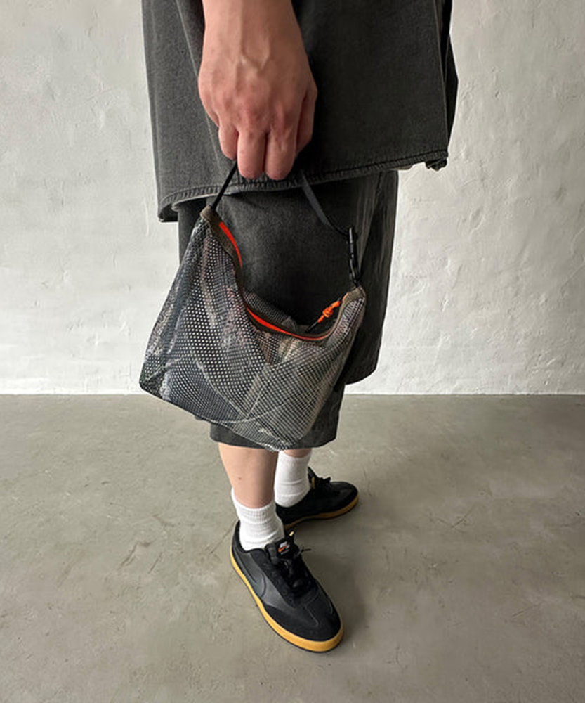 厚手でしなやかな素材感のメッシュ生地を使用した定番のシリーズ。ポーチはファスナー開閉でテープハンドルが付いた仕様。また別売りのMULTI WAVE BELTを付属させる事でショルダーバッグとしても使用可能。
