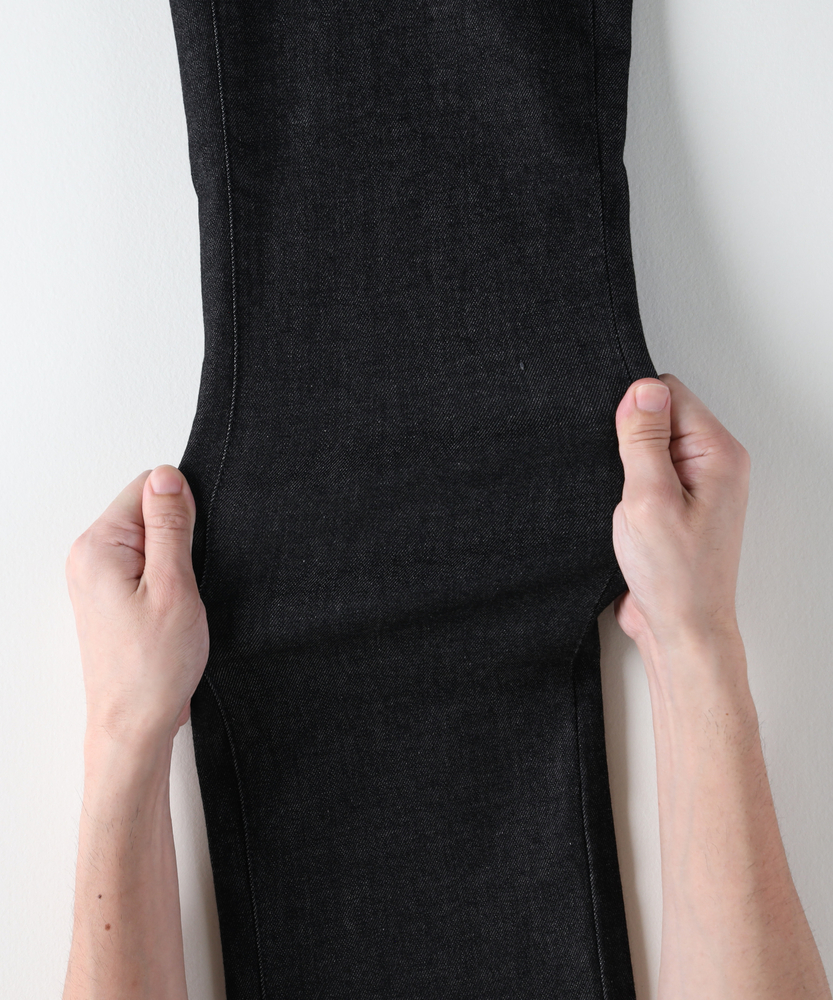 前身をやや小さめに設定し、裾までまっすぐにひかれたパターンは、脚を細くまっすぐ魅せてくれる美脚シルエット。