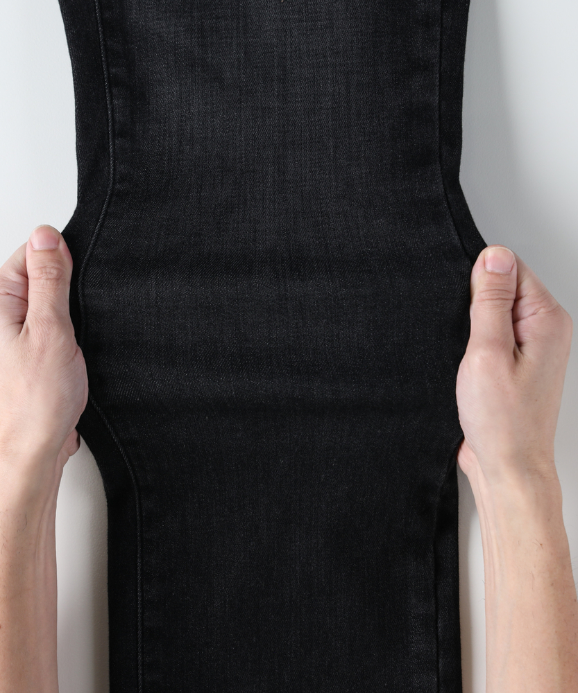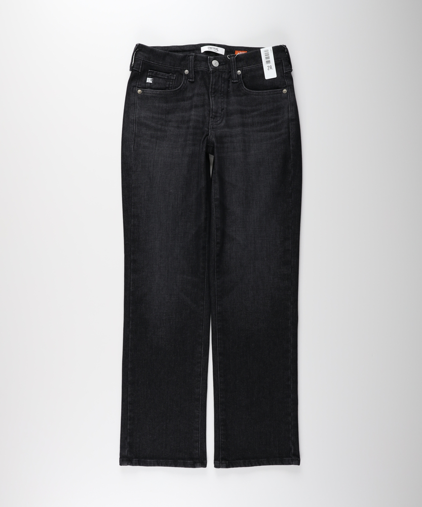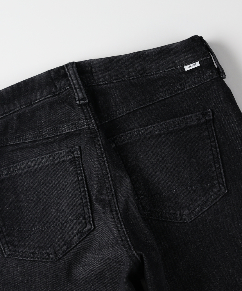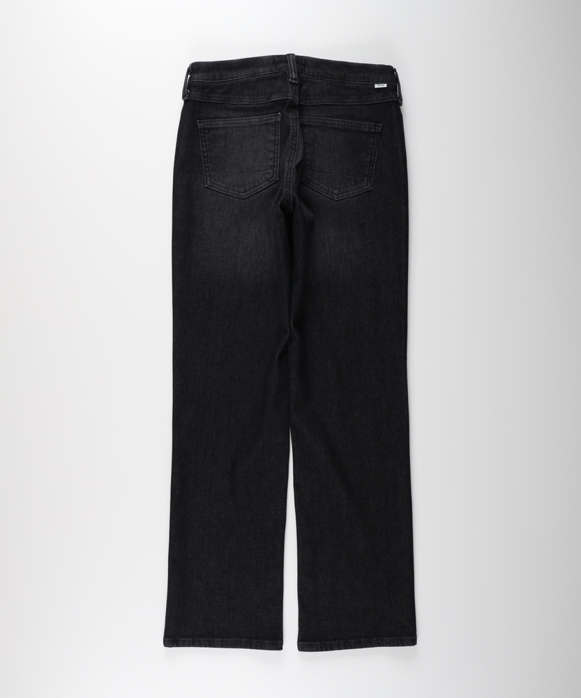 【仕様】程よいウエスト位置からまっすぐ落ちるストレートライン。無駄をそぎ落とした5ポケット仕様とすっきりした股上が、きちんと感と抜け感を同時に叶える都会的な佇まいです。【素材】 微光沢を帯びたしっかりとしたデニム素材を採用。適度なハリで腰まわりを整え、型崩れしにくく日常使いに強い安心感と上品な表情を持ち合わせています。 【スタイリング】 クリーンなモノトーンが軸なので、フォルムのきれいなシャツや柔らかなベージュニットと合わせてコントラストを楽しんで。ヒールで洗練、スニーカーでカジュアルダウンが好バランスです。