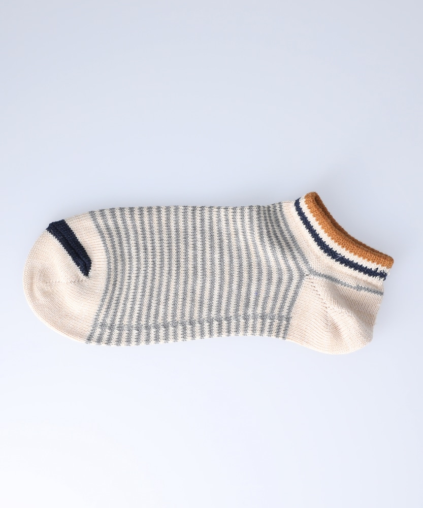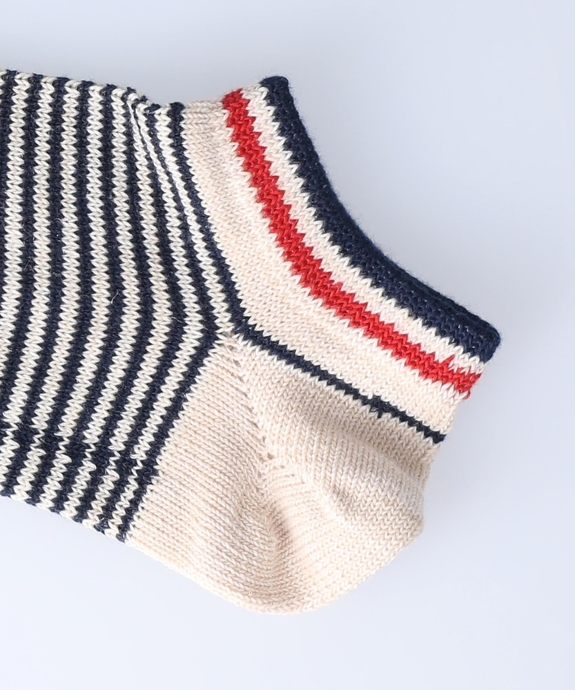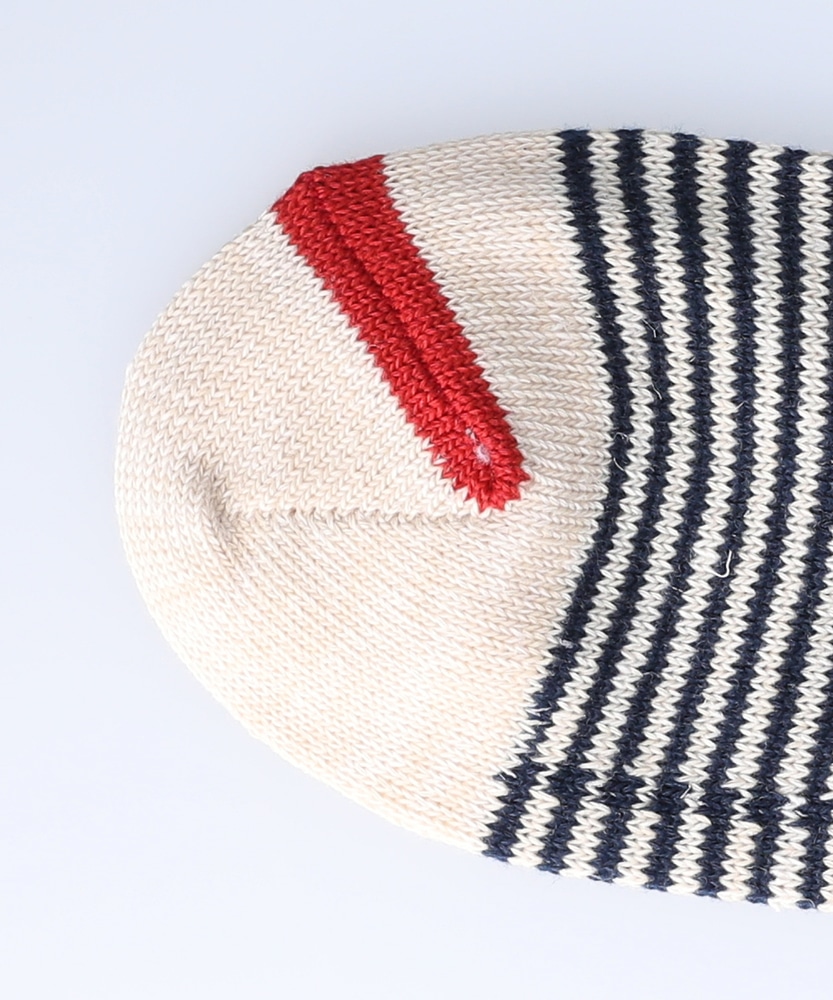 ヘンプ素材でさらっとした肌ざわりと履き心地が楽しめるボーダー柄ソックスです。ネイビーボーダーをベースにキーカラーのレッドとイエローがそれぞれアクセントになっています。 店舗へのお問い合わせ品番:16115100