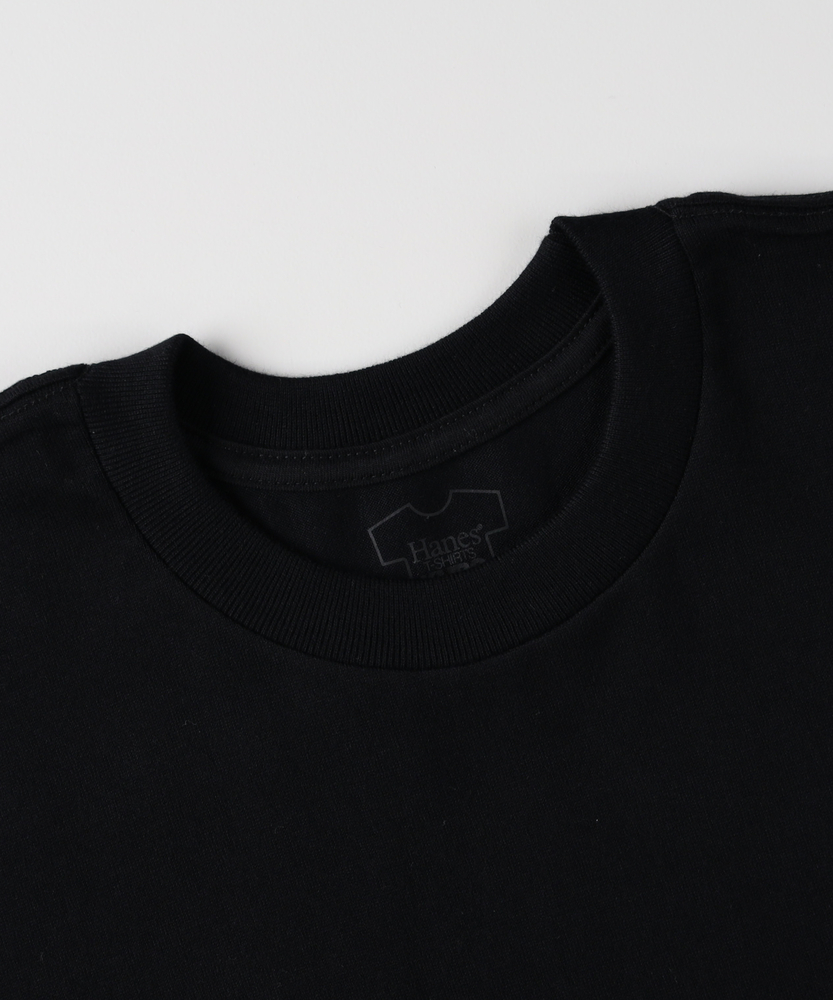 色あせしにくい「先染めBLACK」の深い魅力。厚みと柔らかさを両立したこだわりの7.0オンス。ストレスフリーな着心地で、大人の日常を格上げする。■Point・こだわりの「先染めBLACK」繰り返し着ても色あせしにくい。深みのある黒が長く楽しめる。毛羽立ちが少なく上品な印象に。・頼れる厚みの7.0オンス一枚で着てもサマになる生地。肉厚でしっかりとした安心感。タフに使えるデイリーウェア。・柔らかな綿100%素材赤ラベルの糸を双糸に変更。嵩高で肌に優しい自然な風合い。厚手なのに柔らかい着心地。・ストレスフリーな丸胴仕様脇に縫い目がない筒状の作り。肌への引っかかりを軽減。長時間の着用も快適に。・肌当たりを解消したタグレス襟元のネームをプリントに。チクチクする不快感を排除。見えない部分へのこだわり。・ゆとりのあるシルエット身幅と袖幅にゆとりを確保。アメリカンスタイルの形。体型を拾わずリラックス。【仕様】身幅や袖幅に程よいゆとりを持たせた、アメリカンスタイルのシルエットです。脇に縫い目を持たない丸胴編みを採用し、ストレスフリーな着心地を追求。首裏のネームタグも同色のプリント仕様にするなど、毎日着たくなる細部の工夫が光るミニマルなデザインです。【素材】独自製法による「先染めBLACK」を採用した綿100%素材です。赤ラベルで使われる糸を双糸にして編み立て、7.0オンスのしっかりとした厚みと柔らかな風合いを両立。毛羽立ちが少なく、繰り返し着用しても色あせしにくいのが魅力です。【スタイリング】ゆったりとしたシルエットと深みのある黒で、一枚でデニムやチノパンと合わせるだけで洗練されたカジュアルスタイルが完成します。シャツやジャケットのインナーとして合わせれば、コーディネート全体を引き締めるモダンな大人の装いが楽しめます。