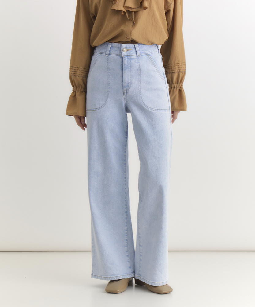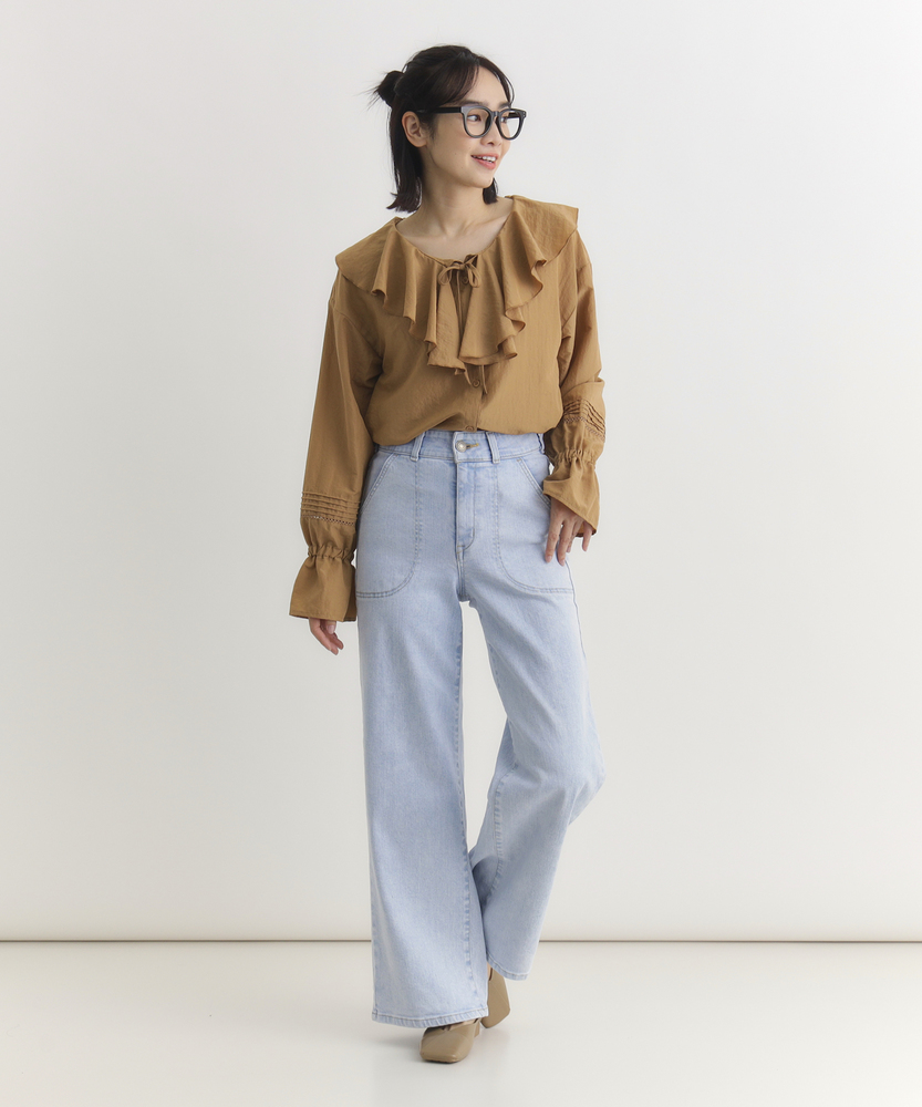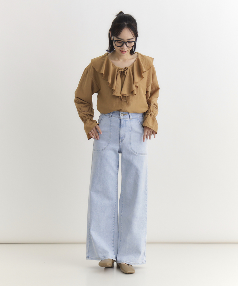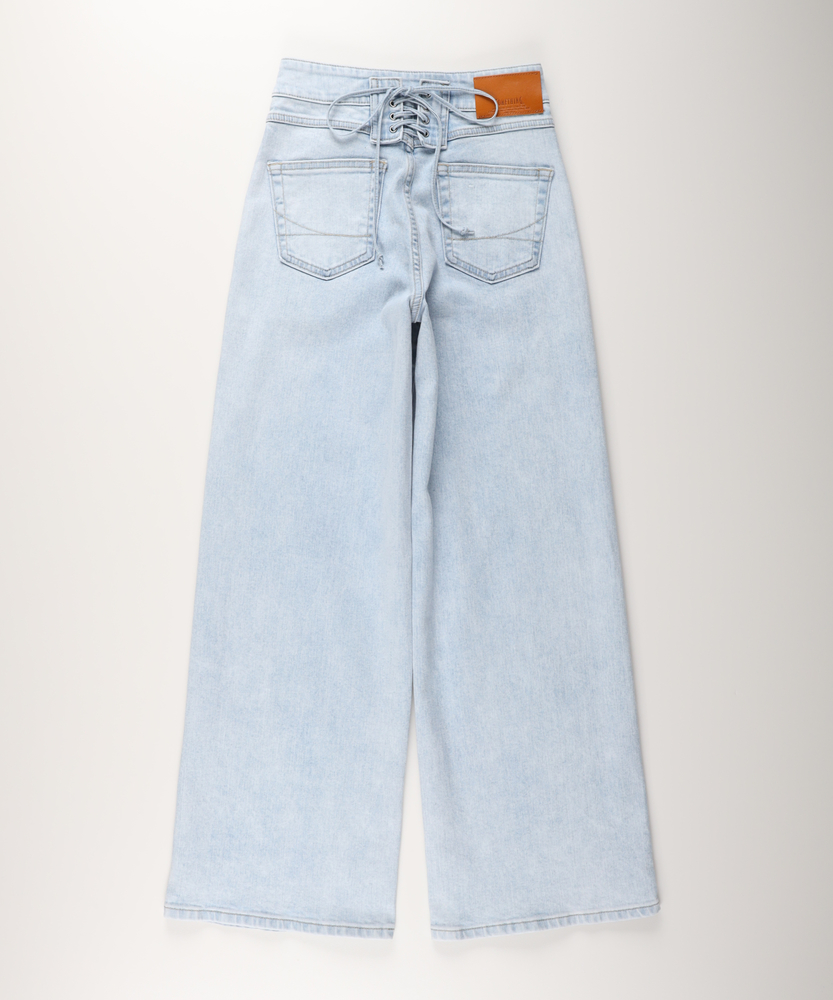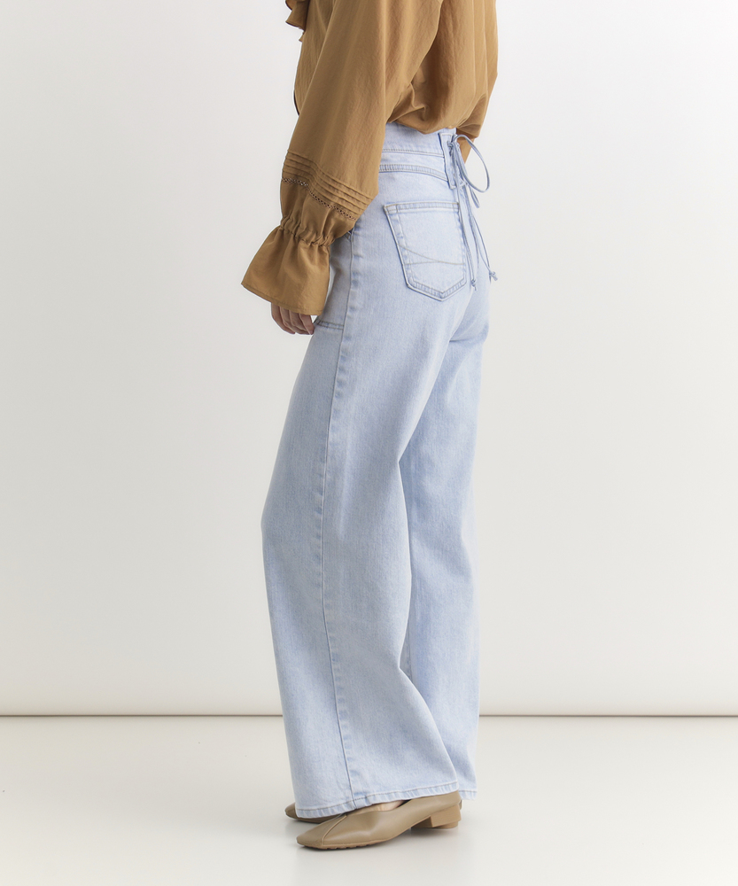 【仕様】フロントにあしらわれた曲線的なパッチポケットが、モダンで優しい表情をつくるワイドデニムです。最大の特徴は、バックスタイルに施されたレースアップディテール。後ろ姿に大人の女性らしいセンシュアルなエッセンスを加えつつ、ウエストのフィット感を調整できる機能性も備えています。腰位置を高く見せるハイライズと、肉感を拾わずストンと落ちる美しいシルエットが、リラックス感の中に洗練されたスタイルアップ効果をもたらします。【素材】 透明感のあるサックスブルーの色合いが、クリーンで爽快な印象を与えます。本格的なデニムの表情を持ちながらも、肌馴染みの良い柔らかな風合いに仕上げており、デイリーに気兼ねなく愛用できる心地よさが魅力です。使い込むほどに味わいが増し、自分だけのヴィンテージへと育っていく過程もお楽しみいただけます。季節を問わず、ワードローブの定番として長く寄り添う一本です。 【スタイリング】 バックコンシャスなデザインを活かすため、薄手のニットやカットソーをウエストインしたスタイリングがおすすめです。微光沢のあるブラウスや、ハリのあるフォルムシャツと合わせれば、カジュアルなデニムスタイルも一気に都会的でソフィスティケートされた印象に。足元はヒールパンプスで女性らしさを底上げしたり、クリーンな白のスニーカーで抜け感を出したりと、その日の気分に合わせた着こなしをお楽しみください。