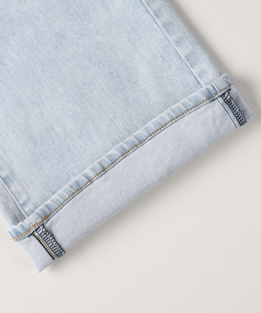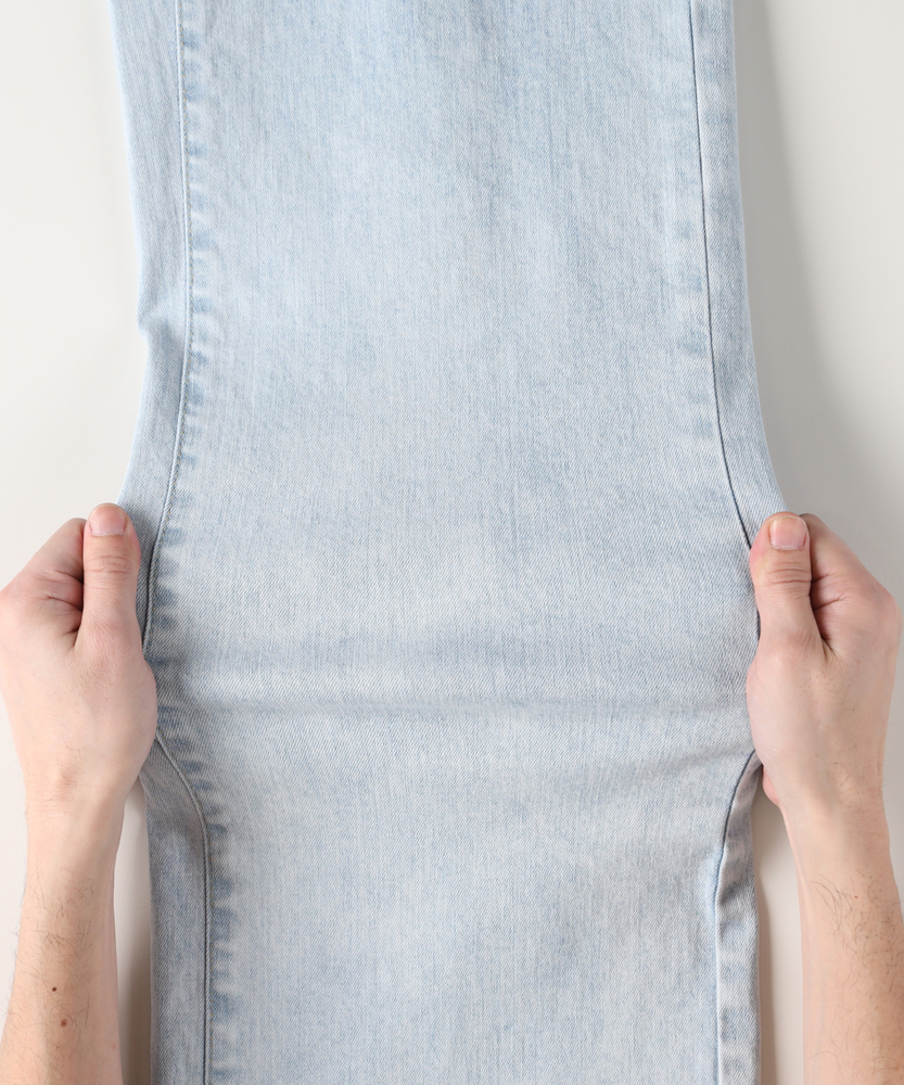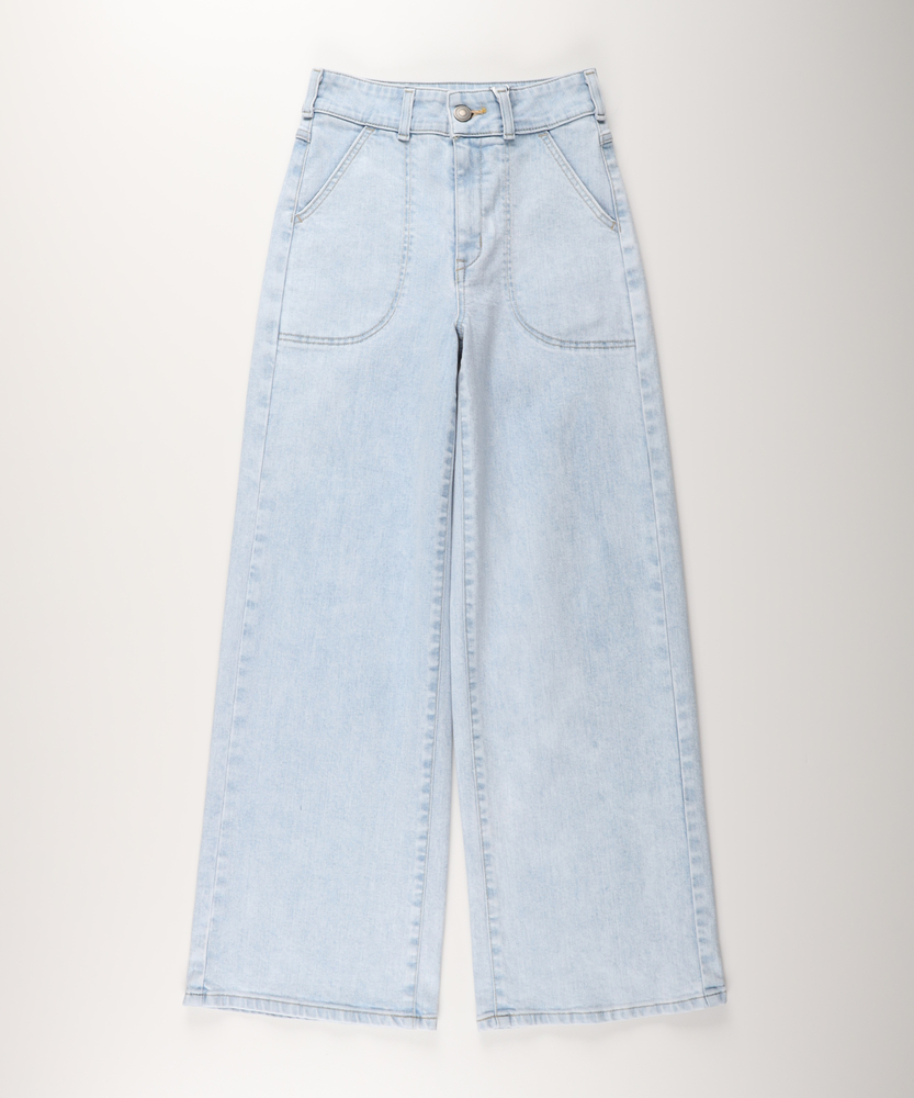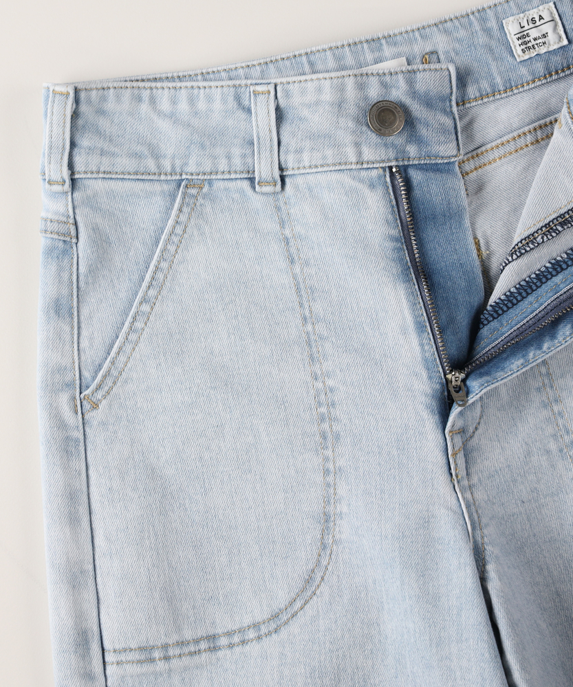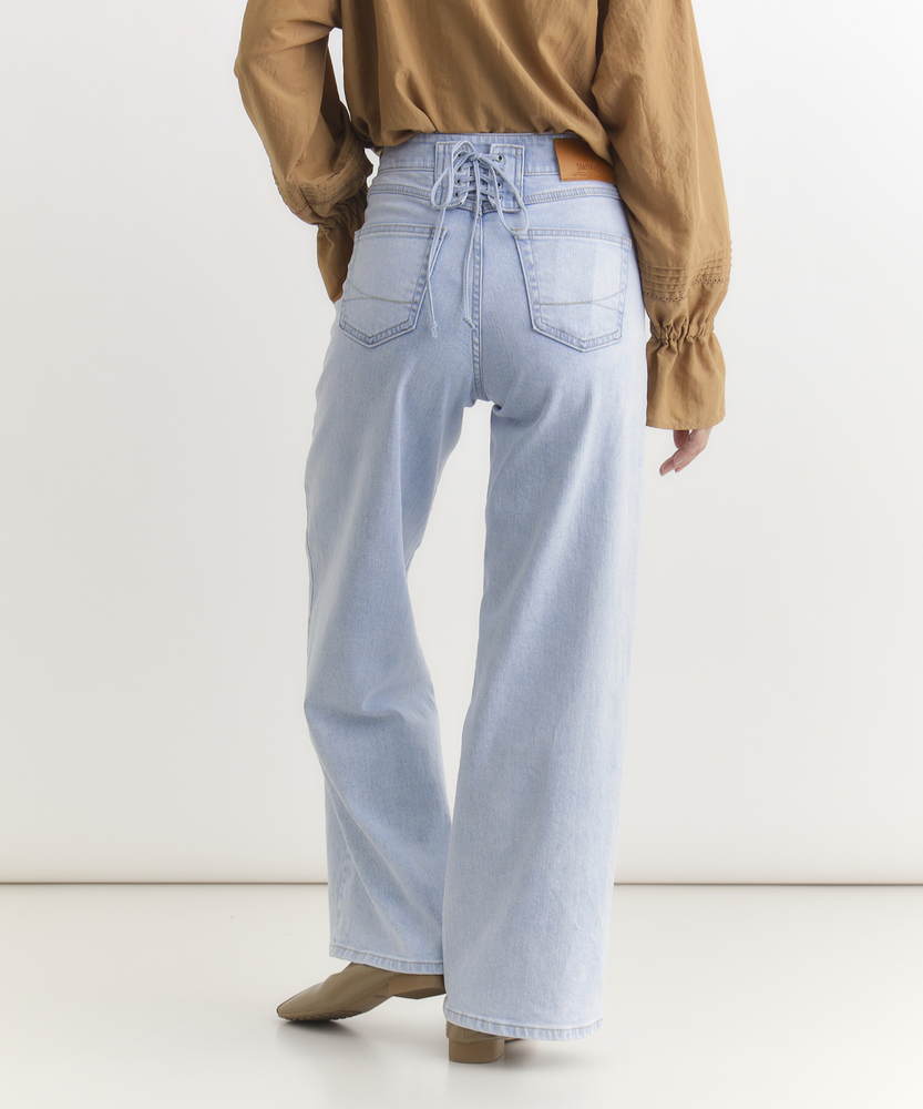 【仕様】フロントにあしらわれた曲線的なパッチポケットが、モダンで優しい表情をつくるワイドデニムです。最大の特徴は、バックスタイルに施されたレースアップディテール。後ろ姿に大人の女性らしいセンシュアルなエッセンスを加えつつ、ウエストのフィット感を調整できる機能性も備えています。腰位置を高く見せるハイライズと、肉感を拾わずストンと落ちる美しいシルエットが、リラックス感の中に洗練されたスタイルアップ効果をもたらします。【素材】 透明感のあるサックスブルーの色合いが、クリーンで爽快な印象を与えます。本格的なデニムの表情を持ちながらも、肌馴染みの良い柔らかな風合いに仕上げており、デイリーに気兼ねなく愛用できる心地よさが魅力です。使い込むほどに味わいが増し、自分だけのヴィンテージへと育っていく過程もお楽しみいただけます。季節を問わず、ワードローブの定番として長く寄り添う一本です。 【スタイリング】 バックコンシャスなデザインを活かすため、薄手のニットやカットソーをウエストインしたスタイリングがおすすめです。微光沢のあるブラウスや、ハリのあるフォルムシャツと合わせれば、カジュアルなデニムスタイルも一気に都会的でソフィスティケートされた印象に。足元はヒールパンプスで女性らしさを底上げしたり、クリーンな白のスニーカーで抜け感を出したりと、その日の気分に合わせた着こなしをお楽しみください。