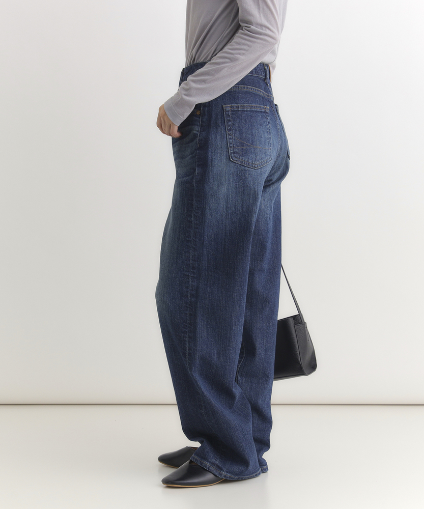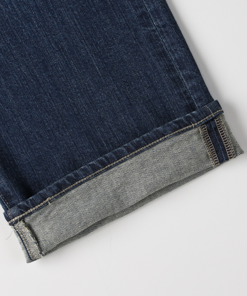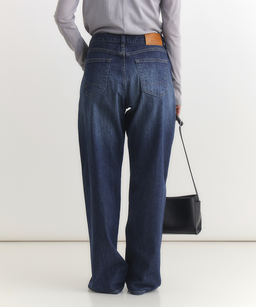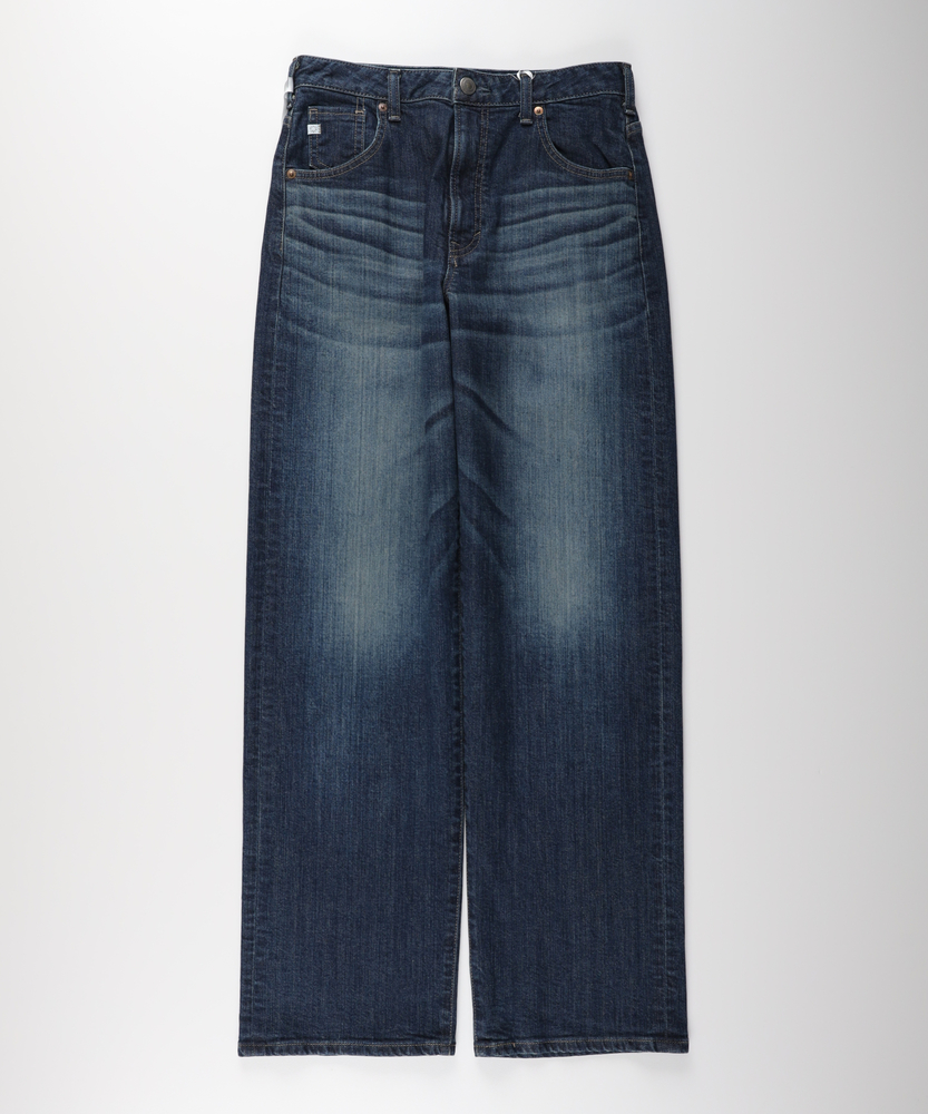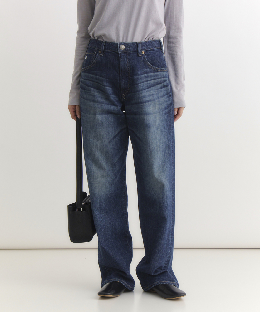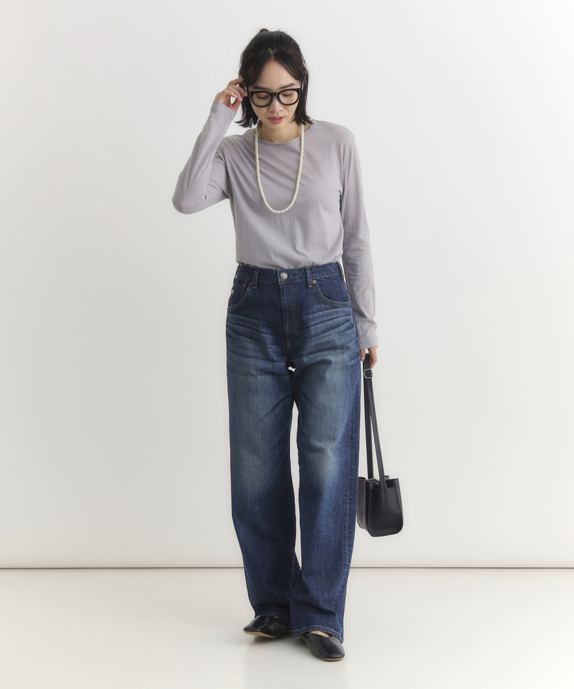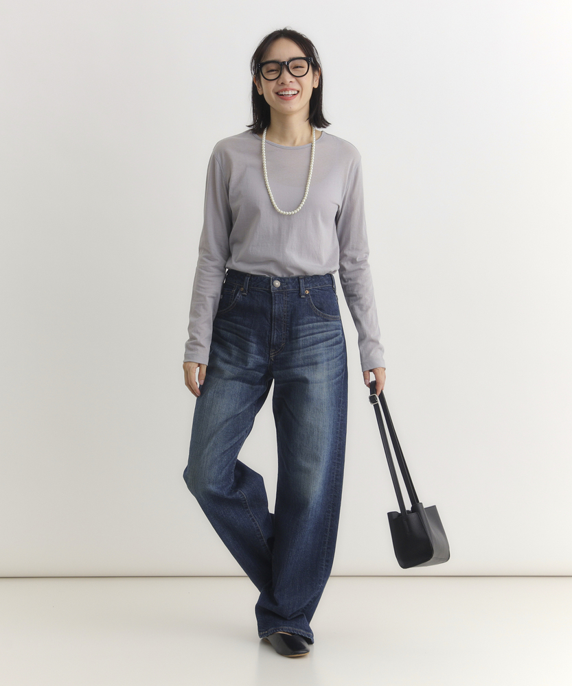 【仕様】リラックス感と洗練されたムードを両立する、絶妙なバランスのルーズストレートシルエット。脚のラインを拾わず、裾に向かってストンと落ちる直線的なラインが、モダンでスタイリッシュな佇まいを演出します。腰位置を高く見せる深めのライズ設計により、トップスインも様になり、履くだけで自然なスタイルアップ効果が期待できる一本です。【素材】 本格的なデニムらしい表情を持ちながら、日常の動きに寄り添うしなやかさを備えています。肉感を拾いにくい適度な厚みとハリ感が、美しいレッグラインを常にキープ。履き込むほどに体に馴染み、味わい深い風合いへと育っていく経年変化も楽しめます。デイリーに気兼ねなく愛用できる、タフさと上質さを兼ね備えたマテリアルです。 【スタイリング】 クリーンな白のフォルムシャツをラフに合わせた、シンプルながらも芯のあるスタイルがおすすめ。足元は華奢なヒールやポインテッドトゥで女性らしさをひとさじ加えると、ルーズなシルエットがいっそう引き立ちます。優しいベージュやモノトーンのトップスでまとめれば、都会的で知的な大人のカジュアルコーディネートが完成します。