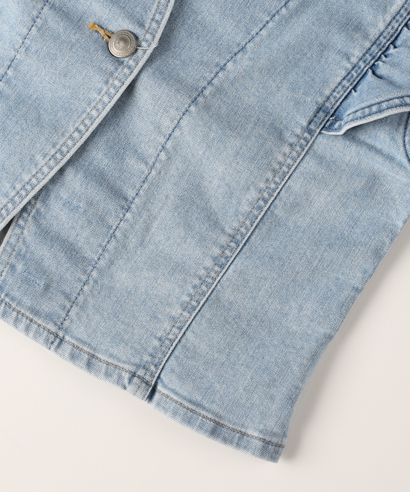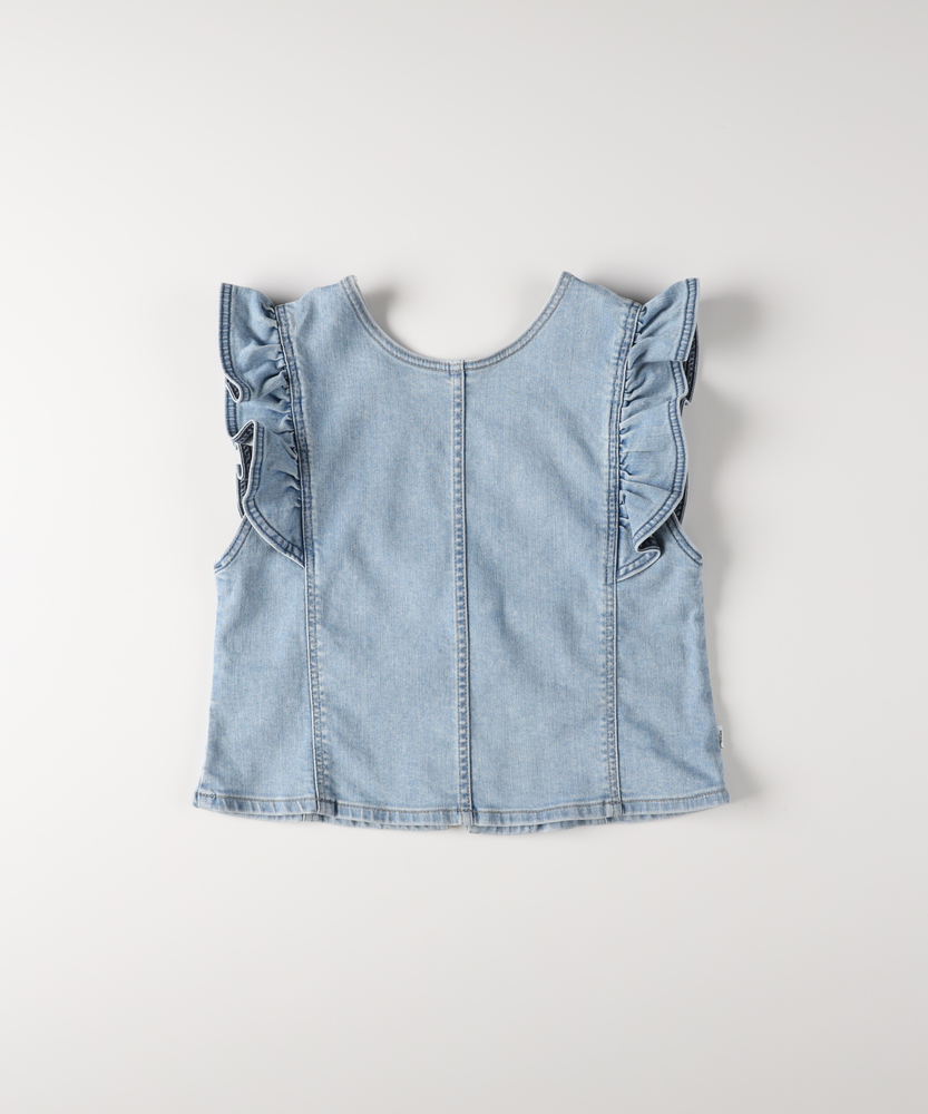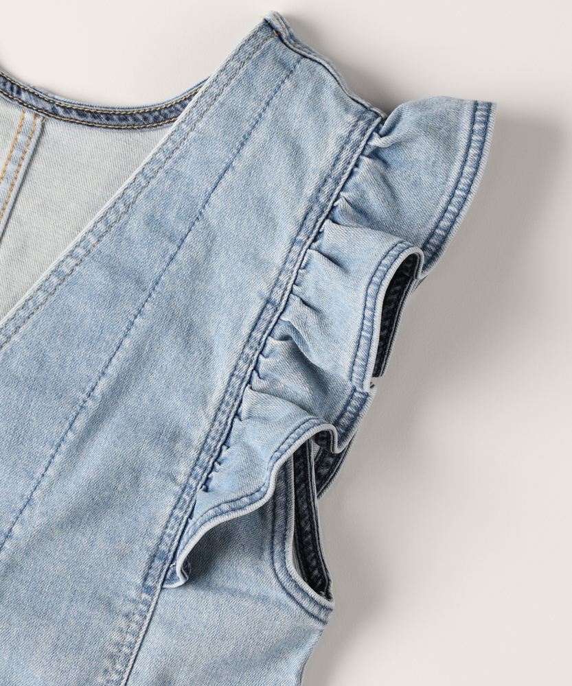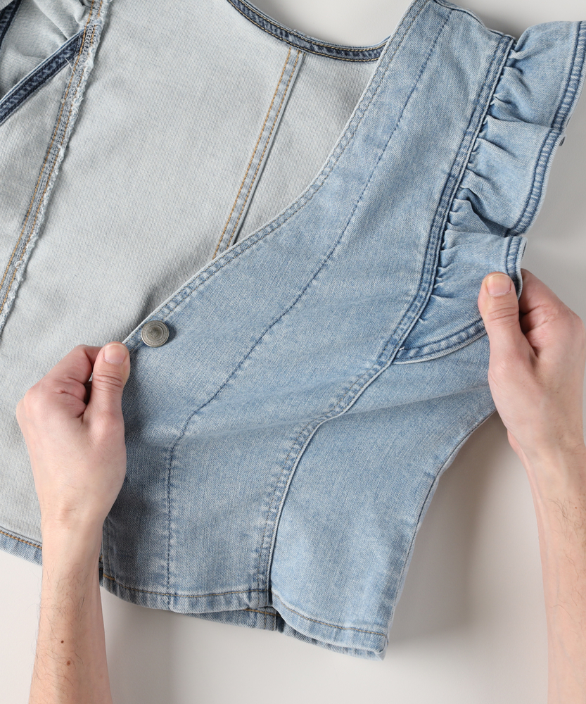 「二の腕」を華奢に見せるフリル。柔らかテンセルで、重ね着も軽やか。■Point・気分で変える「前後2WAY」ボタンを前にしてベスト風に、後ろにしてプルオーバー風に。その日の気分やボトムスに合わせて表情を変えられます。着回しの幅がぐっと広がるデザインです。・二の腕を「フリル」でカバー肩幅をあえて狭く設定することで、華奢見えを実現。ボリュームのあるフリルが視覚的に二の腕をカバーし、「隠したいけれど、オシャレもしたい」を叶えます。・素肌に馴染む「柔らかさ」タテ糸に植物由来のテンセル繊維を使用。デニム特有のゴワつきを抑えた、柔らかい風合い。長時間着ていてもストレスフリーな着心地です。・マンネリコーデを「一新」いつものTシャツやワンピースに重ねるだけ。手持ちのアイテムにプラスワンするだけで、一気にトレンド感のあるレイヤードスタイルが完成します。【デザイン】肩のフリルがフェミニンなアクセントになりつつ、甘くなりすぎない絶妙なバランスが魅力です。Vネックラインはデコルテをすっきりと見せ、前後2WAY仕様で着こなしの自由度を高めました。ボディラインに程よく沿うシルエットが、大人の女性らしいメリハリを作ります。【素材】タテ糸にテンセルを使用することで、しなやかで滑らかな肌触りを実現しました。見た目は本格的なデニムの表情を持ちながら、非常に軽量で柔らかいのが特徴です。通気性も良く、インナー次第でオールシーズン快適に着用いただけます。洗うごとに馴染んでいく風合いの変化もお楽しみください。【スタイリング】シンプルな白Tシャツやタンクトップの上に重ねるだけで、こなれた大人カジュアルが完成します。同系色のデニムパンツと合わせた「セットアップ風」の着こなしも、素材が柔らかいためハードになりすぎずおすすめ。ワンピースの上からレイヤードしてウエスト位置を高く見せれば、スタイルアップ効果も期待できます。