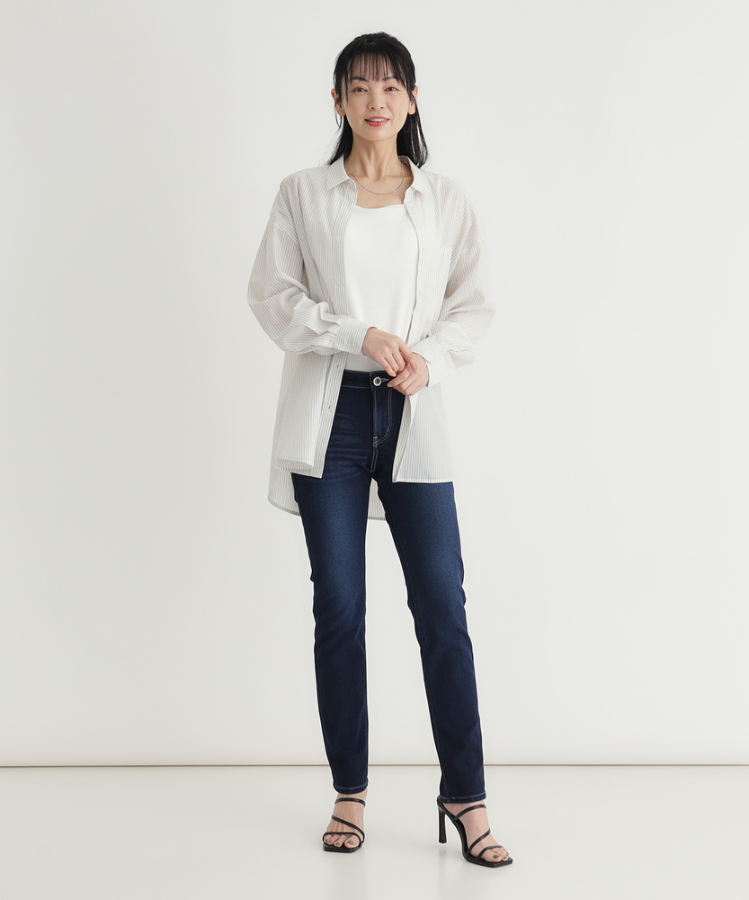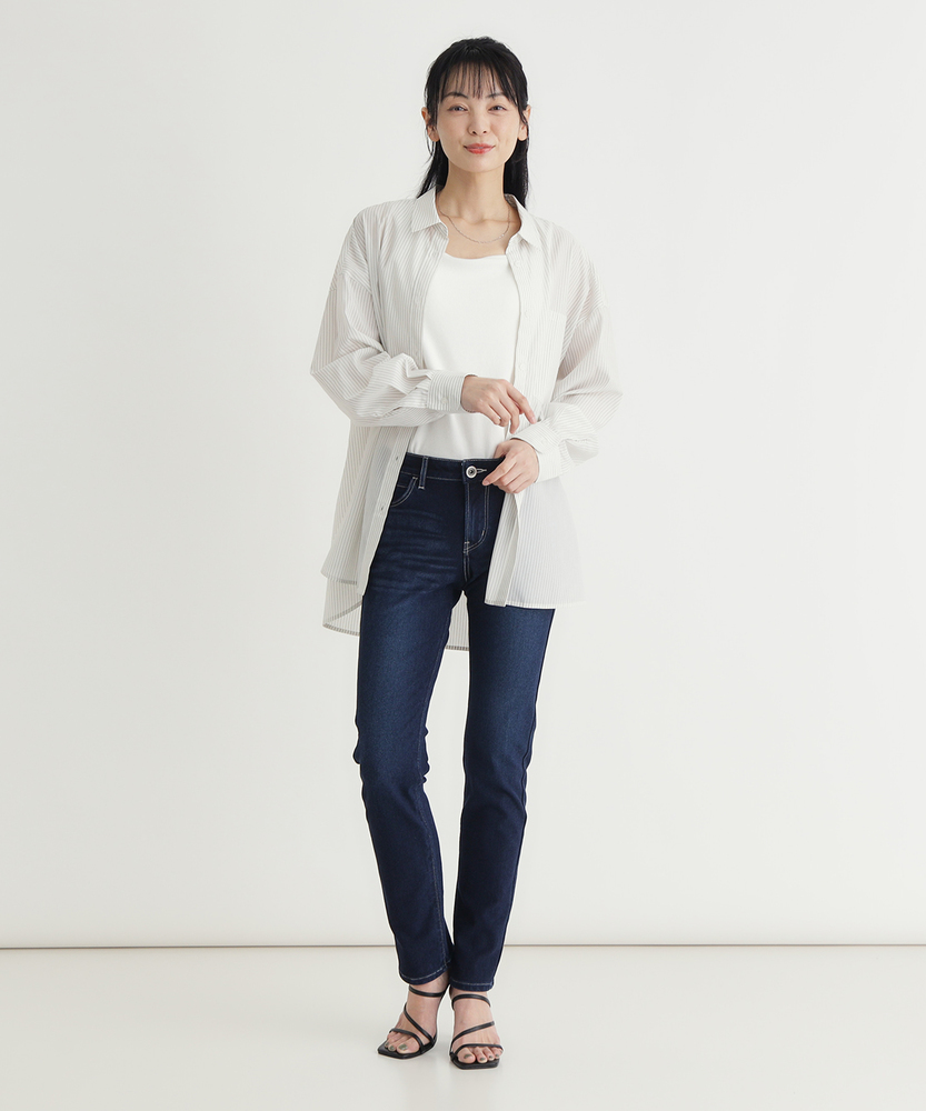 夏も快適に美脚を叶える。涼やかスリムストレート。計算されたシルエットで、大人の余裕を漂わせて。国産ジーンズの誇りが宿る、洗練の日常着。■Point・涼やかな着用感で快適に暑い季節も爽やかに着用。不快感を抑えた軽快な穿き心地。毎日選びたくなる心地よさ。・脚をまっすぐ見せる美脚ラインふくらはぎを拾いにくい設計。すっきりとしたストレート。スマートな印象を与えます。・立体感を生むウォッシュ加工太もも部分の自然な色落ち。脚をほっそりと見せる効果。こなれた雰囲気を演出します。・ヒップアップ効果のポケットやや高めに配置されたポケット。ヒップ位置を高く見せます。印象的なステッチがアクセント。・引き締め効果のダークカラー深みのあるネイビーを採用。カジュアルからキレイめまで。幅広いシーンにマッチします。・安心と信頼の国産ブランド日本人の体型を知り尽くした。長年の技術が詰まった仕上がり。長く愛用できる確かな品質。【仕様】日本人の体型を知り尽くしたブランドが提案する、洗練されたスリムストレートシルエットです。太もも周辺に施された自然なウォッシュ加工が、脚のラインに立体感を与え、すっきりとした細見え効果を発揮します。高めに配置されたバックポケットと印象的なステッチが、後ろ姿まで美しく演出するこだわりのデザインです。【素材】暑い季節でも快適に過ごせる、涼やかな穿き心地が最大の魅力です。ごわつきを抑えたしなやかな風合いで、脚を通した瞬間から軽快さを実感していただけます。深みのあるダークネイビーの色合いが、カジュアルなデニムスタイルに大人の上品さと落ち着きをプラスし、日常使いに最適な仕上がりになっています。【スタイリング】細身の美しいシルエットを活かし、ふんわりとしたボリューム袖のブラウスやチュニックと合わせたメリハリのあるスタイリングがおすすめです。足元に華奢なサンダルやパンプスを合わせることで、より女性らしさが引き立ちます。シンプルなTシャツを軽くタックインすれば、こなれ感のある大人のカジュアルが完成します。【EDWIN】日本が誇る国産ジーンズブランド。1947年より米軍払い下げ衣料の卸を行っていた常見米八商店は、日本人の体型に合ったジーンズを自分たちの手で作るべく1961年に「EDWIN」のレーベルを冠した、初の国産ジーンズを作った。国産の品質と常に新しいものを生み出し続ける探究心は、海外の愛好家からも高い評価を得ています。