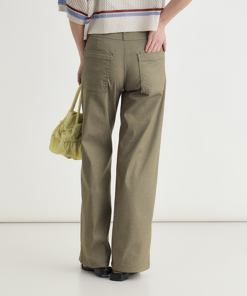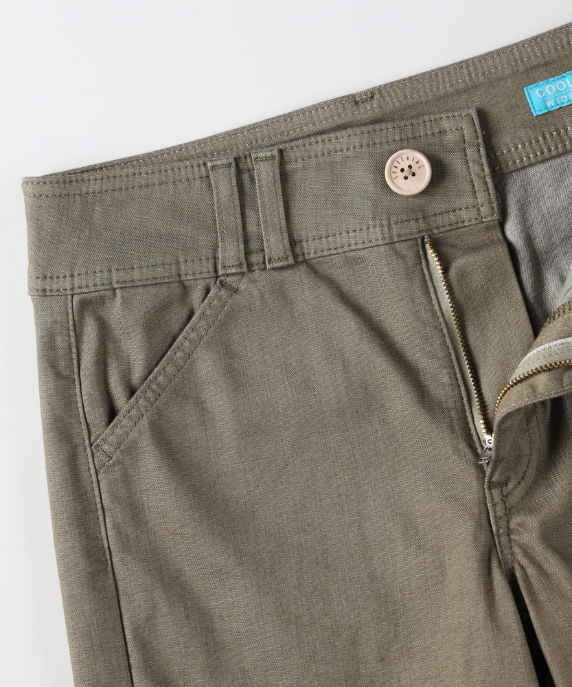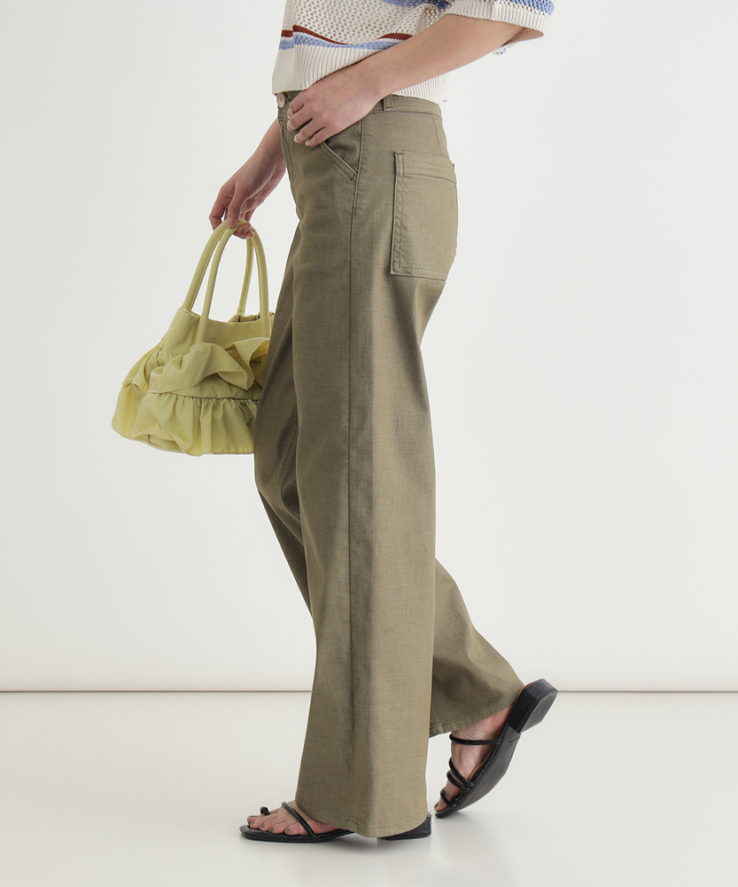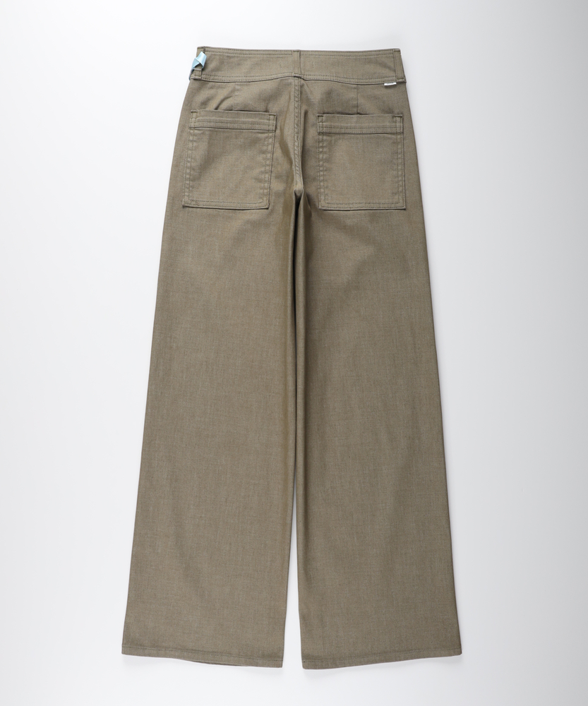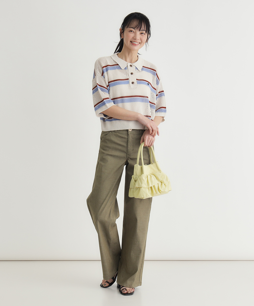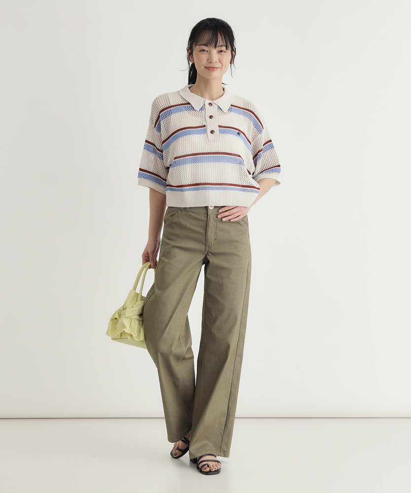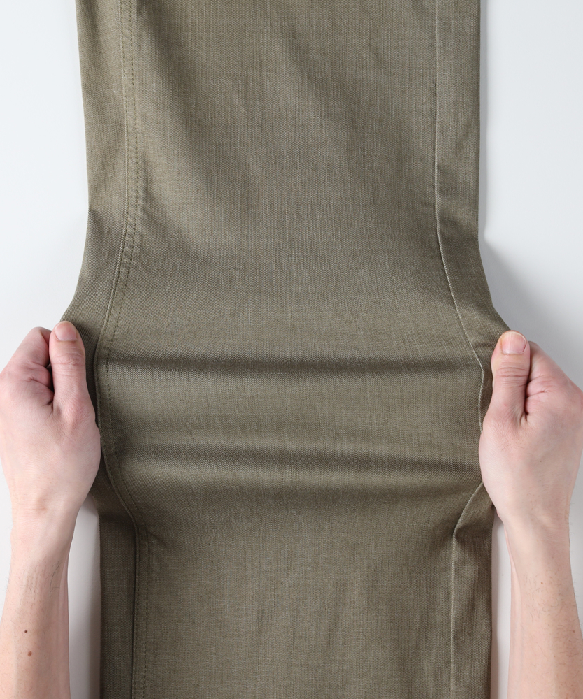 肌馴染みの良いニュアンスカラーで、大人の夏を上品に。涼しさと体型カバーを両立する、洗練の美脚セミワイド。さらりと快適。汗ばむ季節も心地よく、スマートな日常へ。■Point・真夏も快適なDOBBY素材通気性に優れたストレッチ素材。暑い日も蒸れにくく快適です。さらりとした心地よさが続きます。・汗ばむ日もベタつかない凹凸感のある生地組織を採用。肌との接着面を少なくしました。不快な張り付きを抑えサラサラに。・肉感を拾わない安心のハリ感生地の膨らみで程よいハリをキープ。気になる脚のラインをすっぽりカバー。薄手なのに安心感のあるシルエット。・スタイルアップを叶える設計腰周りをコンパクトに仕上げました。ワイドベルトでウエストをマーク。腰位置を高く見せ、脚長効果を演出。・涼しげな木製ボタンのアクセントフロントには大きめの木製ボタン。ナチュラルで軽快な印象をプラス。タックイン時のさりげないポイントに。・上品なニュアンスカラー肌馴染みの良い落ち着いたトーン。大人のリラックス感を演出します。どんな色とも合わせやすく万能です。【仕様】腰周りをコンパクトにまとめた、ミッドライズのすっきりとしたセミワイドシルエットです。太めのワイドベルトデザインがウエストラインを際立たせ、腰位置を高く見せることでスタイルアップを演出。フロントのベイカー風ポケットと大きめな木製ボタンが、上品なニュアンスカラーにナチュラルな抜け感を加えます。【素材】糸の間に隙間を持たせた「DOBBY組織」のストレッチ素材を採用しています。優れた通気性と凹凸のある織り目により、肌離れが良くさらっとした肌触りを実現しました。薄手で軽やかながらも、織りによる生地の膨らみが程よいハリを生み出し、気になる体の肉感を拾いにくいのが大人の女性に嬉しいポイントです。【スタイリング】広がりすぎないセミワイドと柔らかなカラーは、どんなトップスとも品良くまとまります。ウエストの木製ボタンを活かしたタックインスタイルはもちろん、チュニック丈を合わせても着太りせずスマートな印象に。足元はサンダルで涼しげにまとめれば、肩の力を抜いた洗練されたサマースタイルが完成します。【SOMETHING】女性のためのジーンズとして1979年に誕生以来、「女の子はかならずきれいになる。」をコンセプトに国内生産を中心にしたモノづくりでどこから見ても美しい、日本の女性のためのジーンズを追求し、進化し続けています。シンプルでミニマルな、ホンモノの美しさを探求しています。