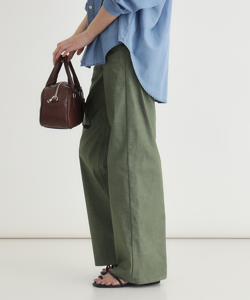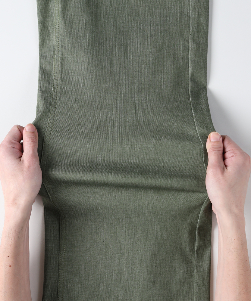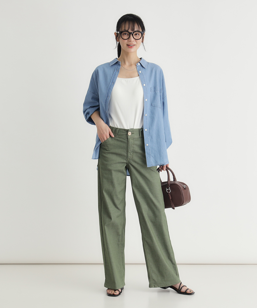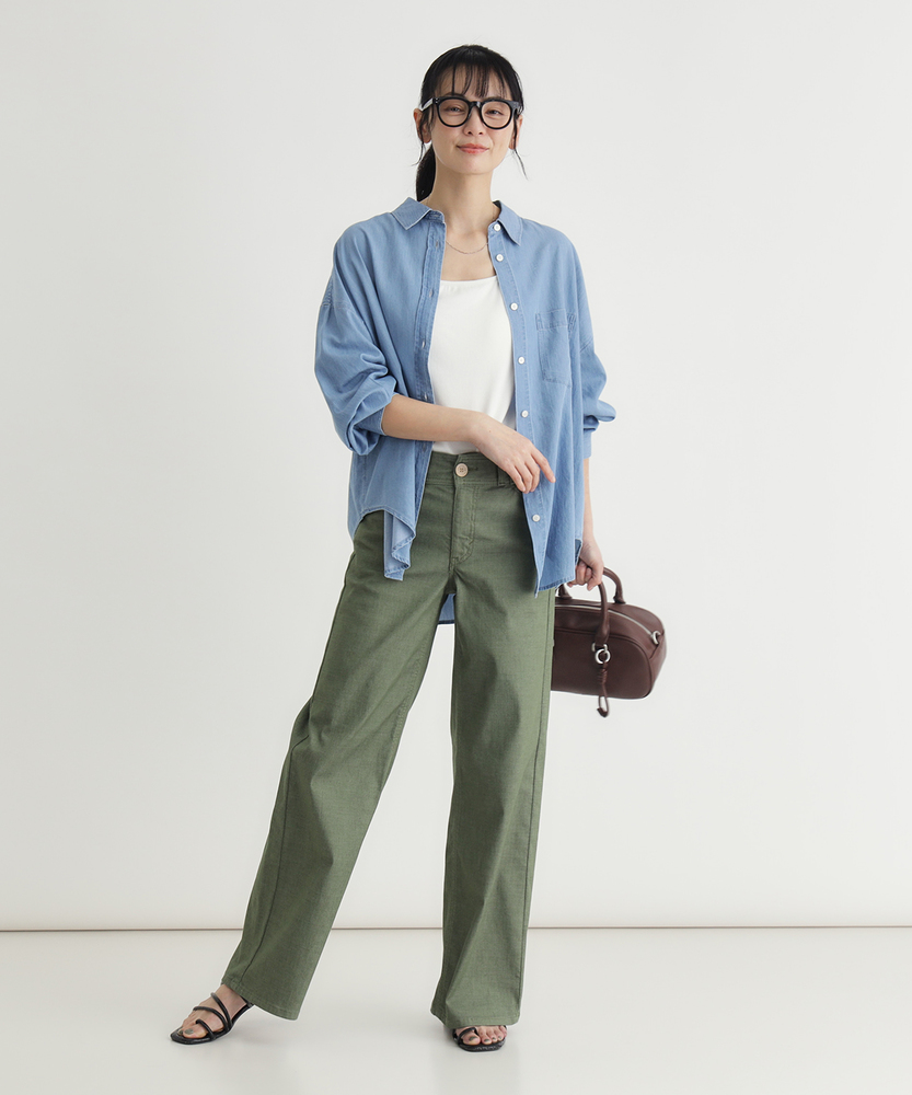 こなれ感漂うアースカラーで大人の夏支度。涼しさと体型カバーを叶える美脚セミワイド。さらりと快適。汗ばむ季節も心地よく、スマートに。■Point・真夏も快適なDOBBY素材通気性に優れたストレッチ素材。暑い日も蒸れにくく快適です。さらりとした心地よさが続きます。・汗ばむ日もベタつかない凹凸感のある生地組織を採用。肌との接着面を少なくしました。不快な張り付きを抑えサラサラに。・肉感を拾わない安心のハリ感生地の膨らみで程よいハリをキープ。気になる脚のラインをすっぽりカバー。薄手なのに安心感のあるシルエット。・スタイルアップを叶える設計腰周りをコンパクトに仕上げました。ワイドベルトでウエストをマーク。腰位置を高く見せ、脚長効果を演出。・涼しげな木製ボタンのアクセントフロントには大きめの木製ボタン。ナチュラルで軽快な印象をプラス。タックイン時のさりげないポイントに。・こなれ感を生む洗練カラー落ち着いたアースカラーを採用。カジュアルな中にも大人の品格を。日々のコーデにこなれ感をプラス。【仕様】腰周りをコンパクトにまとめた、ミッドライズのすっきりとしたセミワイドシルエットです。太めのワイドベルトデザインがウエストラインを際立たせ、腰位置を高く見せることでスタイルアップを演出。フロントのベイカー風ポケットと大きめな木製ボタンが、こなれ感漂うアースカラーにナチュラルで軽やかなアクセントを加えます。【素材】糸の間に隙間を持たせた「DOBBY組織」のストレッチ素材を採用しています。優れた通気性と凹凸のある織り目により、肌離れが良くさらっとした肌触りを実現しました。薄手で軽やかながらも、織りによる生地の膨らみが程よいハリを生み出し、気になる体の肉感を拾いにくいのが大人の女性に嬉しいポイントです。【スタイリング】広がりすぎないセミワイドと落ち着いたアースカラーの組み合わせは、いつものコーデをぐっと大人っぽく格上げします。ウエストの木製ボタンを活かしたタックインスタイルはもちろん、チュニック丈を合わせても着太りせずスマートな印象に。白Tシャツで爽やかに、黒ブラウスでシックにと、幅広いスタイリングを楽しめます。【SOMETHING】女性のためのジーンズとして1979年に誕生以来、「女の子はかならずきれいになる。」をコンセプトに国内生産を中心にしたモノづくりでどこから見ても美しい、日本の女性のためのジーンズを追求し、進化し続けています。シンプルでミニマルな、ホンモノの美しさを探求しています。