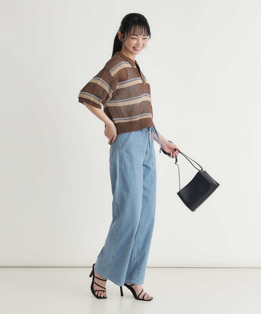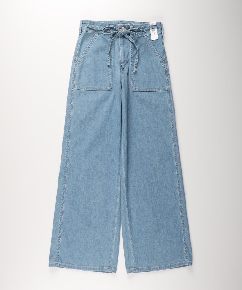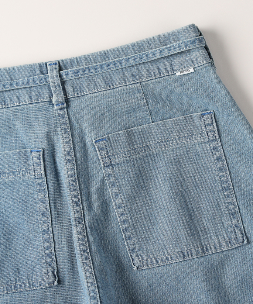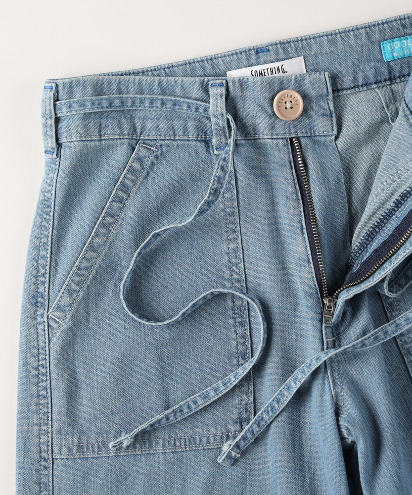 夏の毎日に寄り添う、軽やかな穿き心地。シルエットで魅せる、大人のこなれワイド。どこから見ても美しい、女性のためのデイリーボトム。■Point・美しいワイドシルエット脚のラインをすっぽりカバー。ゆったりとリラクシーな穿き心地。美しいバランスを叶えるこだわり設計。・印象的なベイカーポケットフロントの大きなパッチポケット。気になる腰回りをすっきりと見せます。カジュアルなこなれ感を引き立てる仕様。・メリハリを生むウエストリボン共布の華やかなリボンがアクセント。ウエスト位置を高く見せるデザイン。自然なスタイルアップ効果が期待できます。・夏に嬉しい軽やかな風合い気温が高い日も快適に過ごせる生地感。風をはらむような柔らかなテクスチャー。日常に寄り添うストレスフリーな着用感。・後ろ姿も抜かりなく綺麗にバックにもパッチポケットを配置。ヒップラインをさりげなくカバーします。バックスタイルも美しく見せる工夫。・清涼感あふれる爽やかなカラー見た目にも涼しげなライトな色合い。夏の陽射しに映える明るいトーン。大人のカジュアルコーデに馴染む発色。【仕様】フロントとバックに配置された大きめのパッチポケットが目を惹く、カジュアルなワイドシルエットのボトムスです。ウエストには共布のリボンがあしらわれ、女性らしいアクセントをプラスしつつ、メリハリのある美しいスタイルを演出します。脚のラインを拾わず、リラックス感と洗練された印象を両立させたデザインです。【素材】気温が高くなる季節にも心地よく穿ける、薄手で軽やかな風合いの生地を採用しています。歩くたびにしなやかに揺れる柔らかな肌触りが、一日中ストレスフリーな着用感を実現。見た目にも涼しげな爽やかなカラーリングが、大人のカジュアルスタイルに清涼感とリラックスしたムードをもたらします。【スタイリング】シンプルなTシャツやノースリーブをインして、ウエストのリボンを見せるスタイリングがおすすめです。腰回りから裾にかけての美しいラインが際立ち、自然なスタイルアップを叶えます。足元は軽やかなサンダルやスニーカーで抜け感を作り、気負わない大人のリラクシーな休日コーディネートをお楽しみください。【SOMETHING】女性のためのジーンズとして1979年に誕生以来、「女の子はかならずきれいになる。」をコンセプトに国内生産を中心にしたモノづくりでどこから見ても美しい、日本の女性のためのジーンズを追求し、進化し続けています。シンプルでミニマルな、ホンモノの美しさを探求しています。