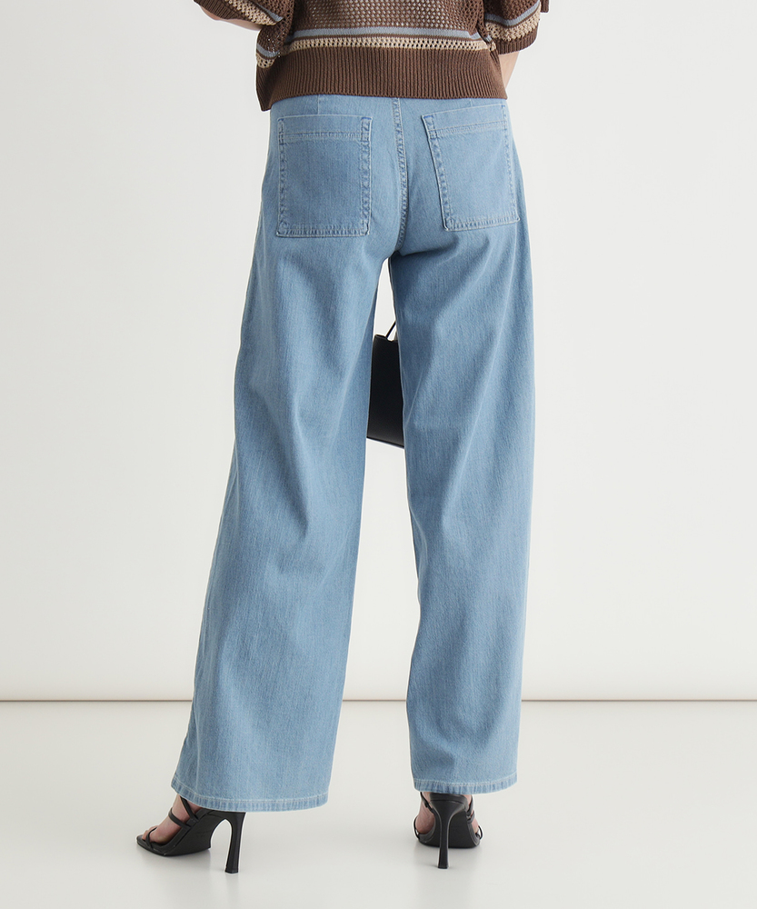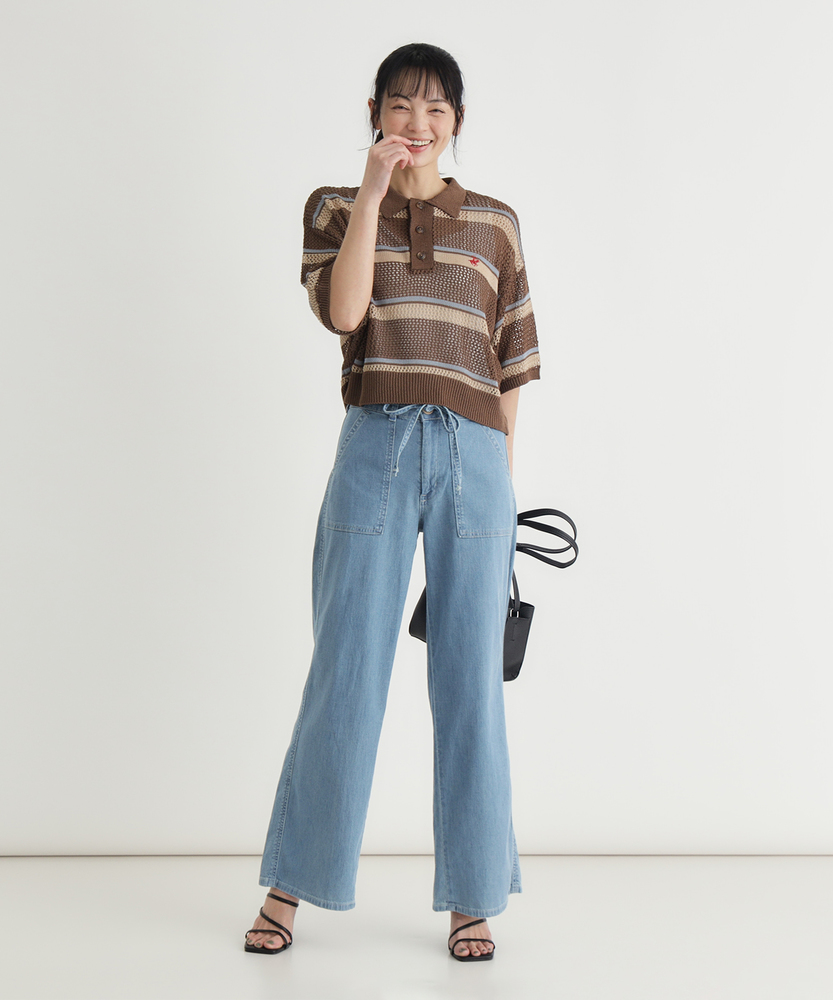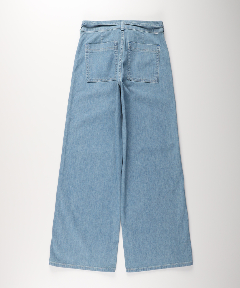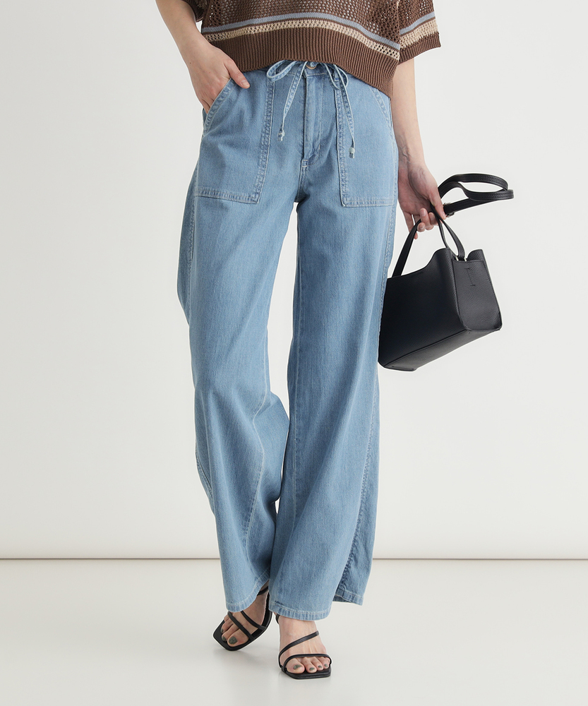 夏の毎日に寄り添う、軽やかな穿き心地。シルエットで魅せる、大人のこなれワイド。どこから見ても美しい、女性のためのデイリーボトム。■Point・美しいワイドシルエット脚のラインをすっぽりカバー。ゆったりとリラクシーな穿き心地。美しいバランスを叶えるこだわり設計。・印象的なベイカーポケットフロントの大きなパッチポケット。気になる腰回りをすっきりと見せます。カジュアルなこなれ感を引き立てる仕様。・メリハリを生むウエストリボン共布の華やかなリボンがアクセント。ウエスト位置を高く見せるデザイン。自然なスタイルアップ効果が期待できます。・夏に嬉しい軽やかな風合い気温が高い日も快適に過ごせる生地感。風をはらむような柔らかなテクスチャー。日常に寄り添うストレスフリーな着用感。・後ろ姿も抜かりなく綺麗にバックにもパッチポケットを配置。ヒップラインをさりげなくカバーします。バックスタイルも美しく見せる工夫。・清涼感あふれる爽やかなカラー見た目にも涼しげなライトな色合い。夏の陽射しに映える明るいトーン。大人のカジュアルコーデに馴染む発色。【仕様】フロントとバックに配置された大きめのパッチポケットが目を惹く、カジュアルなワイドシルエットのボトムスです。ウエストには共布のリボンがあしらわれ、女性らしいアクセントをプラスしつつ、メリハリのある美しいスタイルを演出します。脚のラインを拾わず、リラックス感と洗練された印象を両立させたデザインです。【素材】気温が高くなる季節にも心地よく穿ける、薄手で軽やかな風合いの生地を採用しています。歩くたびにしなやかに揺れる柔らかな肌触りが、一日中ストレスフリーな着用感を実現。見た目にも涼しげな爽やかなカラーリングが、大人のカジュアルスタイルに清涼感とリラックスしたムードをもたらします。【スタイリング】シンプルなTシャツやノースリーブをインして、ウエストのリボンを見せるスタイリングがおすすめです。腰回りから裾にかけての美しいラインが際立ち、自然なスタイルアップを叶えます。足元は軽やかなサンダルやスニーカーで抜け感を作り、気負わない大人のリラクシーな休日コーディネートをお楽しみください。【SOMETHING】女性のためのジーンズとして1979年に誕生以来、「女の子はかならずきれいになる。」をコンセプトに国内生産を中心にしたモノづくりでどこから見ても美しい、日本の女性のためのジーンズを追求し、進化し続けています。シンプルでミニマルな、ホンモノの美しさを探求しています。