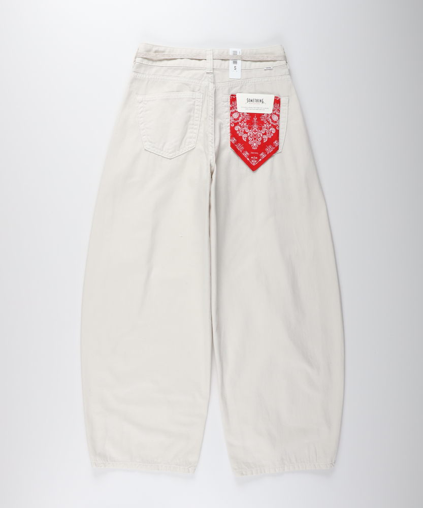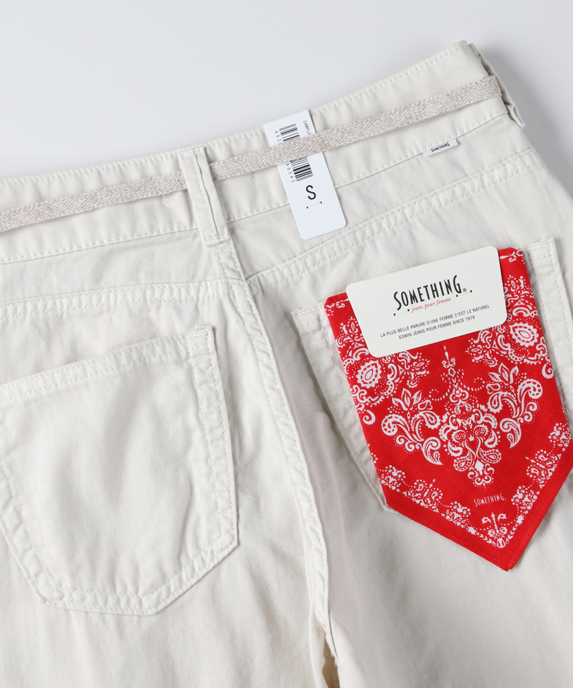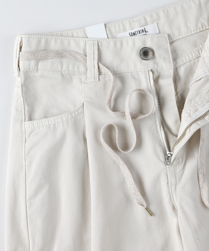 夏の装いに抜け感を添える、クリーンな佇まい。立体タックとカーブシルエットで、美しく体型カバー。ドライな肌触りが心地よい、大人のリラックスパンツ。■Point・立体感を生み出すフロントタックウエストに施されたタック仕様。腰回りにゆとりと立体感をプラス。気になる部分を自然にカバーします。・美脚を叶えるカーブシルエット裾にかけて丸みを帯びたライン。脚のラインを拾わずすっきり見え。体型カバーとこなれ感を両立します。・夏も快適なライトウエイトツイル6ozの軽やかな綿100%素材。肌にまとわりつかないドライな質感。汗ばむ季節もさらりと快適に過ごせます。・着こなしのアクセントになる平紐ウエストのドローストリングがポイント。トップスインした際のおしゃれな目印に。お好みのフィット感に調整も可能です。・清潔感漂うエクリュカラー明るく柔らかなオフホワイト系の色合い。夏のスタイリングに爽やかな抜け感をプラス。どんなトップスとも相性抜群です。・女性の美しさを追求したパターンブランドならではの計算された設計。ラフになりすぎない洗練されたバランス。大人の日常着にふさわしい一枚です。【仕様】フロントに施されたタックが立体感を生み出す、カーブシルエットのワイドパンツ。ウエストからヒップへのゆとりと、裾に向かって絞られる曲線的なパターンが、気になる部分を自然にカモフラージュします。ウエストのドロスト紐がさりげないアクセントになり、見た目の可愛さと体型カバーを両立した洗練されたデザインです。【素材】6オンスのライトウエイトな綿100%ツイル素材を採用しています。肌に触れてもベタつきにくい、さらさらとしたドライなタッチが魅力。見た目にも明るく軽やかで、汗ばむ夏の時期でも重たくならず、一日中ストレスフリーで快適な穿き心地をキープしてくれる頼もしい素材です。【スタイリング】クリーンなキナリカラーのパンツには、黒やネイビーのトップスを合わせた大人のモノトーンコーデがおすすめ。コンパクトなTシャツをタックインすれば、ウエストのディテールが際立ちスタイルアップ効果も。足元はスニーカーでカジュアルに、華奢なサンダルで上品にと、幅広いスタイリングが楽しめます。【SOMETHING】女性のためのジーンズとして1979年に誕生以来、「女の子はかならずきれいになる。」をコンセプトに国内生産を中心にしたモノづくりでどこから見ても美しい、日本の女性のためのジーンズを追求し、進化し続けています。シンプルでミニマルな、ホンモノの美しさを探求しています。