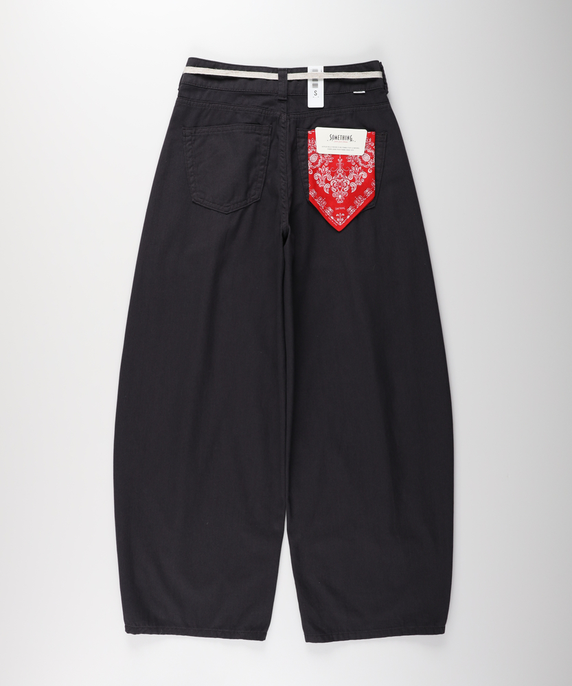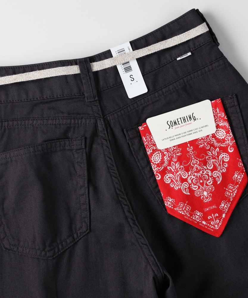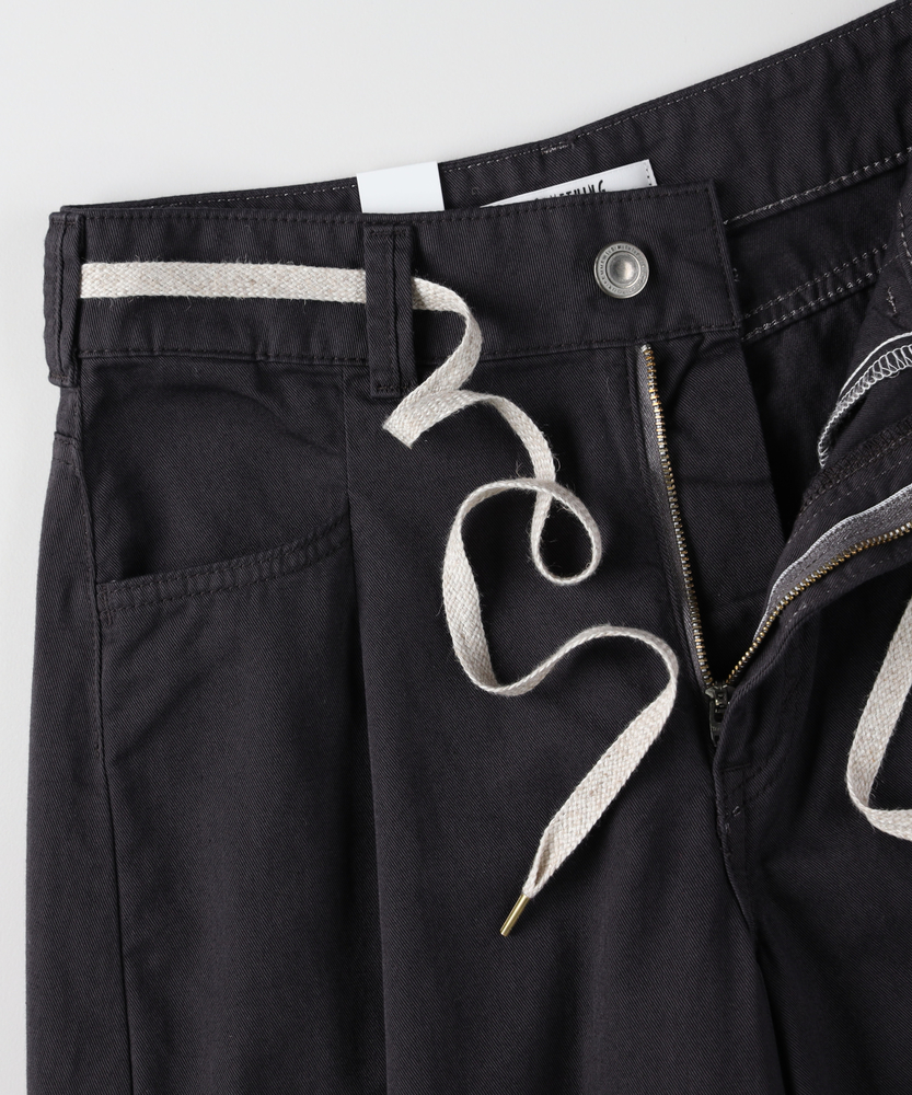 夏のカジュアルを格上げする、シックな装い。立体タックとカーブシルエットで、美しく体型カバー。ドライな肌触りが心地よい、大人のリラックスパンツ。■Point・立体感を生み出すフロントタックウエストに施されたタック仕様。腰回りにゆとりと立体感をプラス。気になる部分を自然にカバーします。・美脚を叶えるカーブシルエット裾にかけて丸みを帯びたライン。脚のラインを拾わずすっきり見え。体型カバーとこなれ感を両立します。・夏も快適なライトウエイトツイル6ozの軽やかな綿100%素材。肌にまとわりつかないドライな質感。汗ばむ季節もさらりと快適に過ごせます。・着こなしのアクセントになる平紐ウエストのドローストリングがポイント。トップスインした際のおしゃれな目印に。お好みのフィット感に調整も可能です。・洗練されたシックなダークカラー深みのある落ち着いたトーンの色合い。カジュアルダウンしすぎず上品な印象に。どんなトップスとも相性抜群です。・女性の美しさを追求したパターンブランドならではの計算された設計。ラフになりすぎない洗練されたバランス。大人の日常着にふさわしい一枚です。【仕様】フロントに施されたタックが立体感を生み出す、カーブシルエットのワイドパンツ。ウエストからヒップへのゆとりと、裾に向かって絞られる曲線的なパターンが、気になる部分を自然にカモフラージュします。ウエストのドロスト紐がさりげないアクセントになり、見た目の可愛さと体型カバーを両立した洗練されたデザインです。【素材】6オンスのライトウエイトな綿100%ツイル素材を採用しています。肌に触れてもベタつきにくい、さらさらとしたドライなタッチが魅力。見た目にも軽やかで、汗ばむ夏の時期でも重たくならず、一日中ストレスフリーで快適な穿き心地をキープしてくれる頼もしい素材です。【スタイリング】シックなダークカラーのパンツには、白や鮮やかなカラートップスを合わせてコントラストを効かせると都会的な印象に。コンパクトなカットソーをタックインすれば、ウエストのタックと紐が際立ち、スタイルアップ効果が高まります。足元はスニーカーでカジュアルに、華奢なサンダルで上品にと、幅広いスタイリングが楽しめます。【SOMETHING】女性のためのジーンズとして1979年に誕生以来、「女の子はかならずきれいになる。」をコンセプトに国内生産を中心にしたモノづくりでどこから見ても美しい、日本の女性のためのジーンズを追求し、進化し続けています。シンプルでミニマルな、ホンモノの美しさを探求しています。