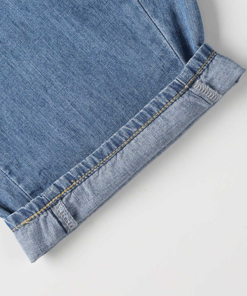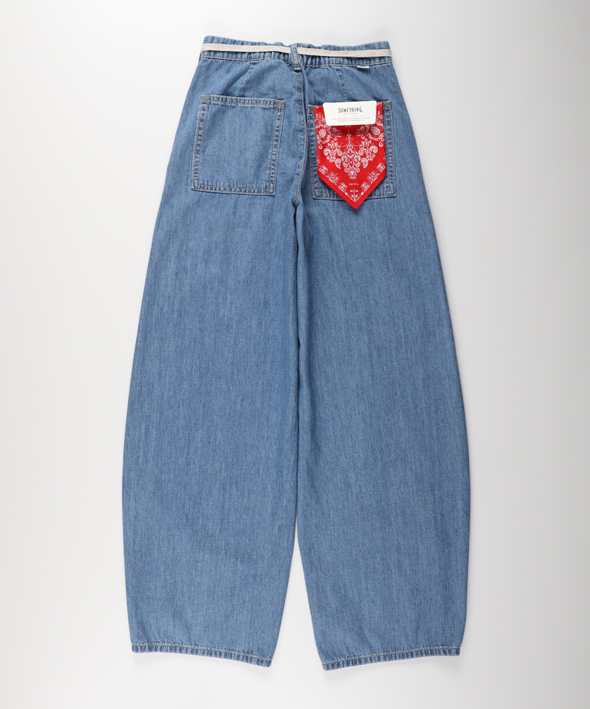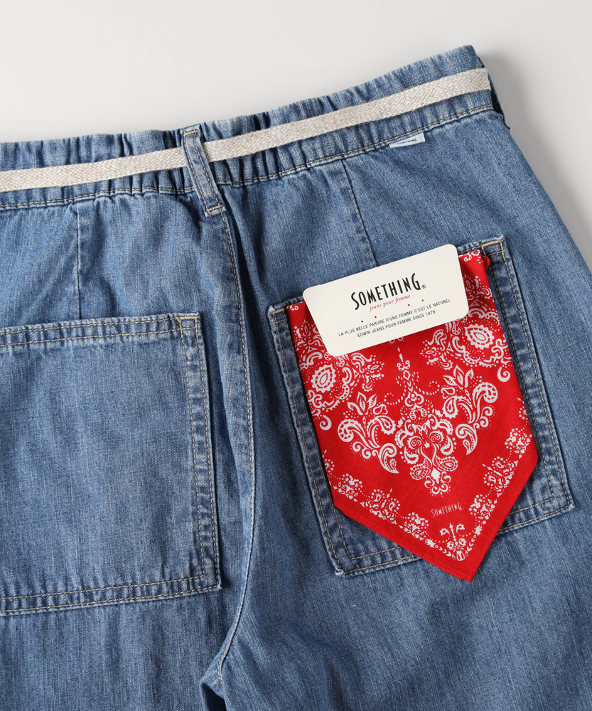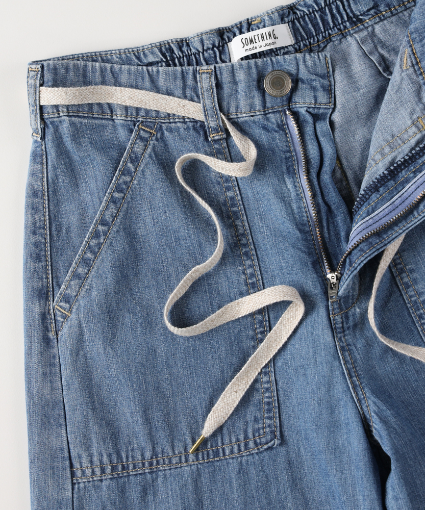 夏の暑さも味方につける、軽やかな穿き心地。体型を美しくカバーする洗練カーブシルエット。大人のサマーカジュアル。■Point・気になるラインを覆うカーブシルエットややゆとりのあるワイドなフォルム。裾にかけて絞るラインですっきり見え。脚のラインを拾わず美しくカバーします。・腰回りを自然に隠すベイカーポケット大きめのフロントポケットがアクセント。気になる腰回りや太ももを視覚的にカバー。実用性とスタイルアップを両立します。・夏も快適なライトウエイトデニム6.5ozの軽やかな綿100%デニムを使用。汗ばむ季節もさらりとした肌触り。一日中ベタつかず快適に過ごせます。・窮屈感ゼロのストレスフリーなウエスト腰裏に施されたゴムが優しくフィット。締め付け感のない楽な穿き心地を実現。長時間の着用でもリラックスできます。・着こなしのポイントになるドロスト紐ウエストの平紐がカジュアルなアクセント。トップスインした際のおしゃれなポイントに。お好みのフィット感に調整も可能です。・爽やかさを引き立てる淡色ブルームラ糸の加工映えが美しいライトブルー。春夏らしい涼しげで軽快な印象を与えます。大人のカジュアルスタイルにぴったりです。【仕様】女性の体型を美しく見せるために計算された、丸みを帯びたカーブシルエットが魅力のワイドパンツ。ゆったりとしながらも裾に向かって細くなる設計で、ラフになりすぎない洗練されたバランスを実現しました。フロントのベイカーポケットが腰周りを自然にカバーし、ウエストのドロスト紐が着こなしのさりげないアクセントとして活躍します。【素材】6.5オンスのライトウエイトな綿100%デニムを採用しています。細番手でありながらも、メリハリのあるムラ糸が爽やかな色落ち感を演出。肌に触れてもベタつきにくいさらさらとした質感が特徴です。汗ばむ季節でも重たくならず、一日中ストレスフリーで快適な穿き心地をキープしてくれる頼もしい素材です。【スタイリング】爽やかなライトブルーのデニムには、クリーンな白Tシャツやリネンシャツを合わせて涼しげにまとめるのがおすすめ。コンパクトなトップスをタックインすれば、ウエストの紐が際立ちスタイルアップ効果も高まります。足元はスニーカーでアクティブに、華奢なサンダルで女性らしい抜け感をプラスしても素敵に決まります。【SOMETHING】女性のためのジーンズとして1979年に誕生以来、「女の子はかならずきれいになる。」をコンセプトに国内生産を中心にしたモノづくりでどこから見ても美しい、日本の女性のためのジーンズを追求し、進化し続けています。シンプルでミニマルな、ホンモノの美しさを探求しています。