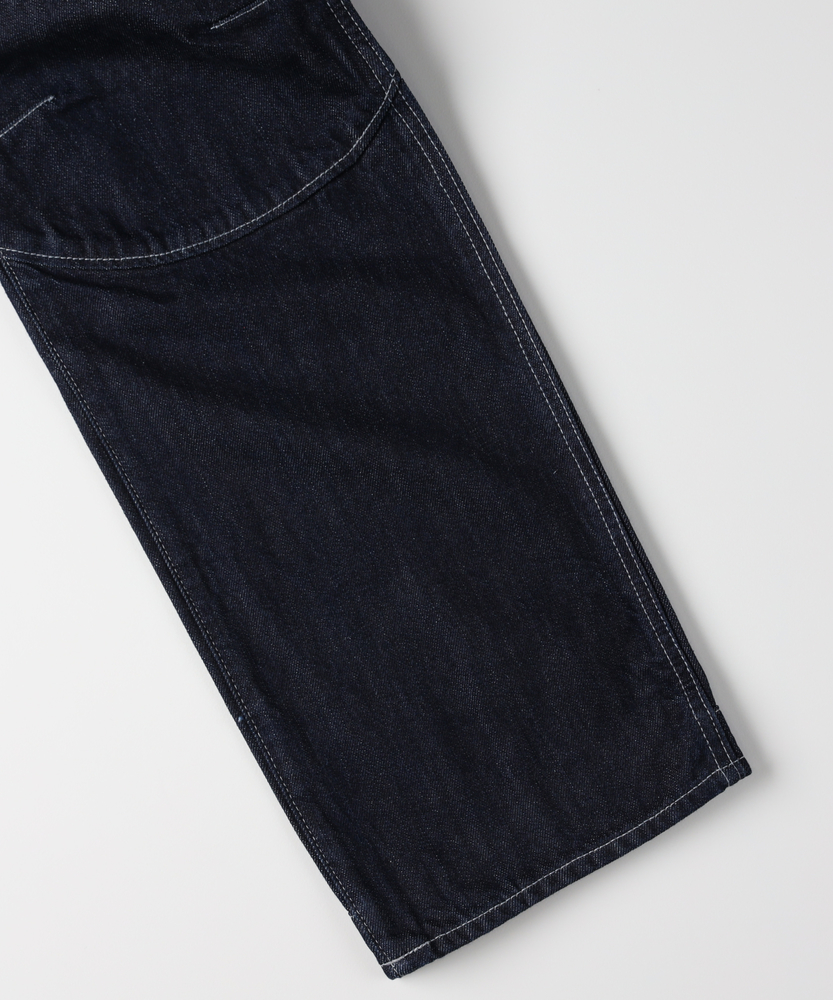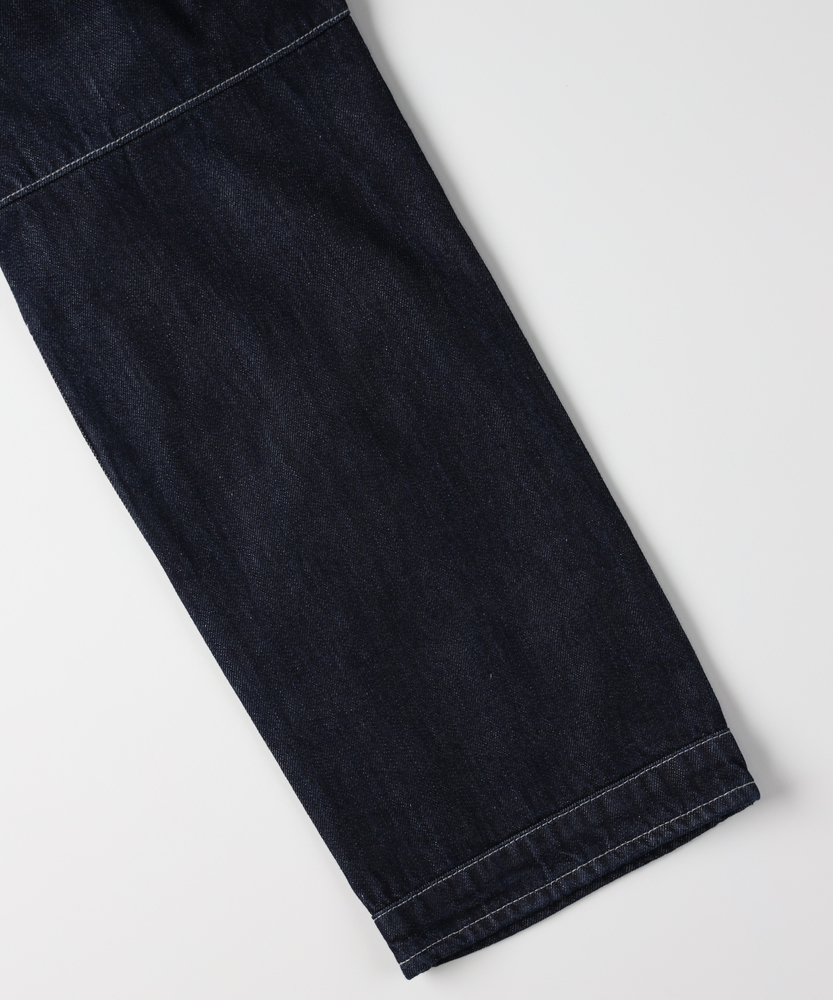 【仕様】ワーク由来の切替とアーティキュレートした膝パネルが印象的なレギュラーフィット。ミッドライズで腰回りはすっきり収まり、5ポケットやベルトループなど定番の機能性を備えつつ、コントラストステッチで端正な表情に仕上げています。【素材】 目の詰まったローデニムを用い、程よいコシと張りでシルエットを保持。着込むほどに表情が増す特性があり、日常使いでの耐久性と経年変化による独自の風合いを楽しめます。 【スタイリング】 クリーンな白Tやオックスフォードシャツにレザーコートやミリタリージャケットを合わせ、ブーツやレザースニーカーでまとめるのがおすすめ。裾を軽くロールしてボリュームを調整すると都会的で洗練された印象に。