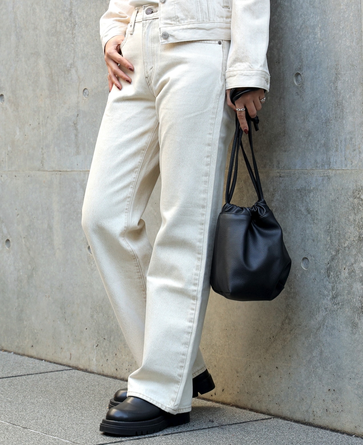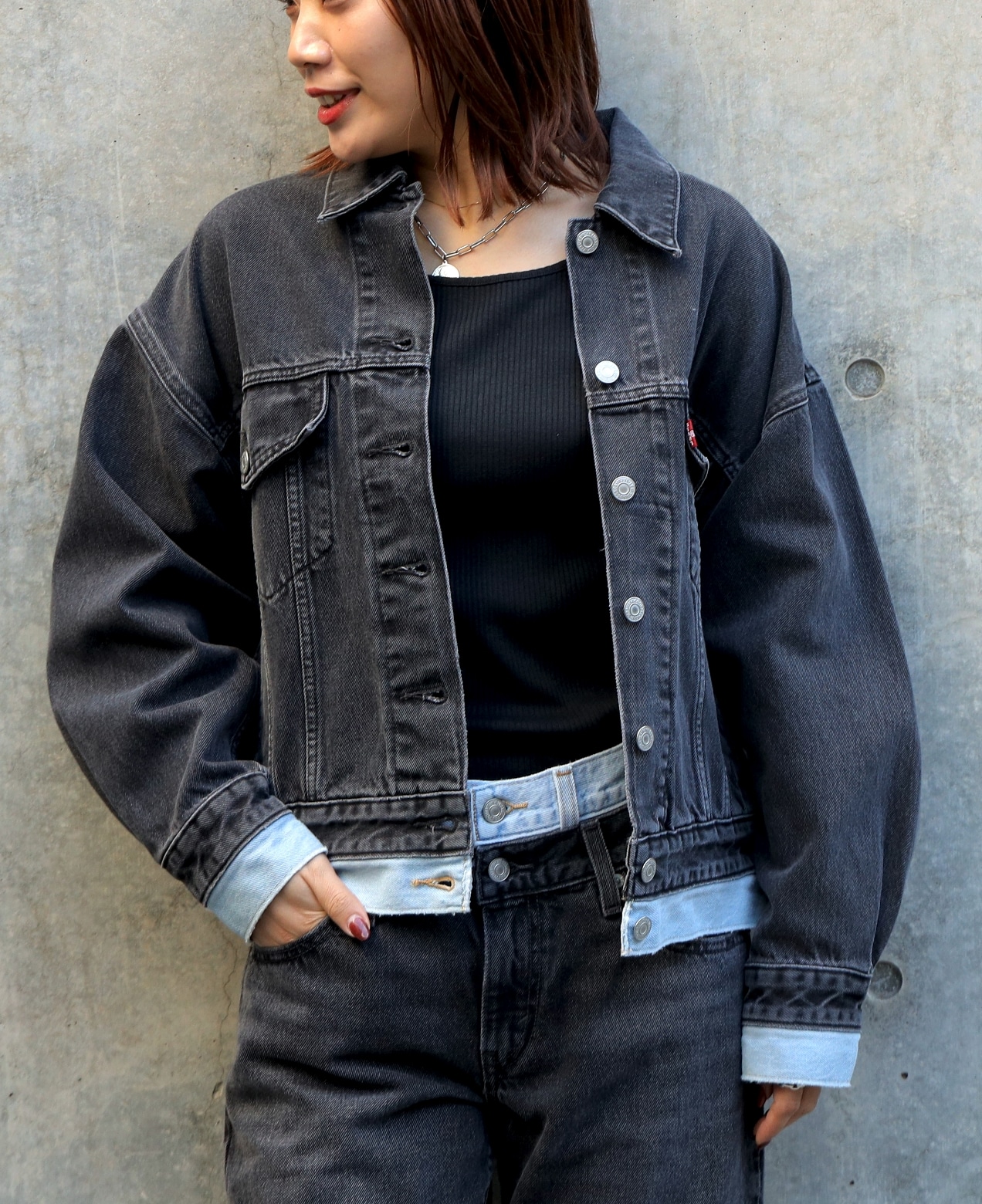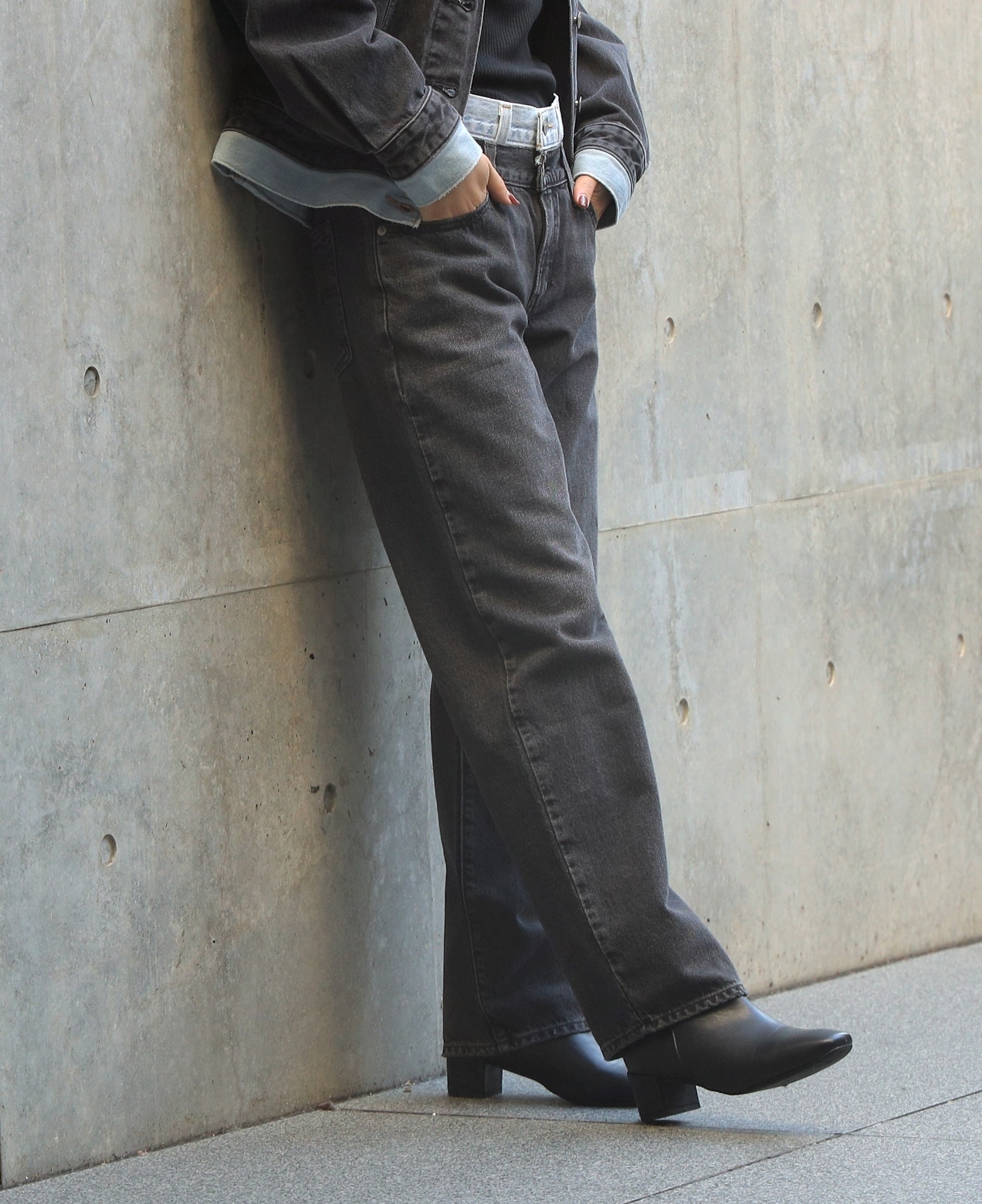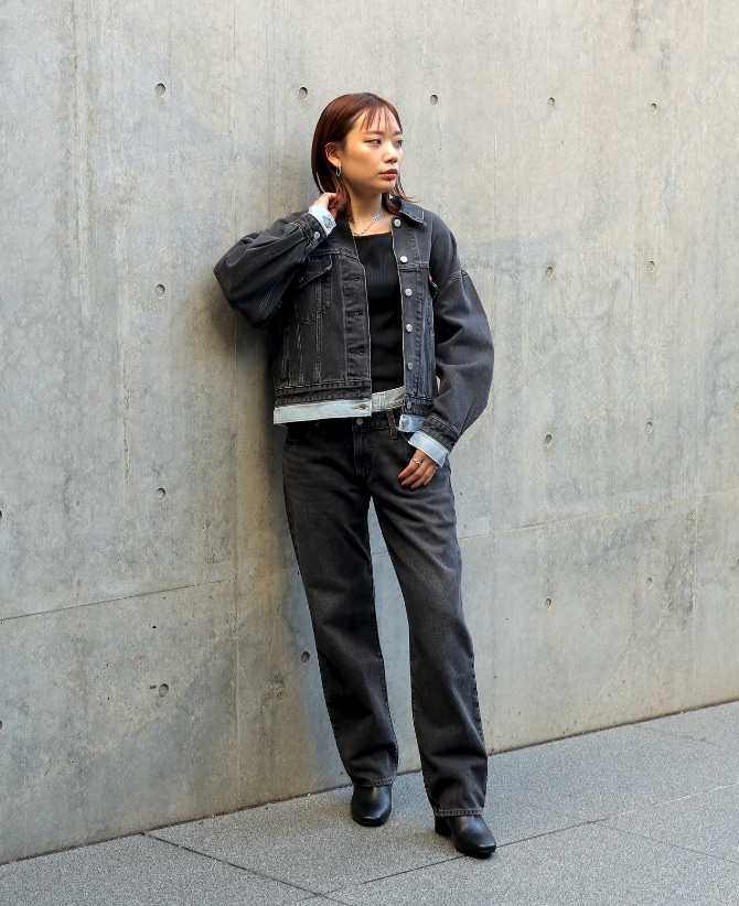 ●トレンドのブラックデニムはセットアップで着用することで全体が引き締まった印象に