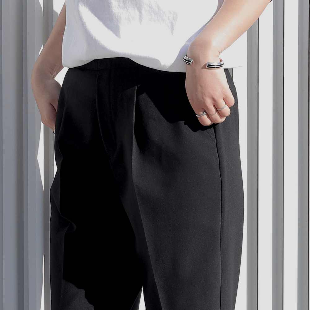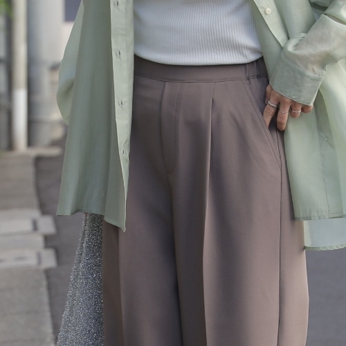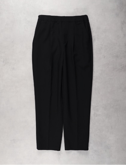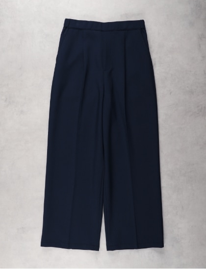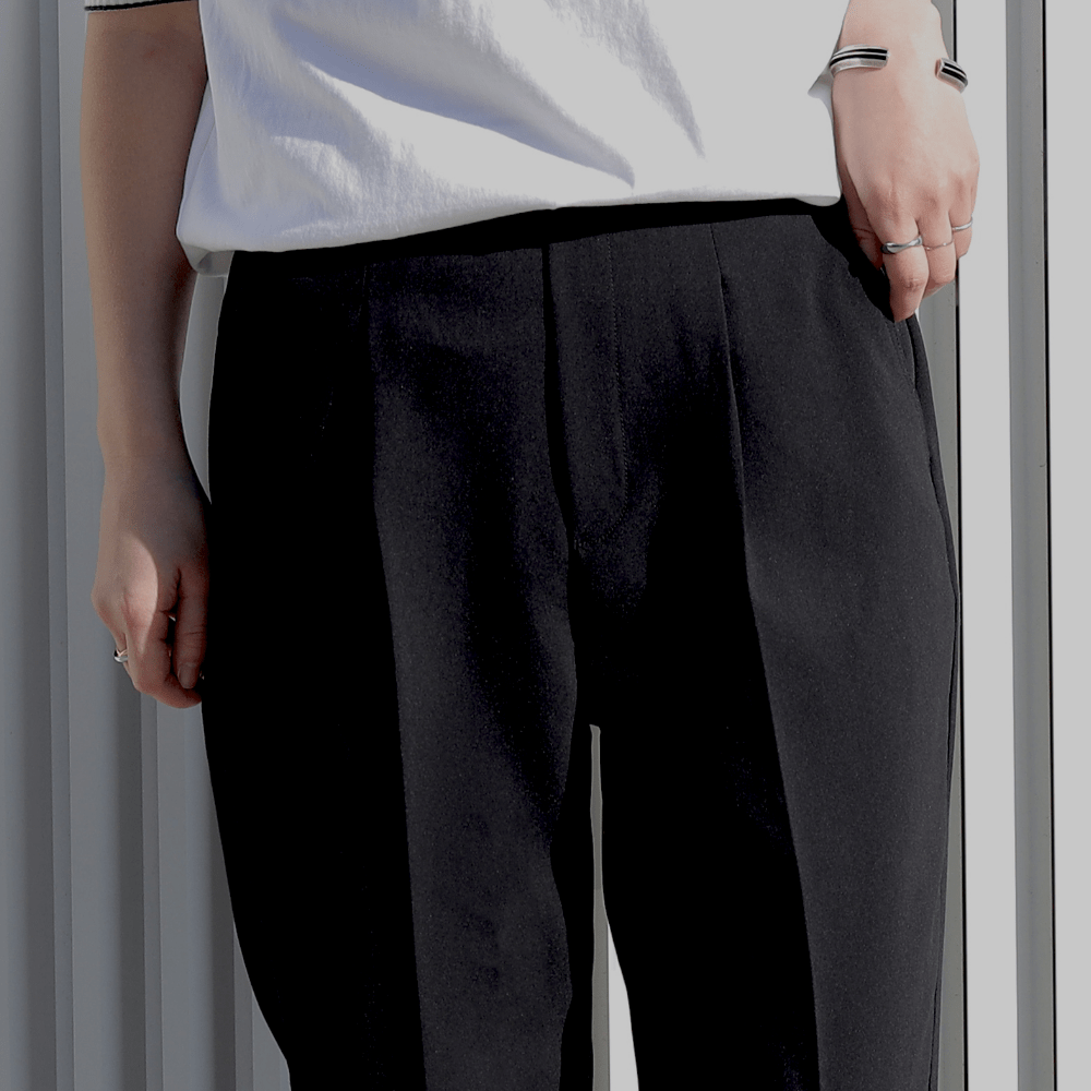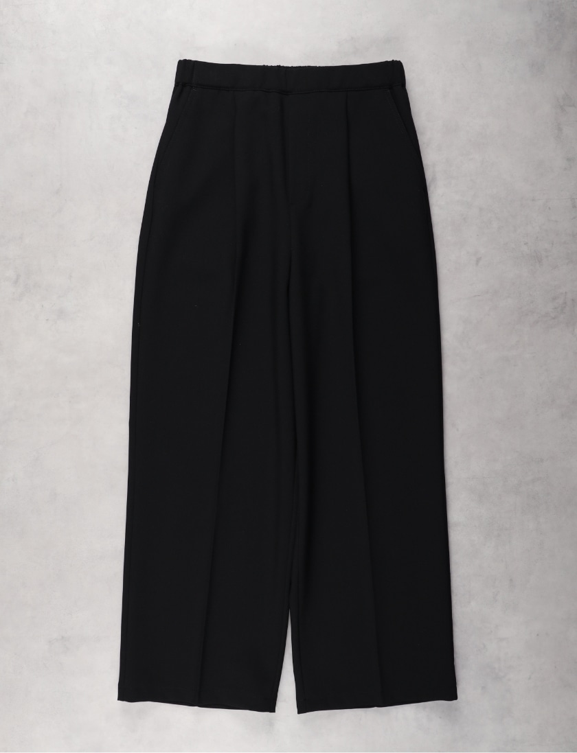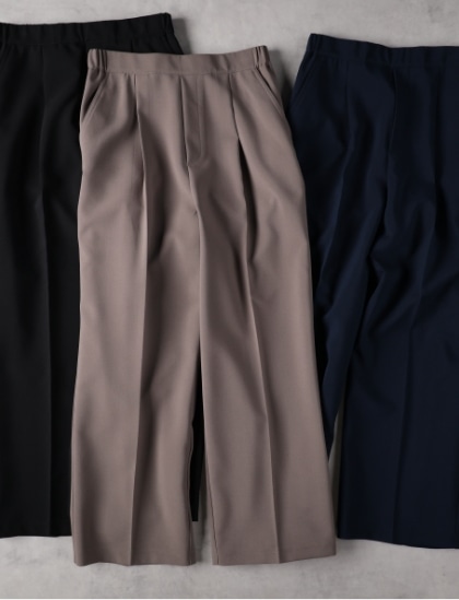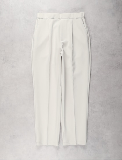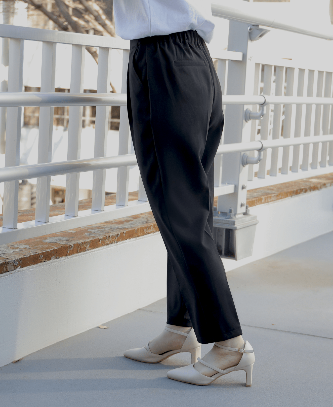 タック入りで、動きやすさとシルエットの美しさを両立。タックが開きにくい設計で、崩れにくくすっきりとした印象をキープ。ウエストはゴム仕様ながらギャザーが寄らず、着脱時には心地よく伸びて体にフィット。生地に自然に追従し、快適な穿き心地とスマートなシルエットを叶えます。