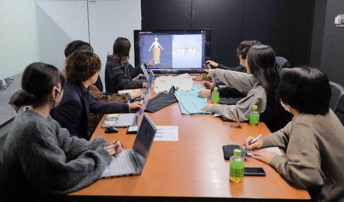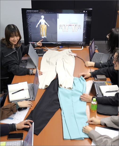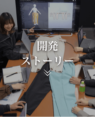 開発チームが画面を囲み、データをもとに議論を重ね、ベストなバランスを導き出します。さらに、実際のフィッティングで素材のなじみや動きやすさをチェック。3Dだけでは見えない細かなディテールを実物で確認しながら、穿き心地とシルエットを完璧に仕上げました。