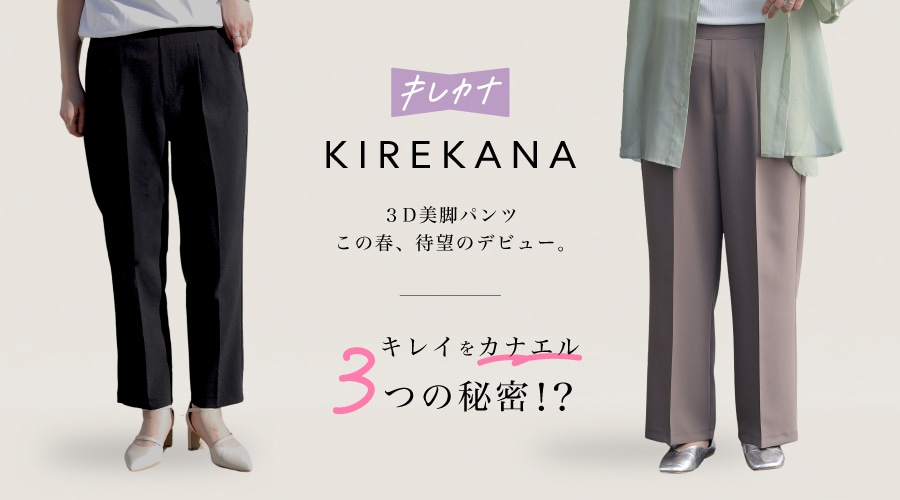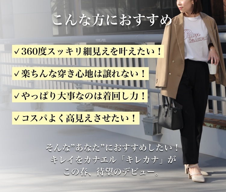 「キレカナ」は、忙しい毎日を送る女性が、簡単におしゃれを楽しんでほしいという想いから生まれました。ライフステージの変化や日々の忙しさから、フィット感や着心地の良さを重視し、スリムでありながらもリラックスできるパンツが欲しい!そんな願いを叶えた毎日を頑張る女性の味方となる一着が「キレカナ」です。
