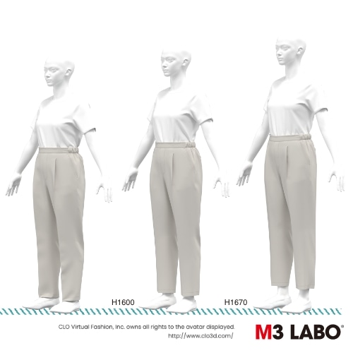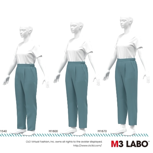 身長別の3Dアバターを使い、同じサイズのパンツを着せてシルエットを検証。154cm・160cm・167cm、それぞれの身長でもバランスよく、きれいに着られるよう調整しました。丈の長さやシルエットが適切か、ウエストやヒップのフィット感は快適かをチェックし、たくさんの方が美しく穿けるよう仕上げています。