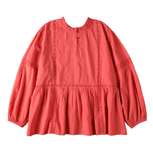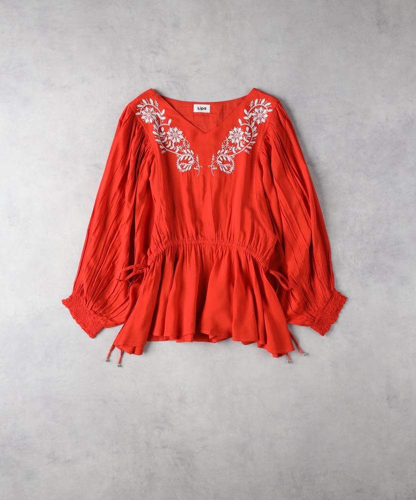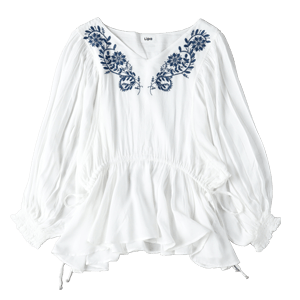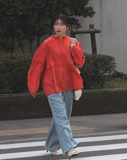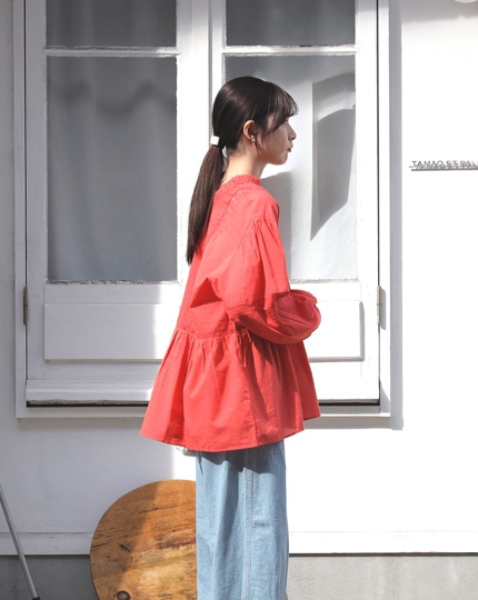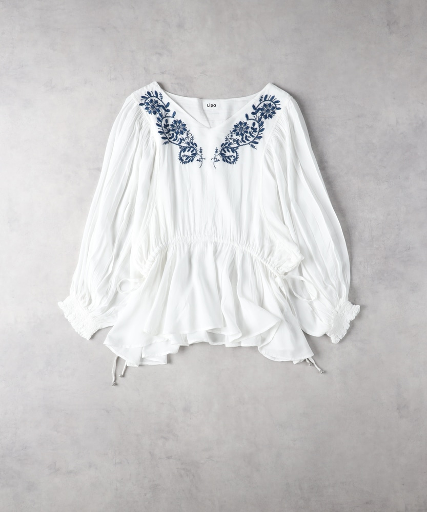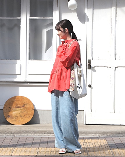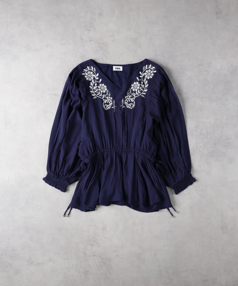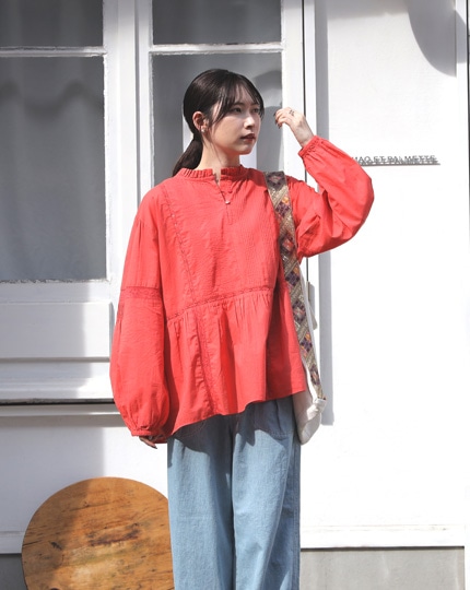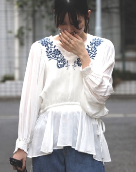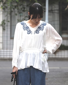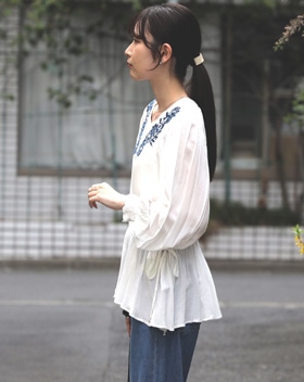 ウエストの絞りや袖のボリューム感、Vネックの胸元など女性らしい形を落とし込んでいますが、インド刺繍ならではのクラフト感、カジュアルさにより、カジュアルな方でも挑戦しやすいアイテムです。